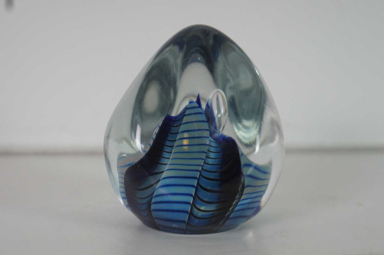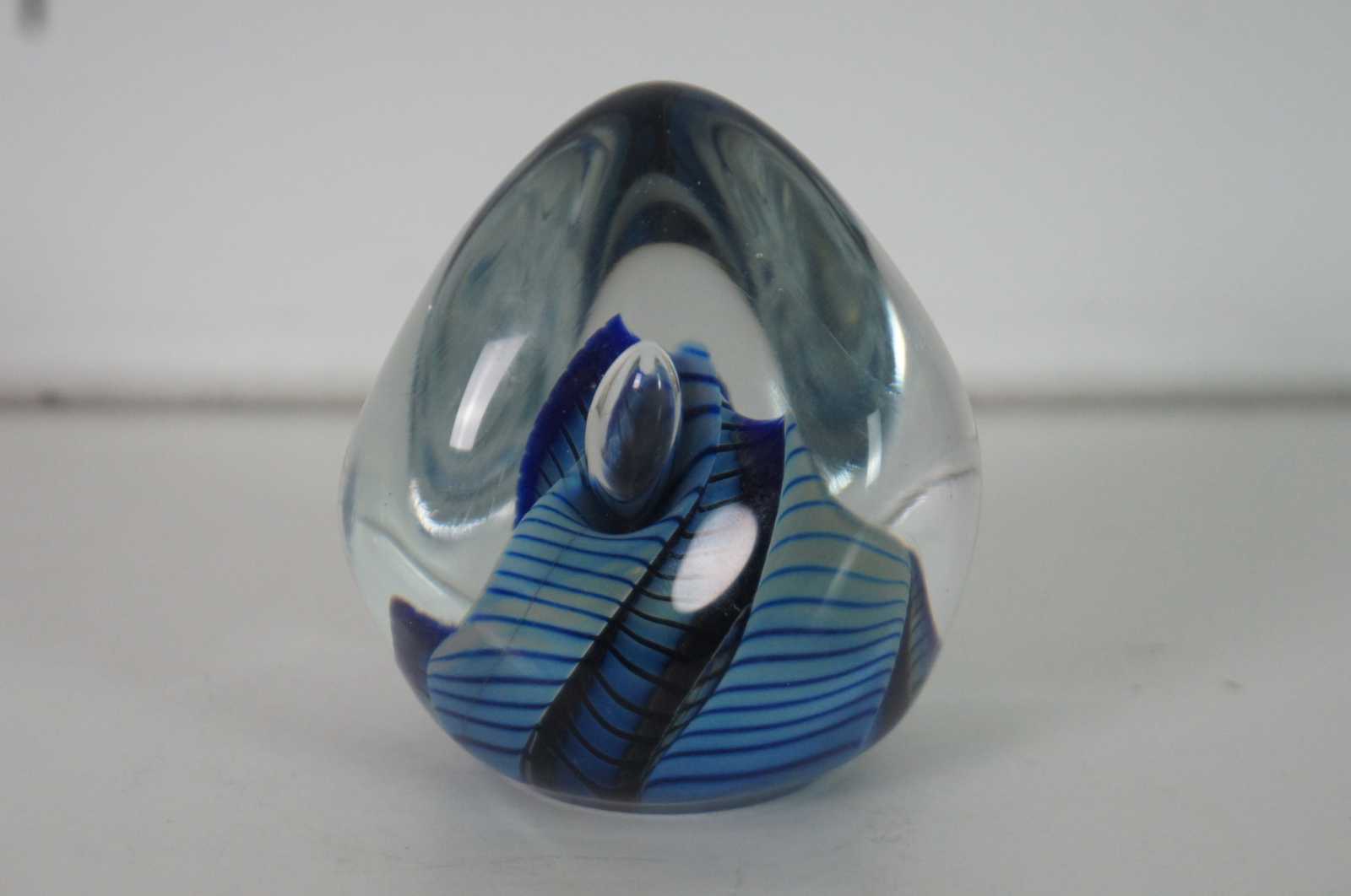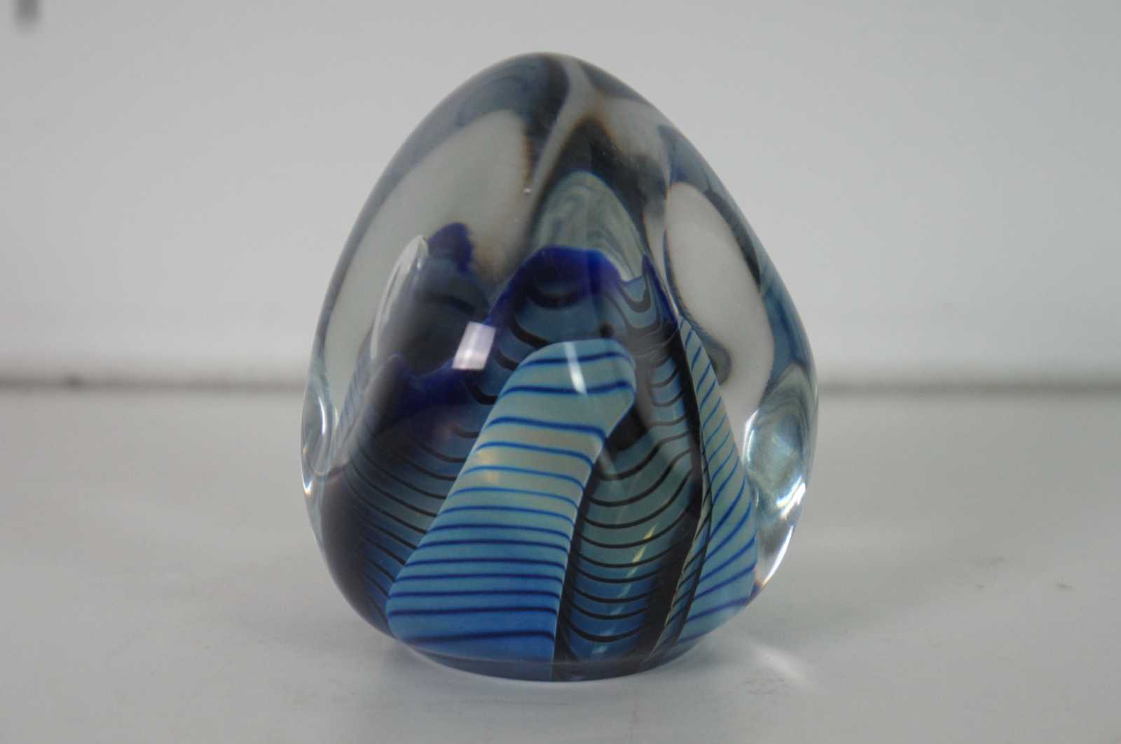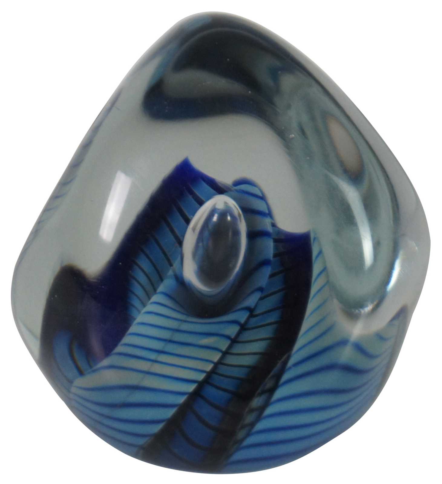 Vintage Robert Eickholt studio art glass paperweight featuring a clear abstract form filled with rippling stripes in various shades of blue and a large controlled bubble at the center. Signed and dated 1988 on base.