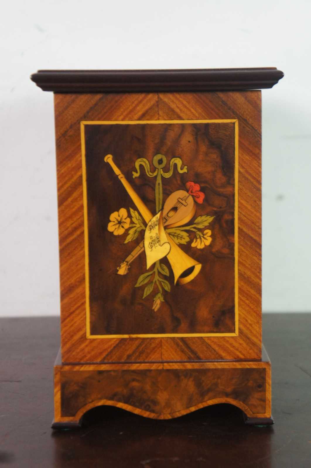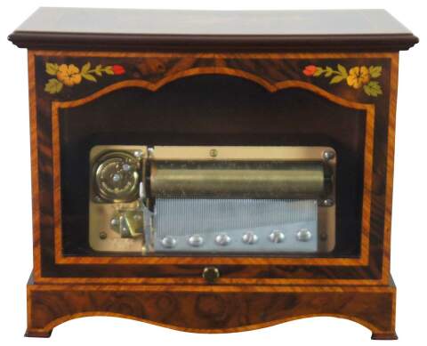 Vintage Reuge Swiss music box number 5725, displayed in a marquetry case decorated with flowers and instruments and a glass front to show the 72 note works. Key is inset on the back; top flips open for access to interior; mechanical stop included on the front.