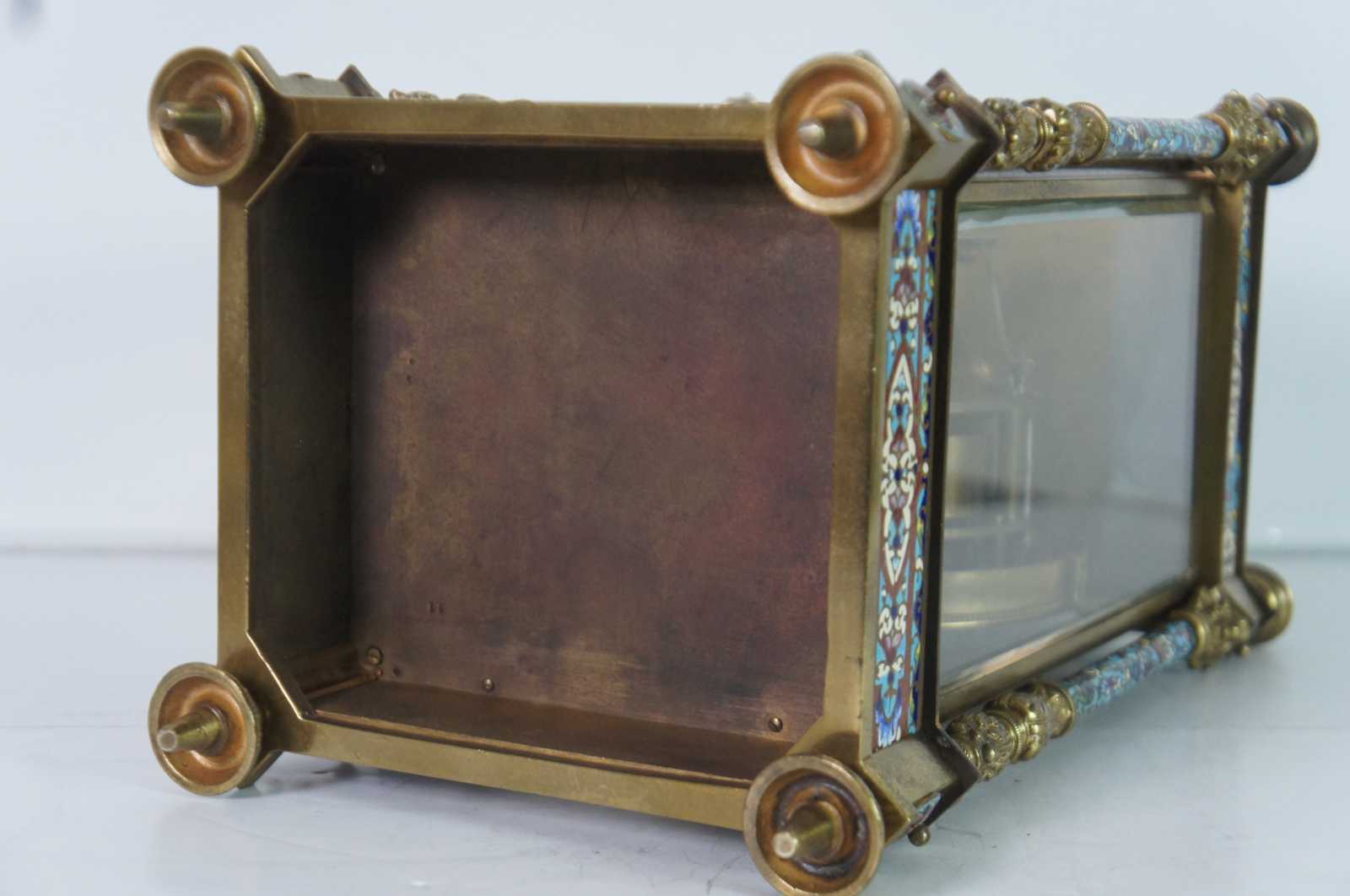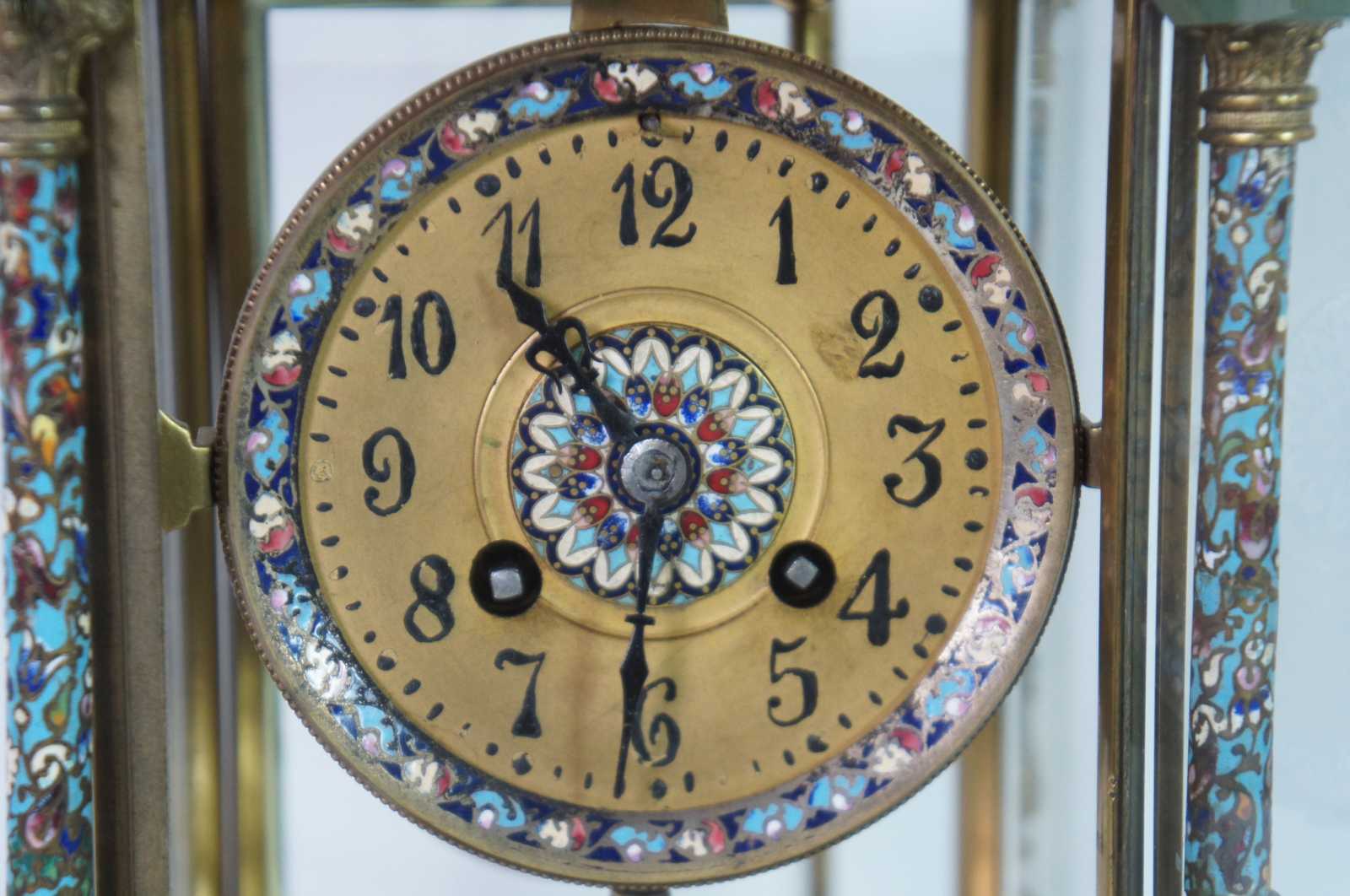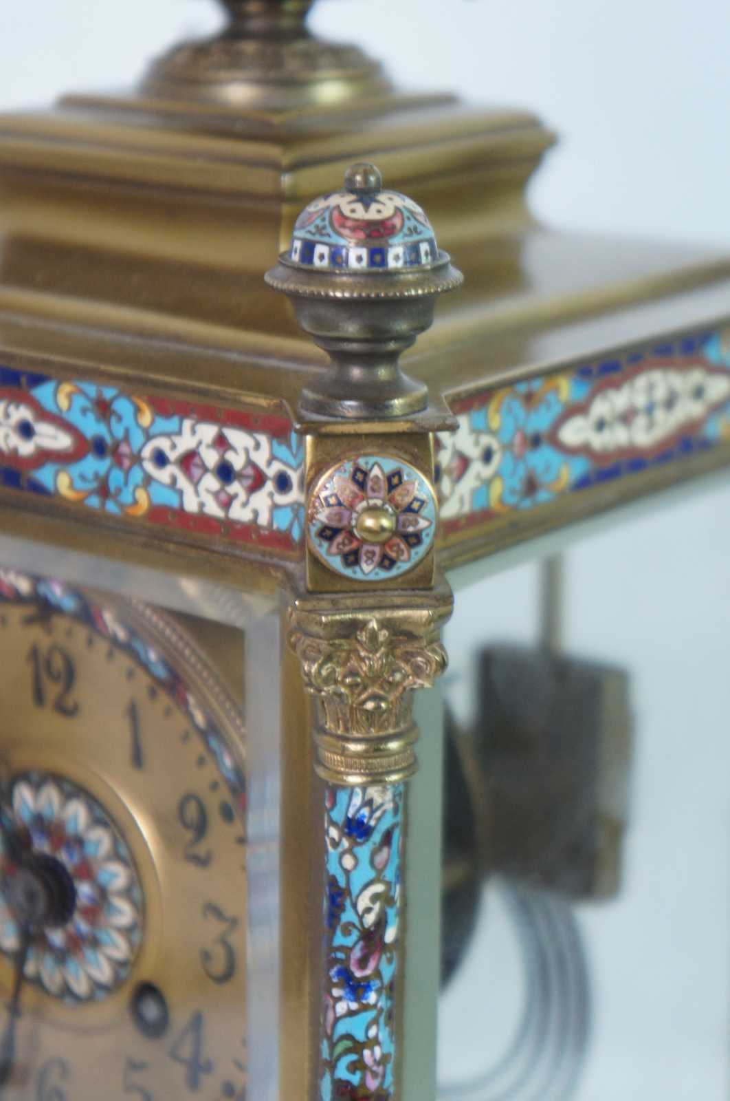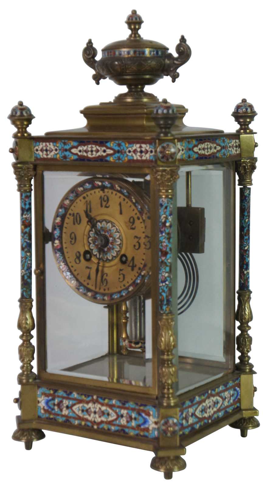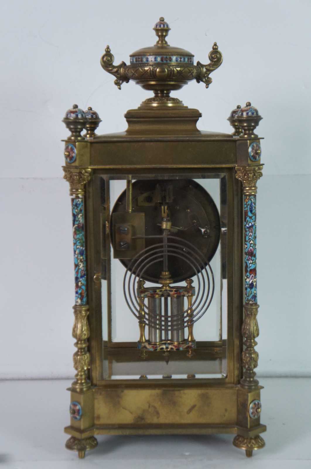 Antqiue late 19th Century French Japy Freres gilt brass enameled mantel clock featuring neoclassical styling with polychrome champleve enamel accents, four columns with spire finials, beveled glass sides and trophy vase topper. Stamped with Japy Freres Medaille D'honneur stamp. Eight day striking movement. 9470. Made in France.