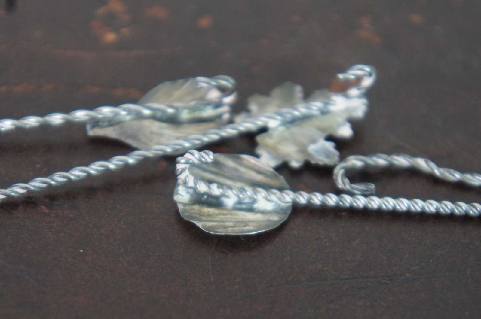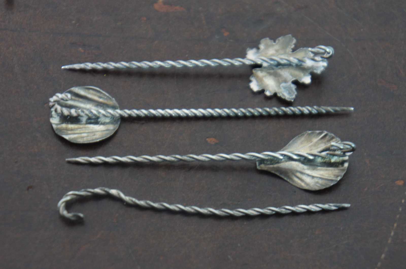 Four vintage sterling silver hors d'oeuvres cocktail picks, twisted design with shell and leaf accents.