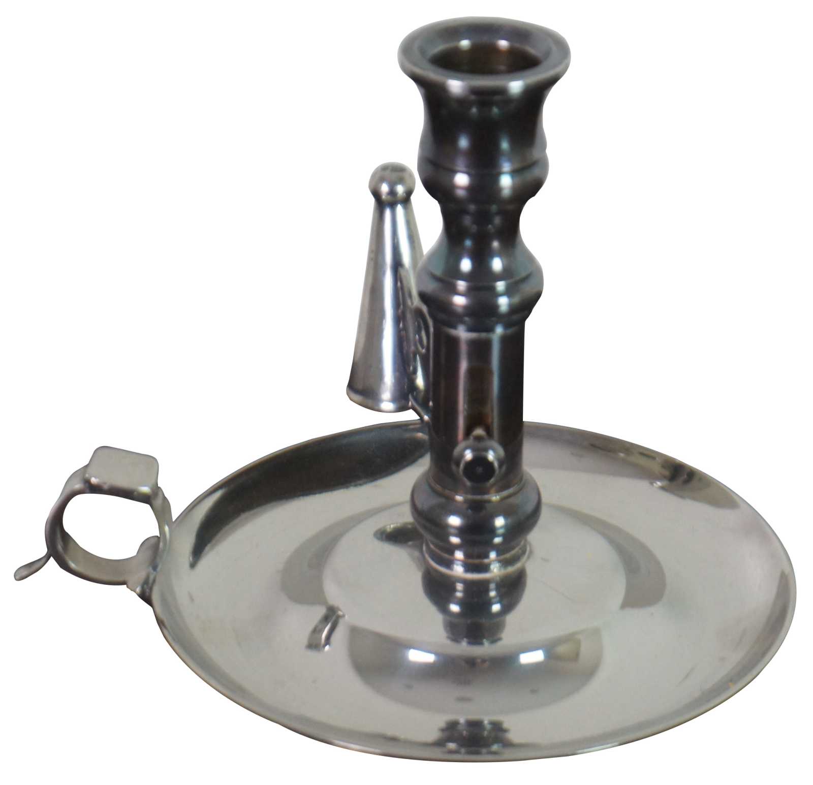 Antqiue English Georgian silver plate chamber candlestick with ring handle, snuffer, and push up mechanism to raise the candle as it burns down.