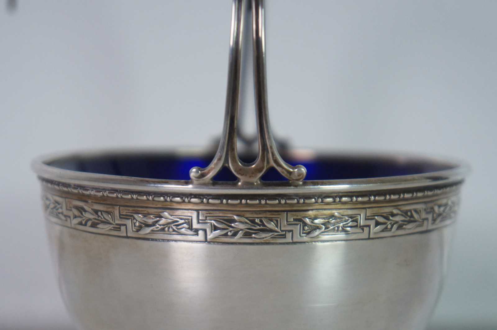 Antique Gorham sterling silver, number 103, pedestal basket with handle and cobalt blue sugar dish / bowl insert.