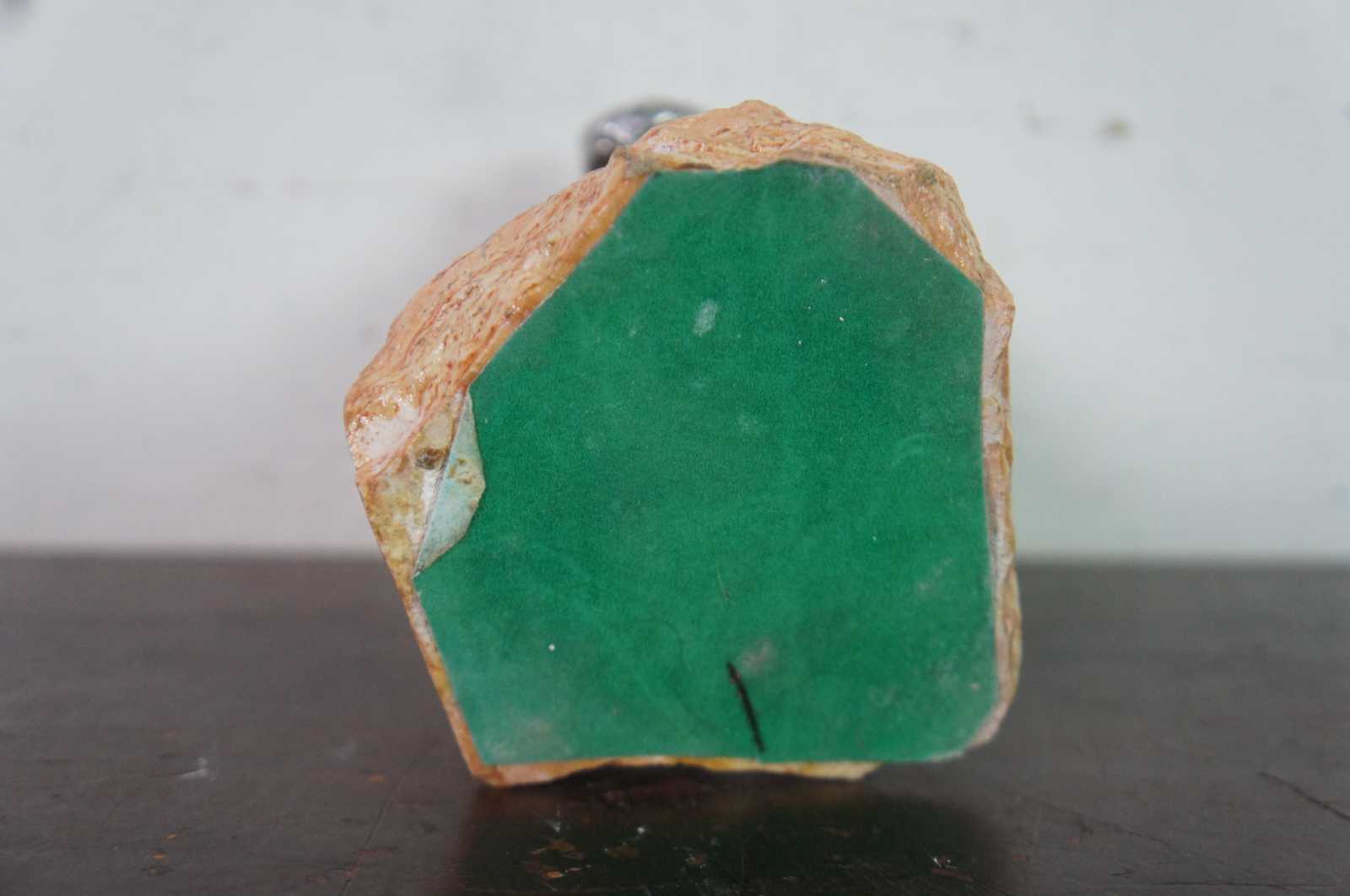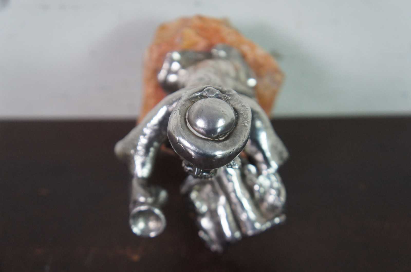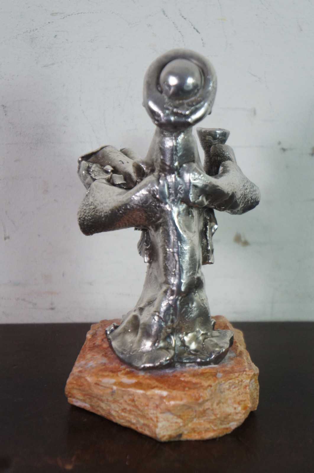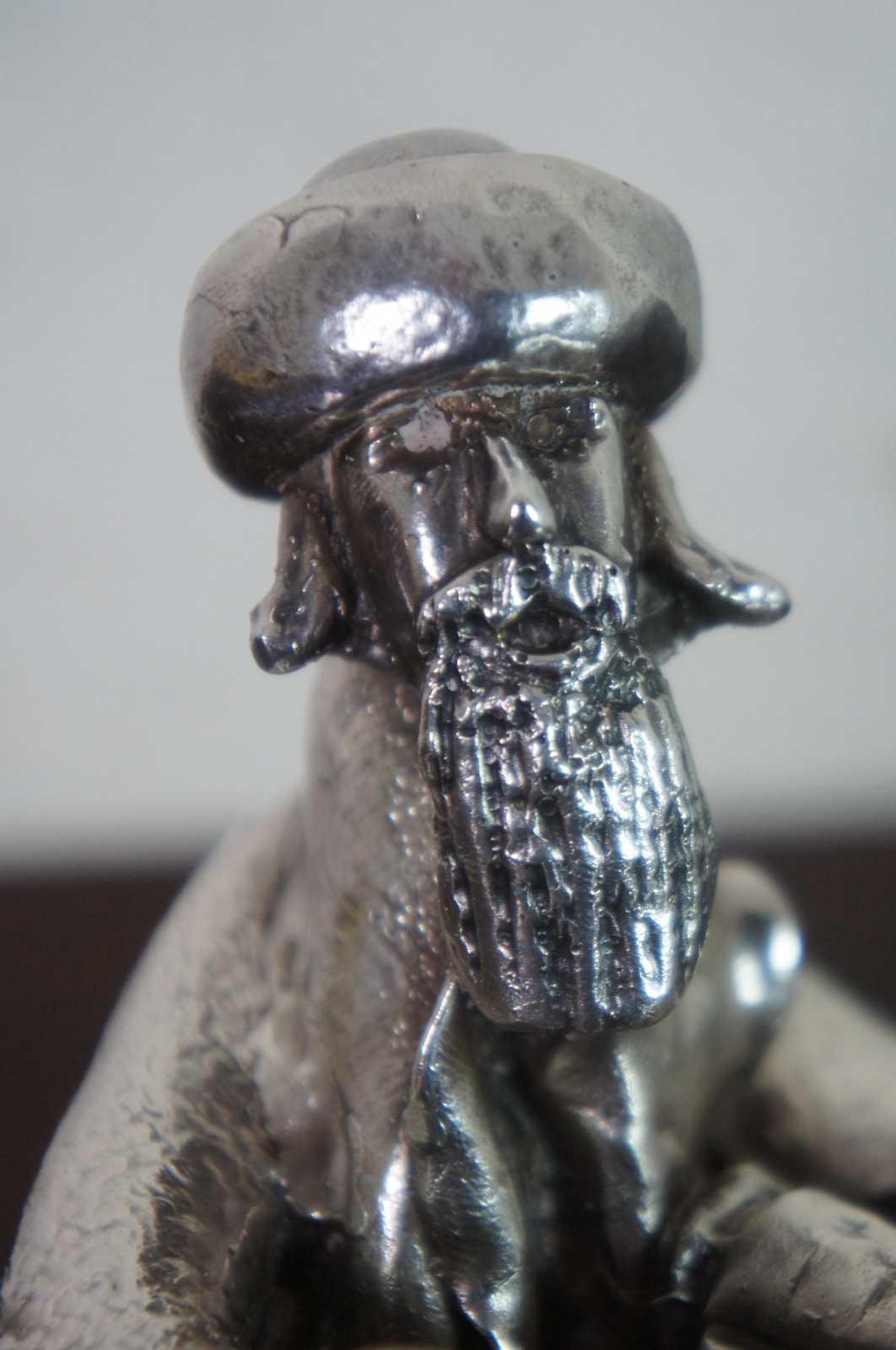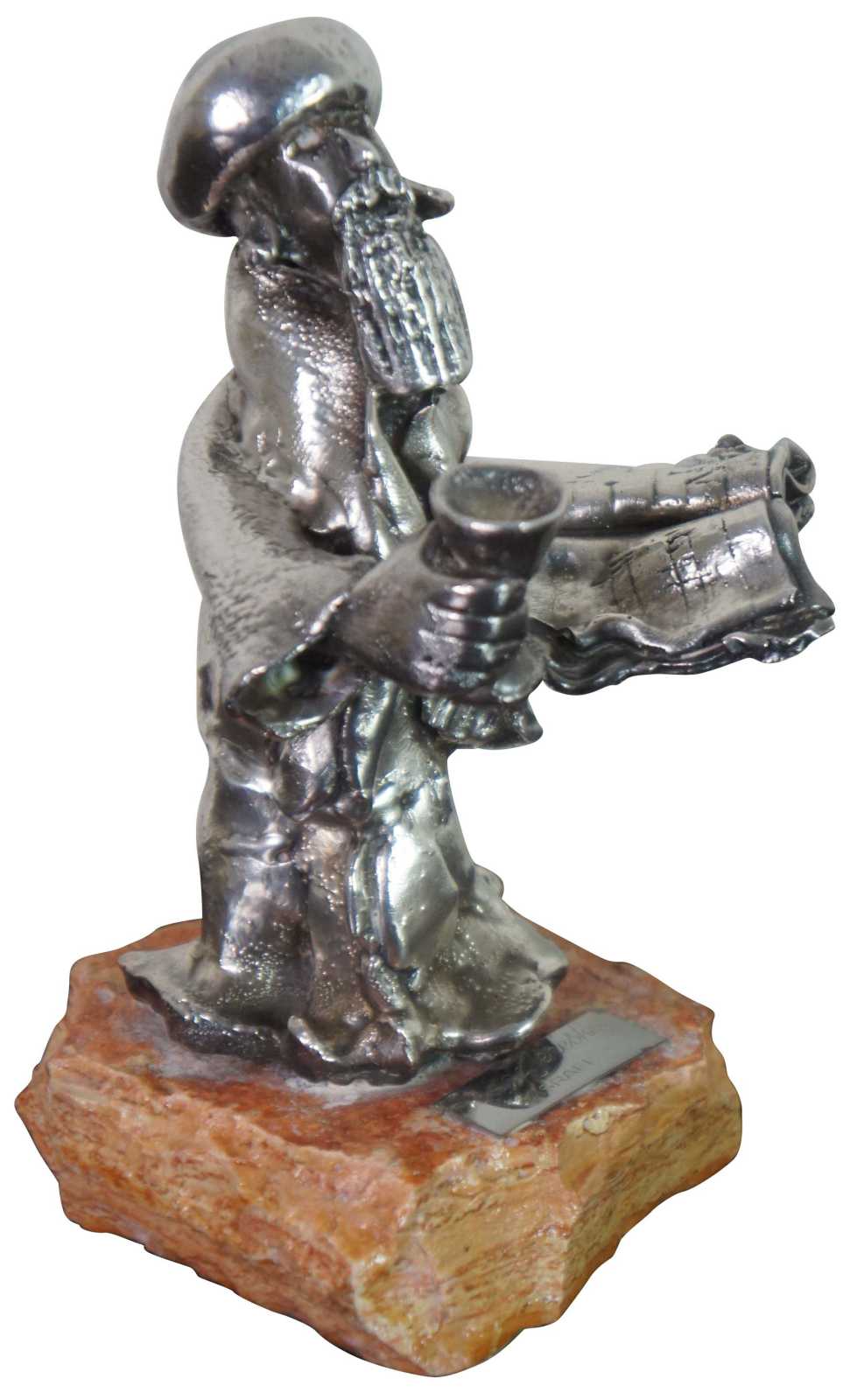 Wax and composite figurine layered in sterling silver, mounted on a natural stone base, in the shape of a Jewish rabbi holding a book and Kiddush cup. Plaque on base signed Issac Yeheskel Israel.