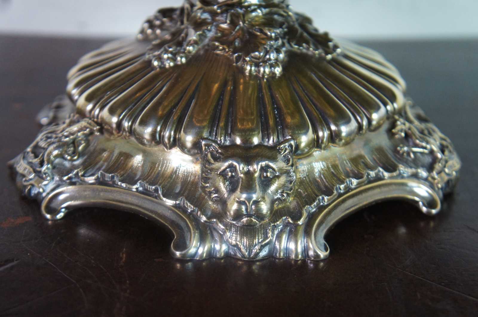 1902 antique English Edwardian sterling silver 925 footed centerpiece compote by Goldsmiths & Silversmiths Co of London. Features stamped and fluted design of grapevines with figural face of a bearded man (Dionysus) along the top and a fox / wolf / cat along the base accompanied by The Buffs badge, a winged griffon / gryphon / dragon referred to as East Kent Regimental Dragon Badge.