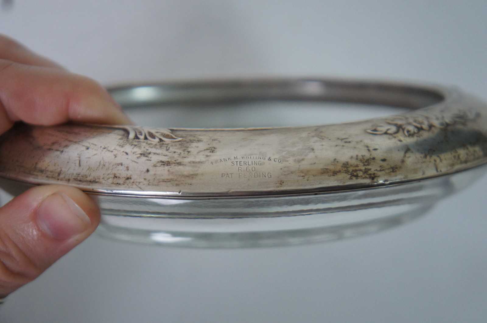 Antique Frank M. Whiting & Co cut glass and sterling silver 925 coaster / dish or ashtray, number R60, decorated with springs of flowers and leaves.