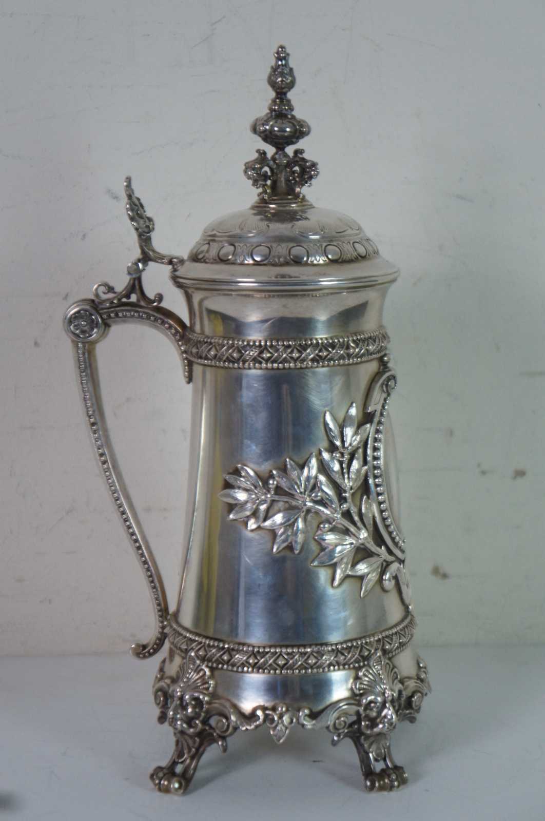 Rare antique 19th century Dutch lidded and footed 800 silver tankard / stein / pitcher, with ornate designs, faces and finial; gilded interior. Marked on base “JW 800M.”