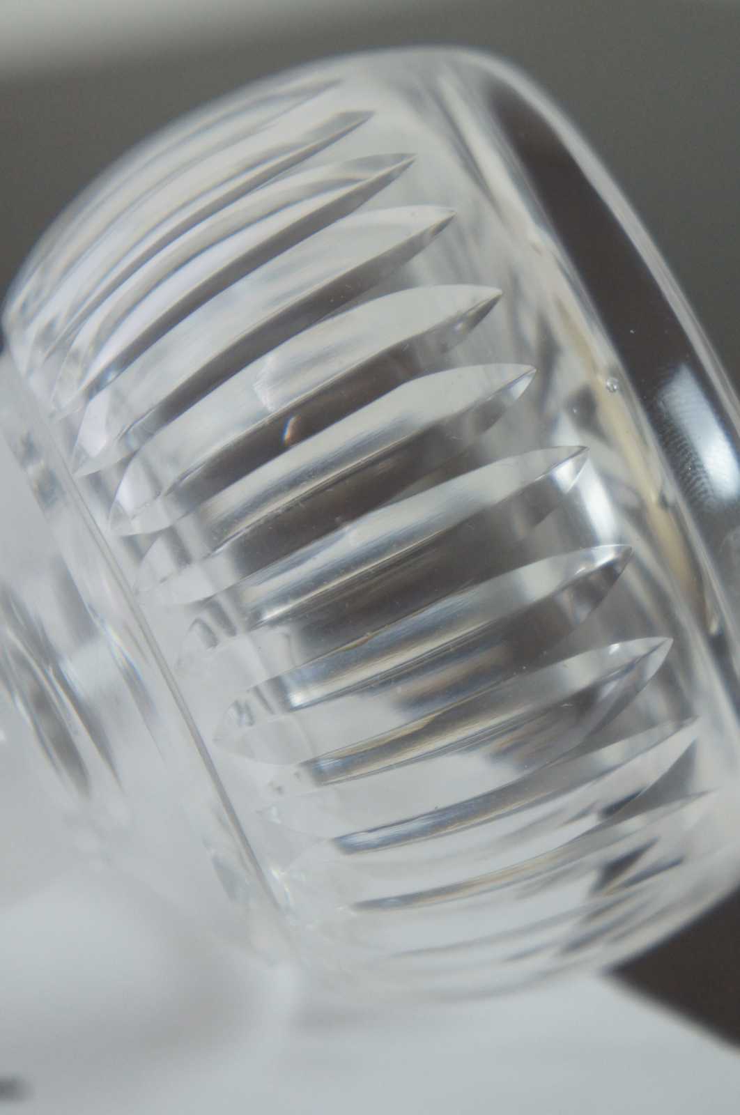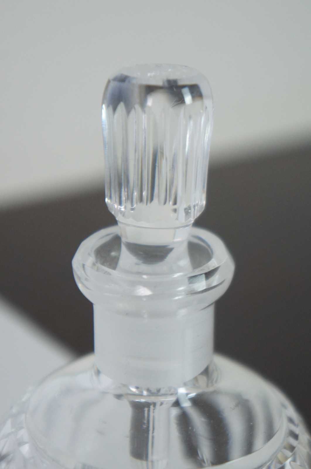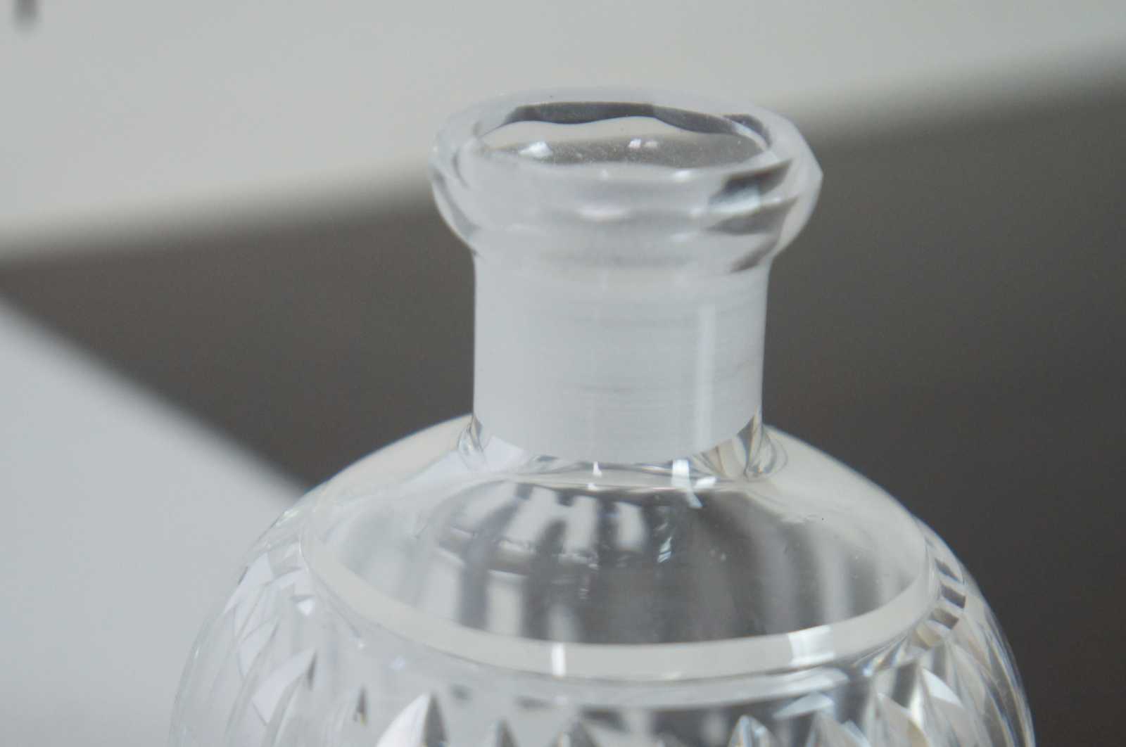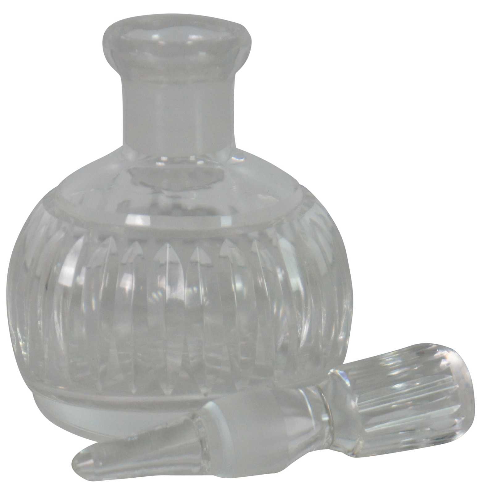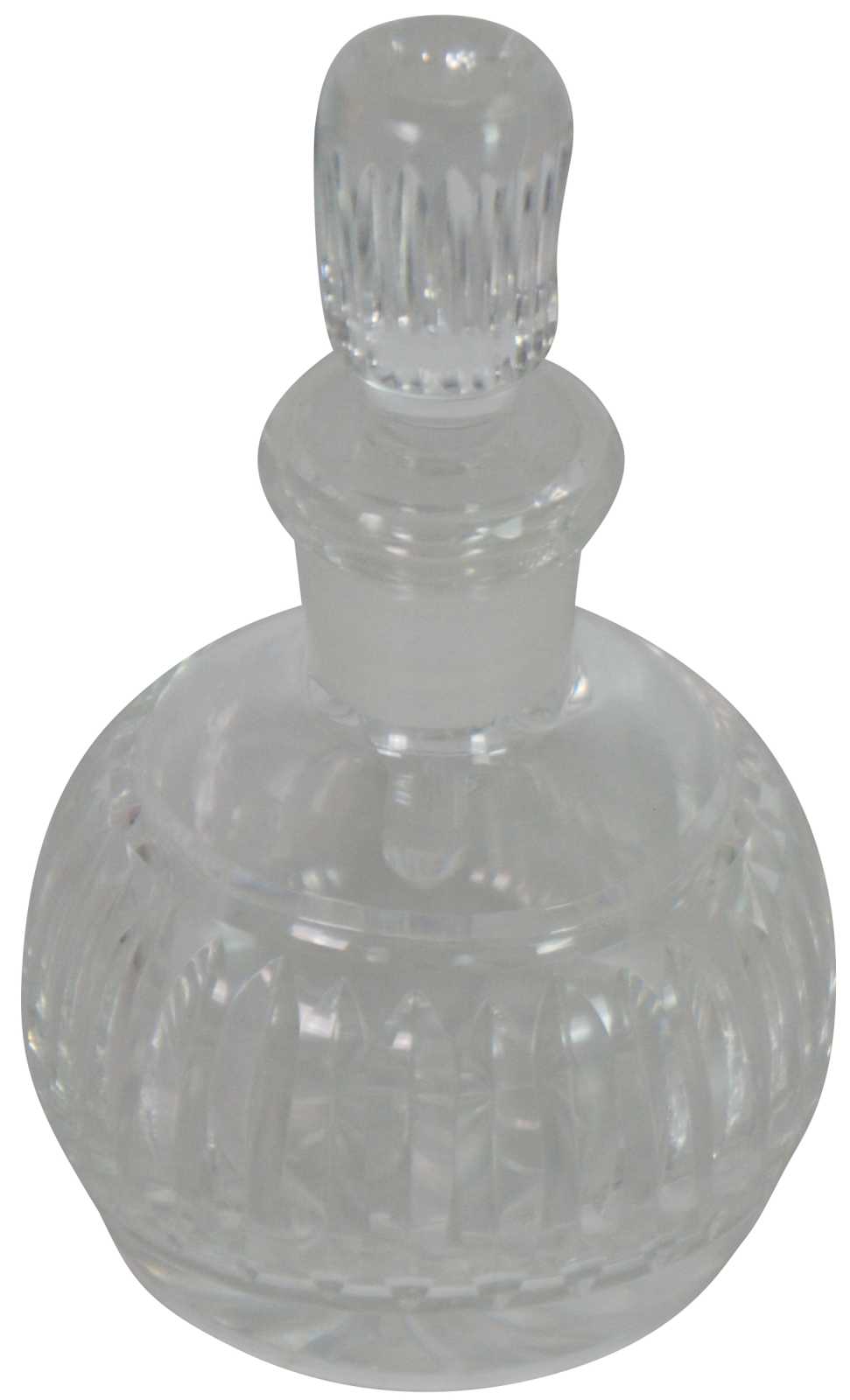 Vintage Waterford crystal perfume bottle with a round emerald cut body and ribbed, cylindrical stopper.