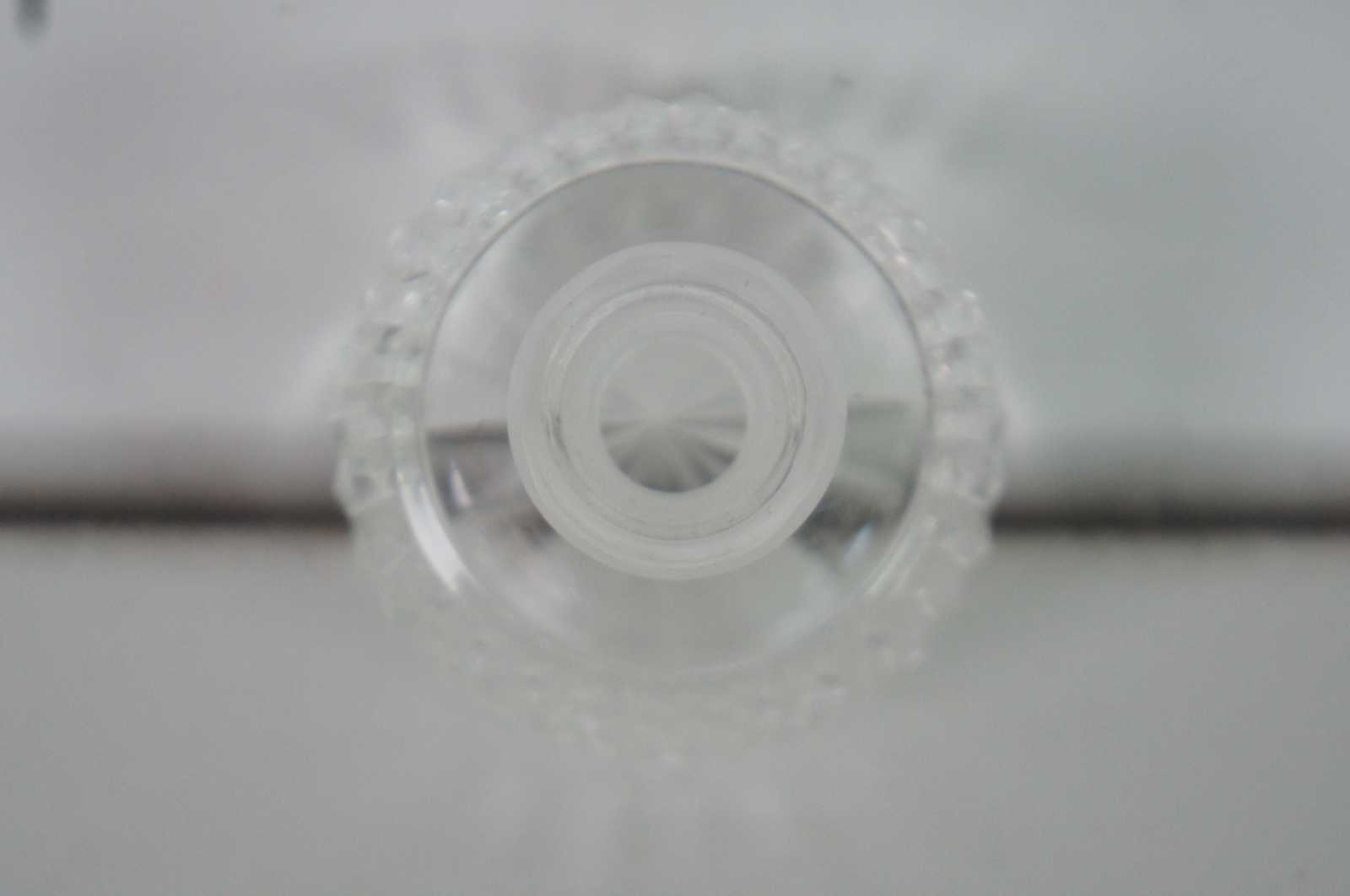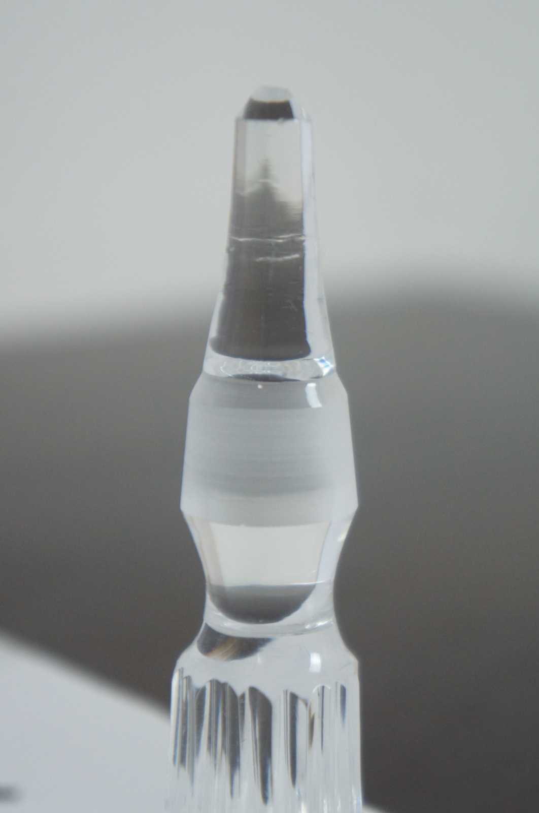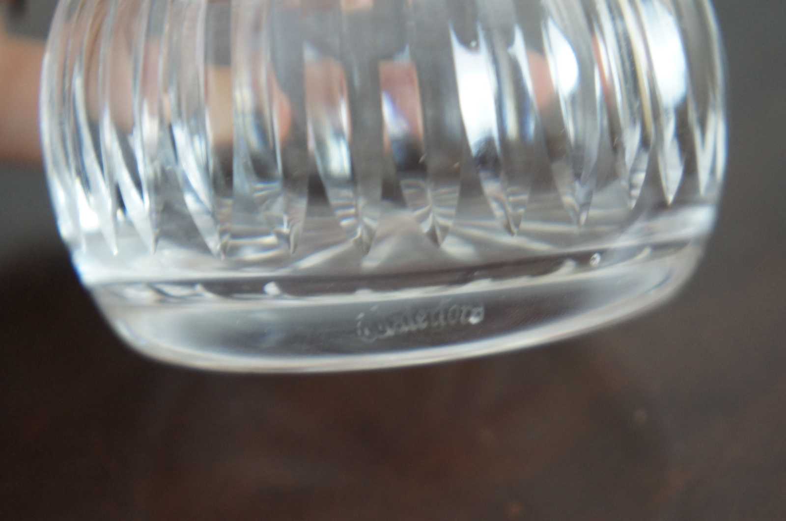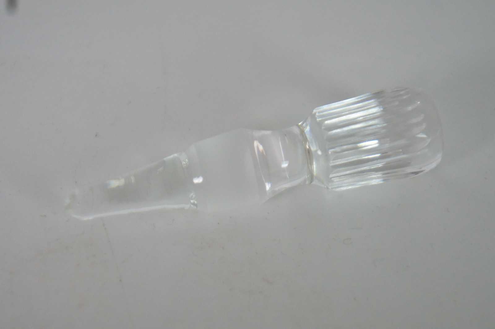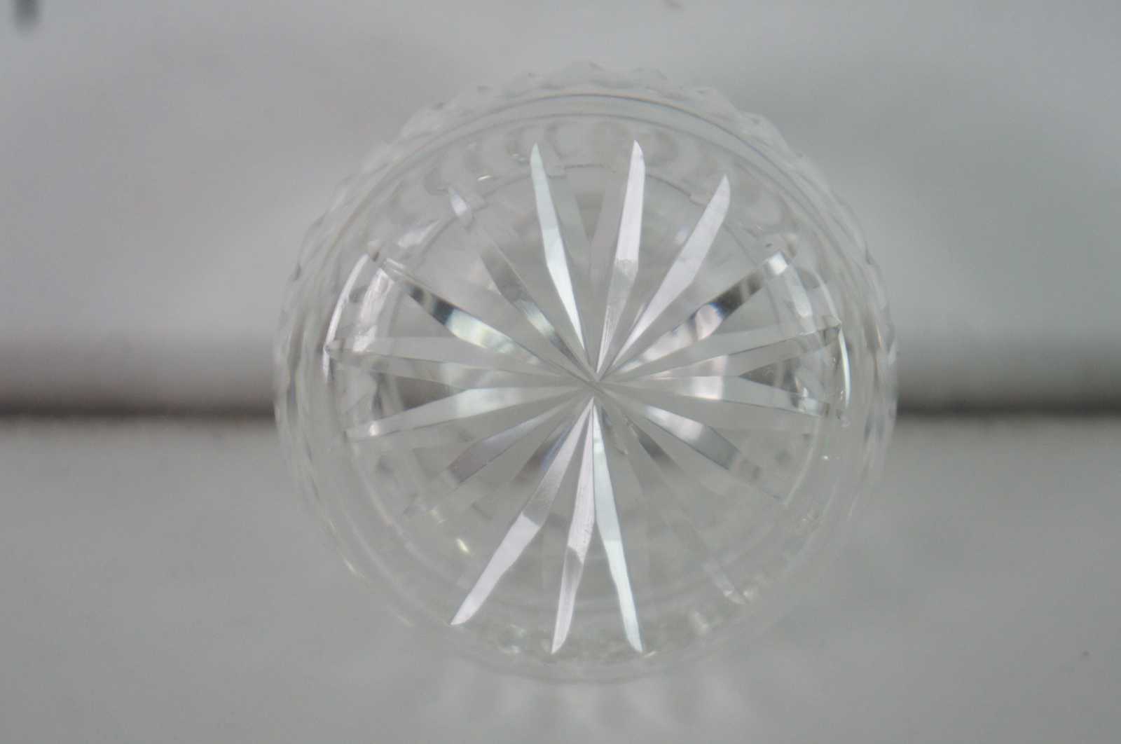 Vintage Waterford crystal perfume bottle with a round emerald cut body and ribbed, cylindrical stopper.