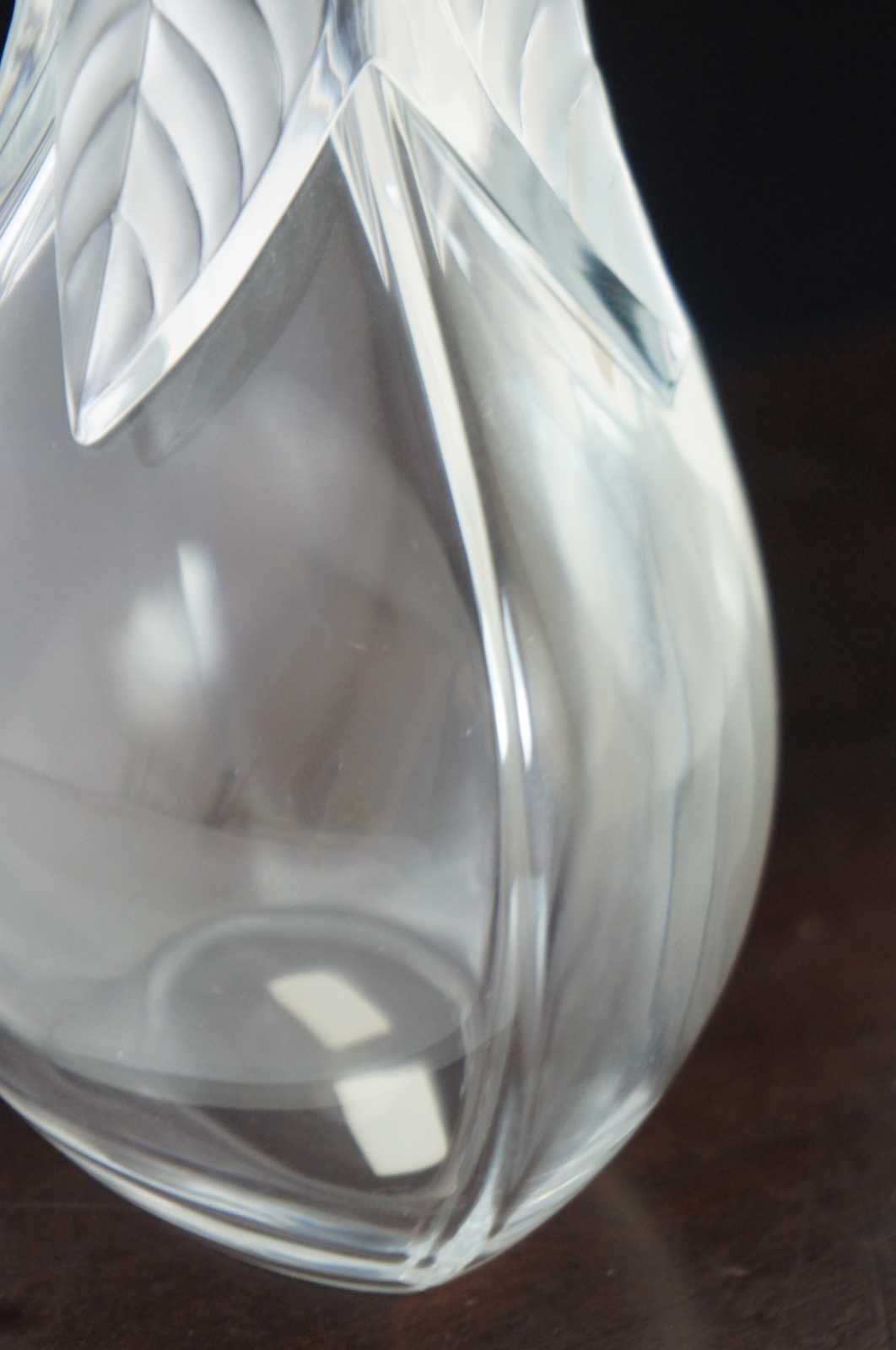 Vintage Lalique France Osumi Leaf crystal bottle shaped vase with a border of frosted leaves around the mouth. 12302.