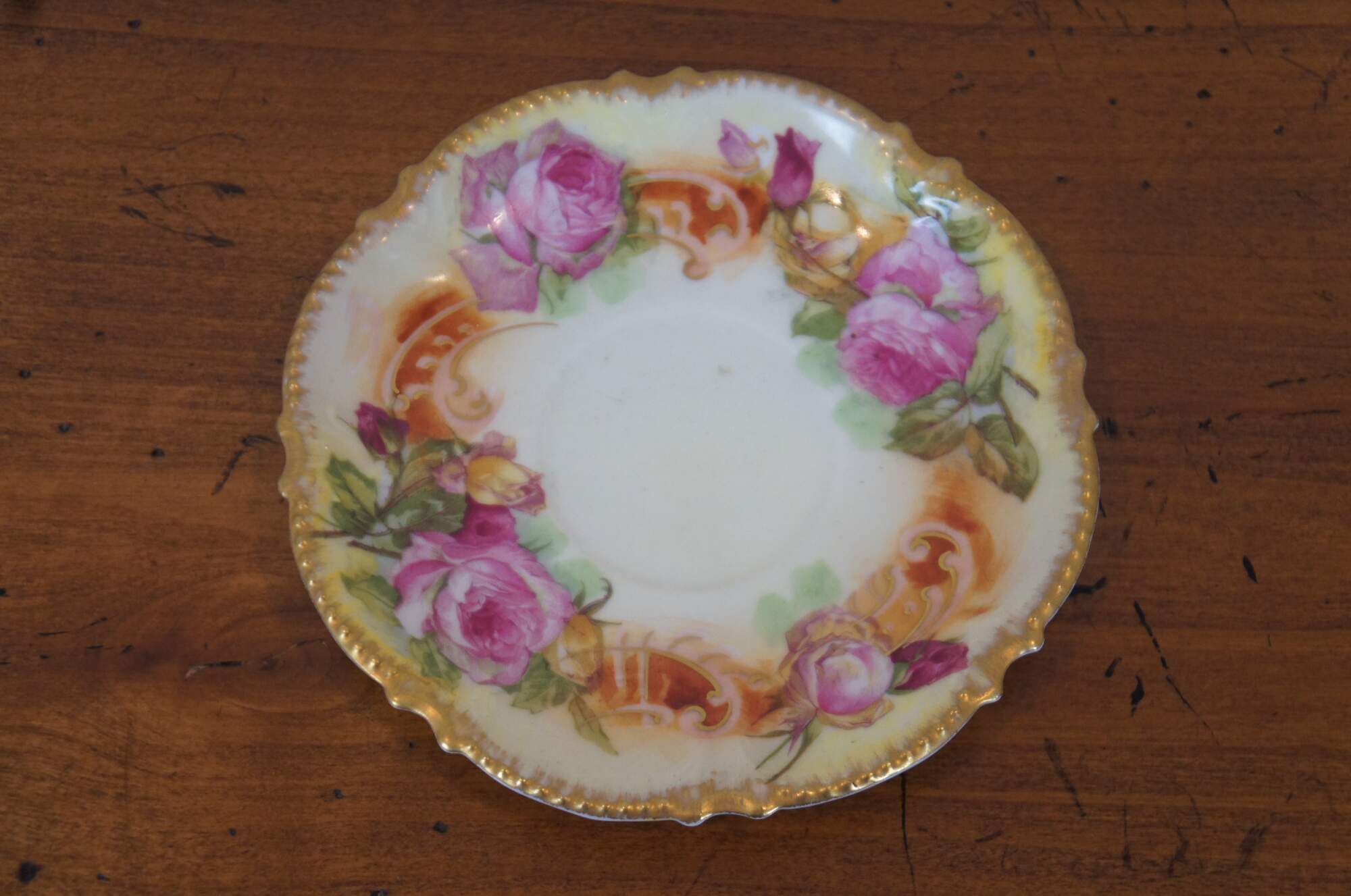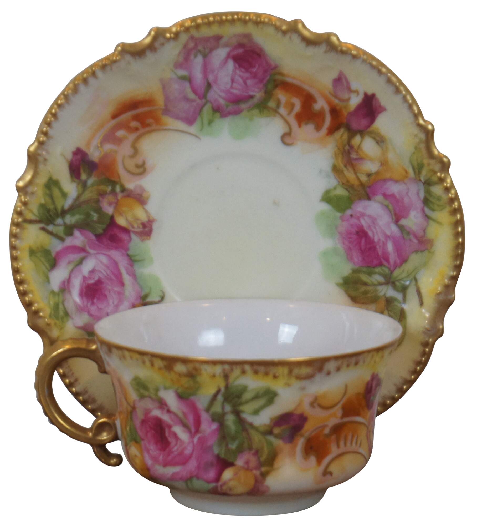 Antique Coronet Limoges France porcelain teacup and saucer featuring a serpentine form with painted and gilded orange and pink roses.