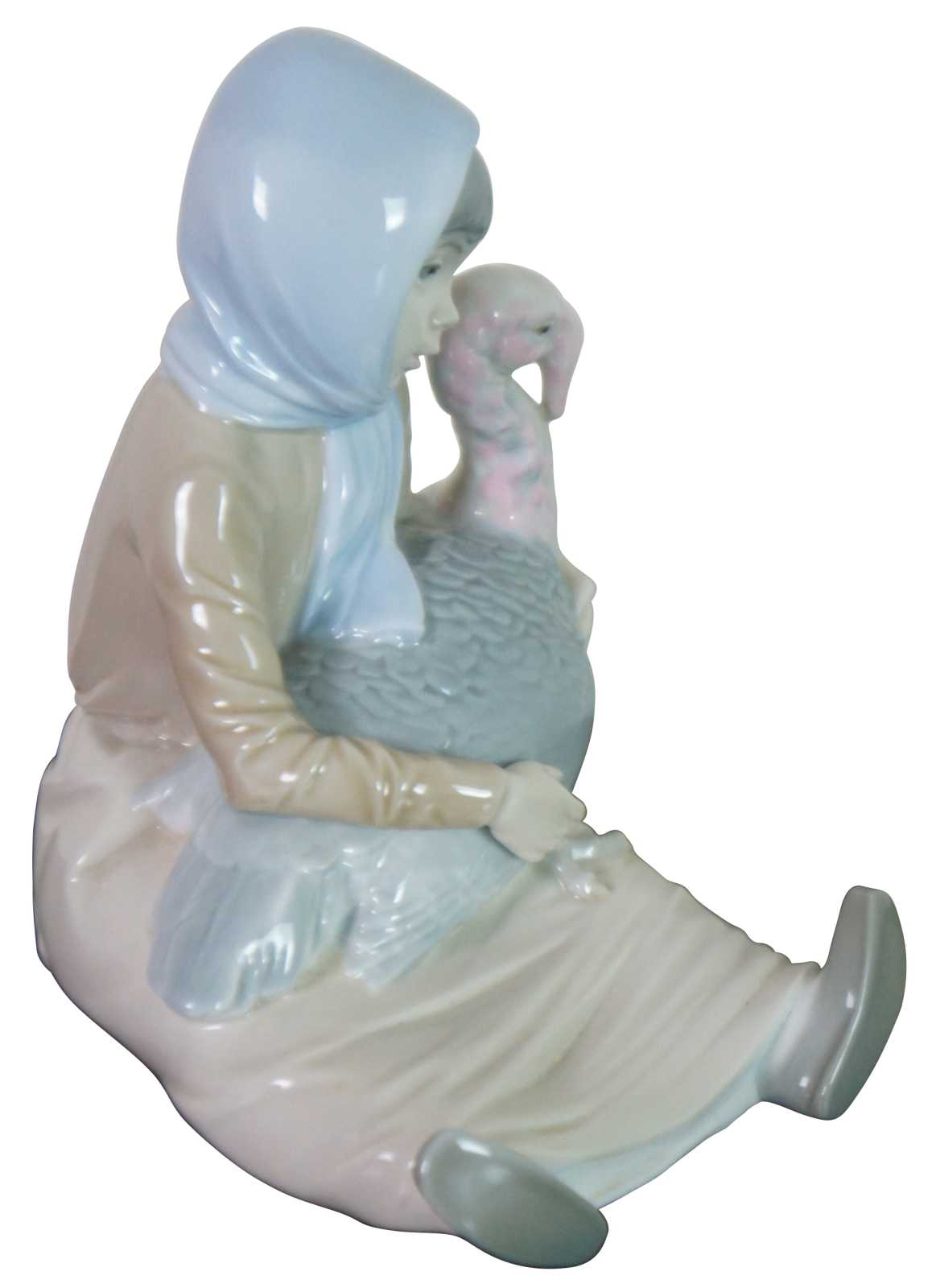 Vintage Lladro Spain porcelain figurine titled “Girl with Turkey,” number 4569, designed by Fulgencio Garcia, featuring a young girl seated on the ground with a large turkey and a basket of eggs.