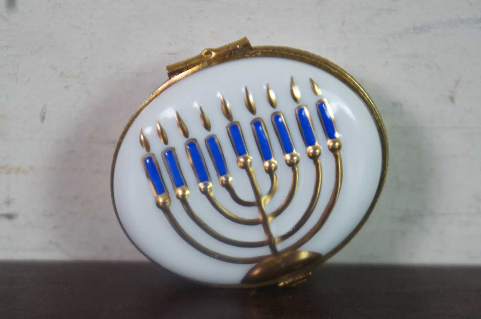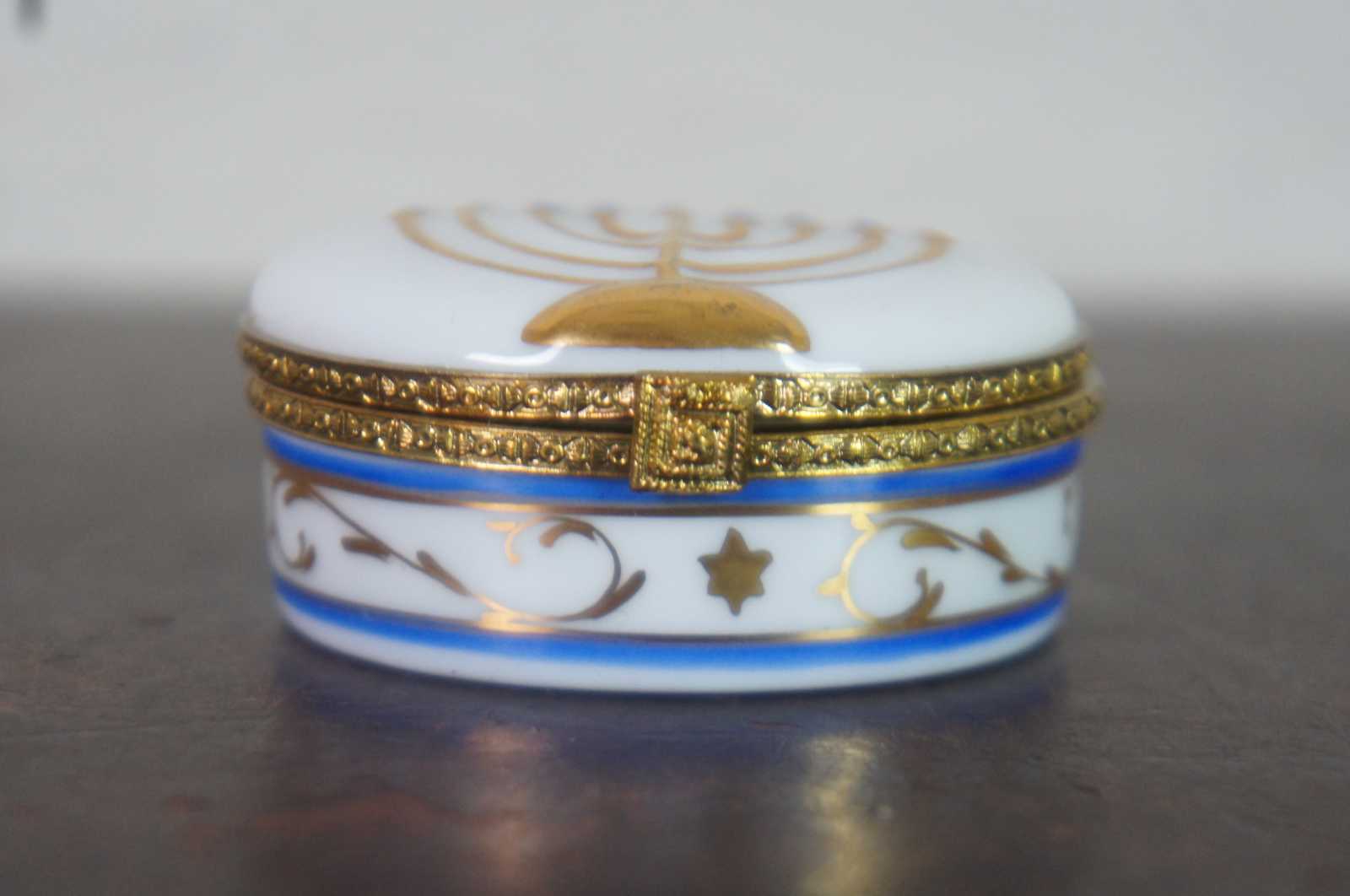 Vintage signed Limoges France hand painted porcelain trinket box featuring a 22KT gold painted Hanukkah menorah with nine royal blue candles, edged in gold with gold flames. A blue and gold pin stripe border with gold scrolls and Jewish stars is on the side. The clasp is a coiled square.