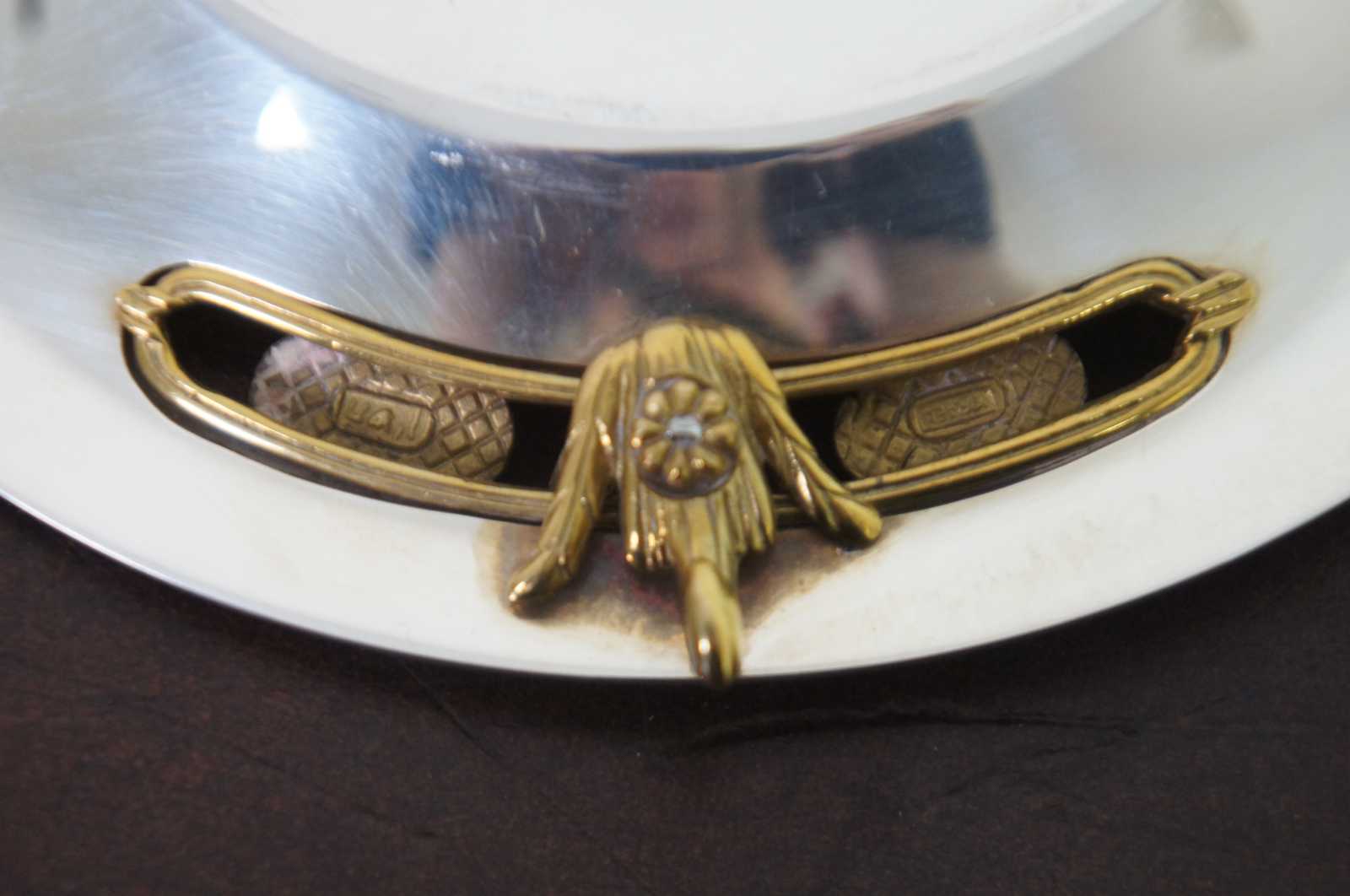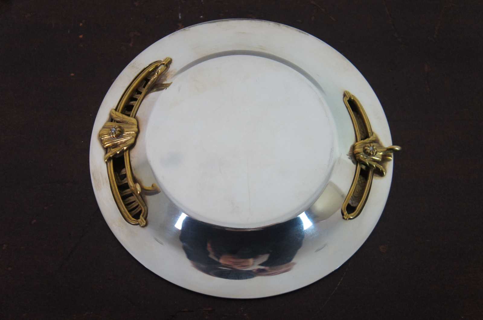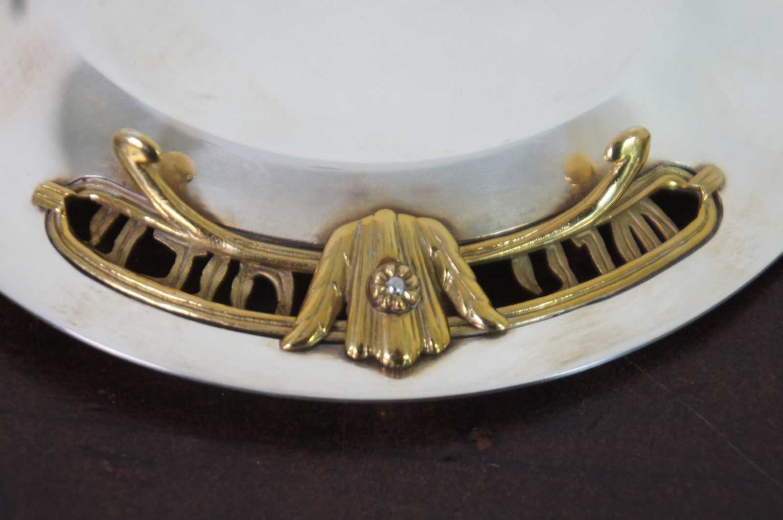 Vintage silver and brass Rosh Hashanah ""L'Shanah Tovah (Good Year)"" serving plate with brass feet and reticulated accents; numbered 138/500, with D S Butterfly mark.