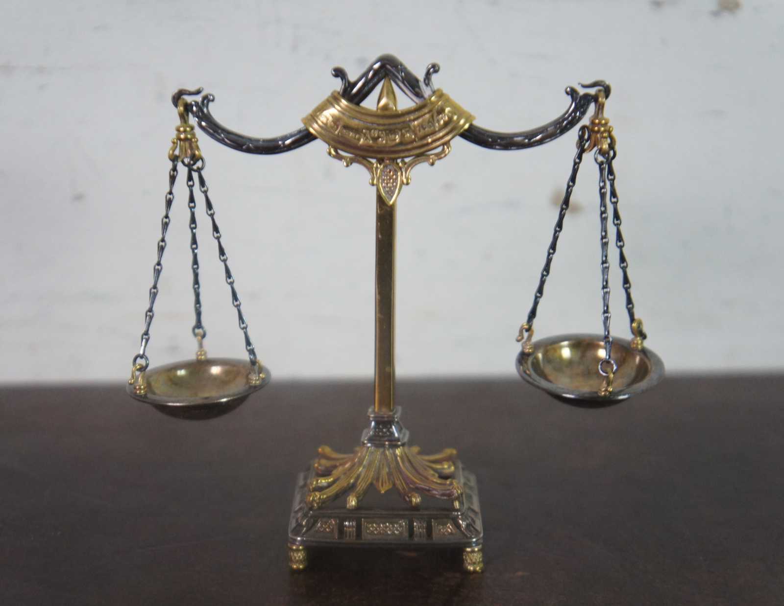 Vintage sterling silver and brass Scales of Judgment / justice art sculpture. Numbered 166/500. “Rosh Hashana, (Hebrew: “Beginning/Head of the Year”) , Hashana also spelled Hashanah or Ha-shanah, also called Day of Judgment or Day of Remembrance, a major Jewish observance now accepted as inaugurating the religious New Year on Tishri 1 (September or October). Because the New Year ushers in a 10-day period of self-examination and penitence, Rosh Hashana is also called the annual Day of Judgment; during this period each Jew reviews his relationship with God, the Supreme Judge. A distinctive feature of the liturgy is the blowing of the ram’s horn (shofar) as prescribed in Numbers 29:1; the notes of the shofar call the Jewish people to a spiritual awakening associated with the revelation to Moses on Mount Sinai. During the Additional Service in the synagogue, the shofar is sounded after the recital of each of three groups of prayers. Rosh Hashana is also known as the Day of Remembrance, for on this day Jews commemorate the creation of the world, and the Jewish nation recalls its responsibilities as God’s chosen people. On the first night of Rosh Hashana a New Year’s custom dictates that delicacies be prepared as omens of good luck. On the following night bread and fruit, dipped in honey, are customarily eaten, and a special blessing is recited. Rosh Hashana is the only festival observed for two days in Israel.”