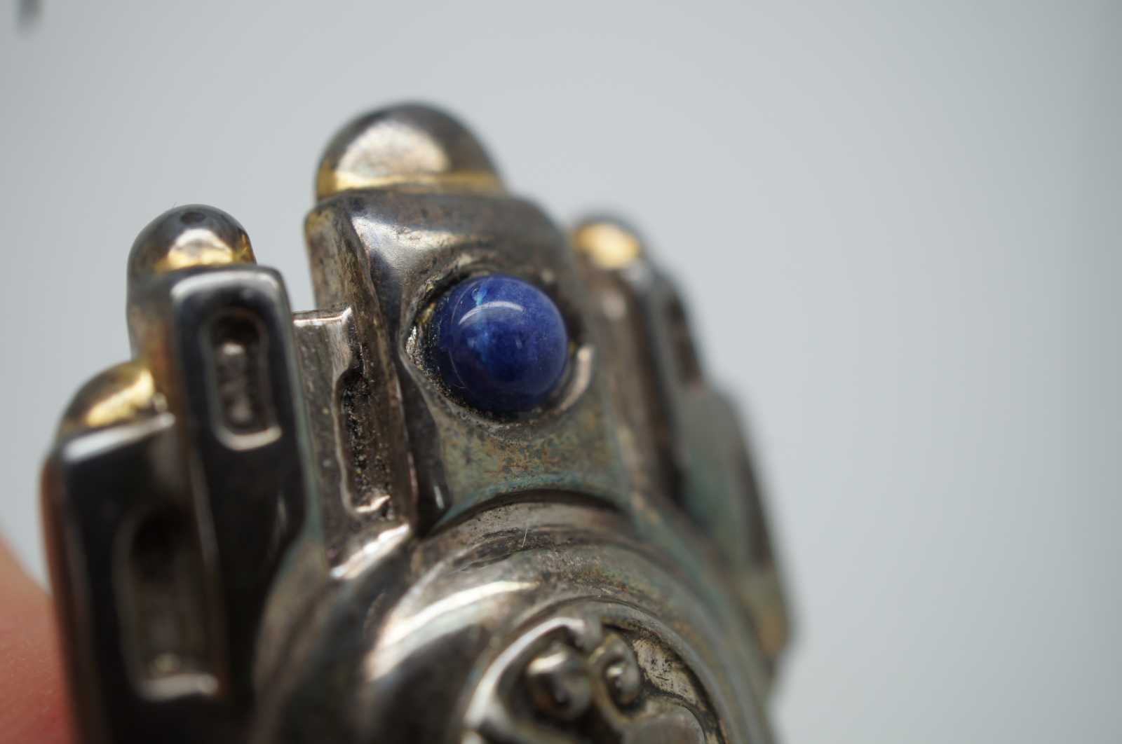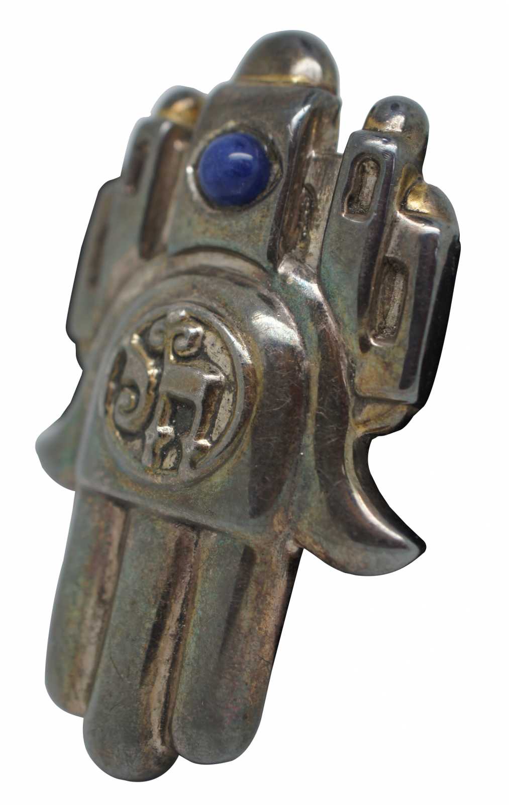 Vintage 925 sterling silver hamsa hand with an eye of lapis lazuli by Frank Meisler, wearable as a pin or a pendant. “The hamsa (Arabic: خمسة, romanized: khamsa, Hebrew: חַמְסָה, romanized: ḥamsā) is a palm-shaped amulet popular throughout North Africa and in the Middle East and commonly used in jewelery and wall hangings.[1][2] Depicting the open right hand, an image recognized and used as a sign of protection in many times throughout history, the hamsa has been traditionally believed to provide defense against the evil eye.