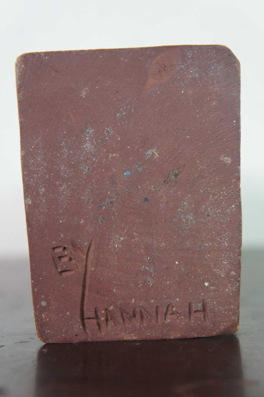 Mid Century carved wood folk art figure by Geral Pat Hannah titled “Yankee Pedlar,” featuring an middle aged man with a pack on his back. “One of the original three Hannah brothers (Charles, Pat and Tom) who became wood carvers in the 1930’s in Quebec. “Pat” Gerald Hannah and his brother Charles learned wood carving from Carl-Johan Trygg (the founder of the Trygg family of artists in Canada.) who had a carving school near Saint-Sauveur, Quebec. He was called Pat because he was born on Saint-Patrick’s day; though living in the predominantly Irish Burrough of Verdun may have had some influence. The Trygg influence is apparent in many works done by him and the other family members who learned their techniques from Pat and Charlie Hannah. After a brief stay in Florida, Pat Hannah re-located in North Poultney, Vermont in 1948. He carved character figures in a full range; from Mounted Police to sailors, famous people and just ‘folks’ in various sizes typically about 6 inches high. All in bright paint and in Pine wood or Basswood. Unlike the Trygg carvers, who applied their bases, Most of the the Hannah sculptors carved the base into their works. In the carvings by ‘Pat’ Hannah, illustrated below, the bases are applied, as the Tryggs were. He signed P. Hannah or Pat Hannah, usually on the bottom of the base with a pencil or later, with a chisel. In the late 50’s he started signing his carvings “By Hannah.” His son, Duncan Hannah, of Vermont, was also a carver of figural characters (see his post). He had another son, Pete Hannah, who may have carved. Carvings stamped “Hand Carved by P. R. Hannah, Quebec” are seen occasionally.”