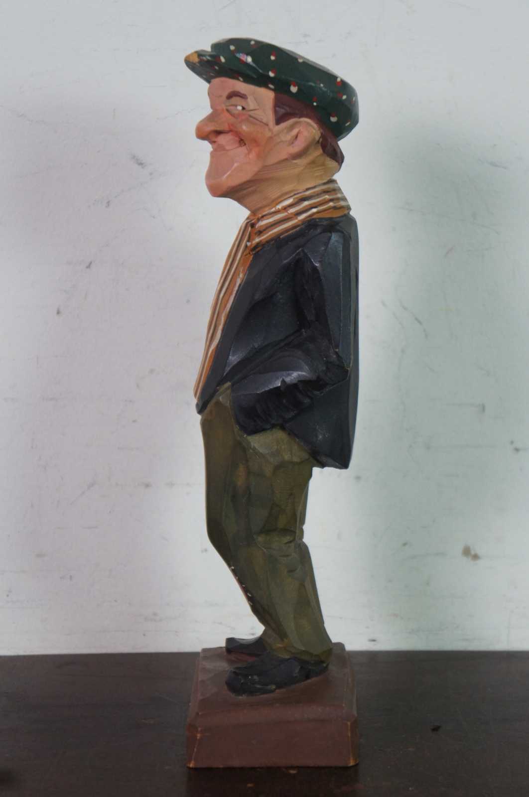 Mid Century carved wood folk art figure by Gerald Pat Hannah titled “Happy Day,” featuring a man with patched trousers, striped scarf and spotted cap, standing with his hands in his pockets, once smoking a cigar. “One of the original three Hannah brothers (Charles, Pat and Tom) who became wood carvers in the 1930’s in Quebec. “Pat” Gerald Hannah and his brother Charles learned wood carving from Carl-Johan Trygg (the founder of the Trygg family of artists in Canada.) who had a carving school near Saint-Sauveur, Quebec. He was called Pat because he was born on Saint-Patrick’s day; though living in the predominantly Irish Burrough of Verdun may have had some influence. The Trygg influence is apparent in many works done by him and the other family members who learned their techniques from Pat and Charlie Hannah. After a brief stay in Florida, Pat Hannah re-located in North Poultney, Vermont in 1948. He carved character figures in a full range; from Mounted Police to sailors, famous people and just ‘folks’ in various sizes typically about 6 inches high. All in bright paint and in Pine wood or Basswood. Unlike the Trygg carvers, who applied their bases, Most of the the Hannah sculptors carved the base into their works. In the carvings by ‘Pat’ Hannah, illustrated below, the bases are applied, as the Tryggs were. He signed P. Hannah or Pat Hannah, usually on the bottom of the base with a pencil or later, with a chisel. In the late 50’s he started signing his carvings “By Hannah.” His son, Duncan Hannah, of Vermont, was also a carver of figural characters (see his post). He had another son, Pete Hannah, who may have carved. Carvings stamped “Hand Carved by P. R. Hannah, Quebec” are seen occasionally.”