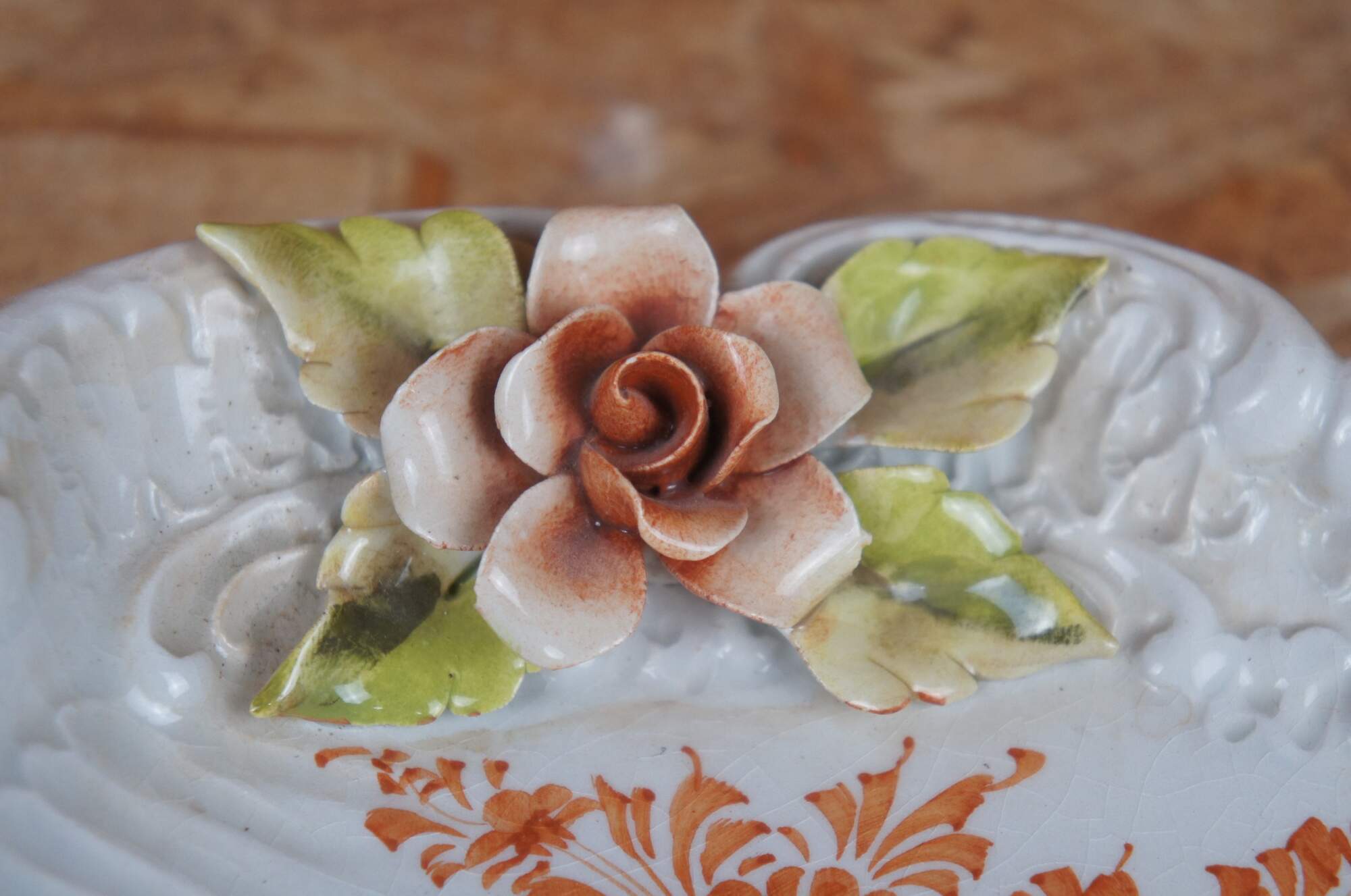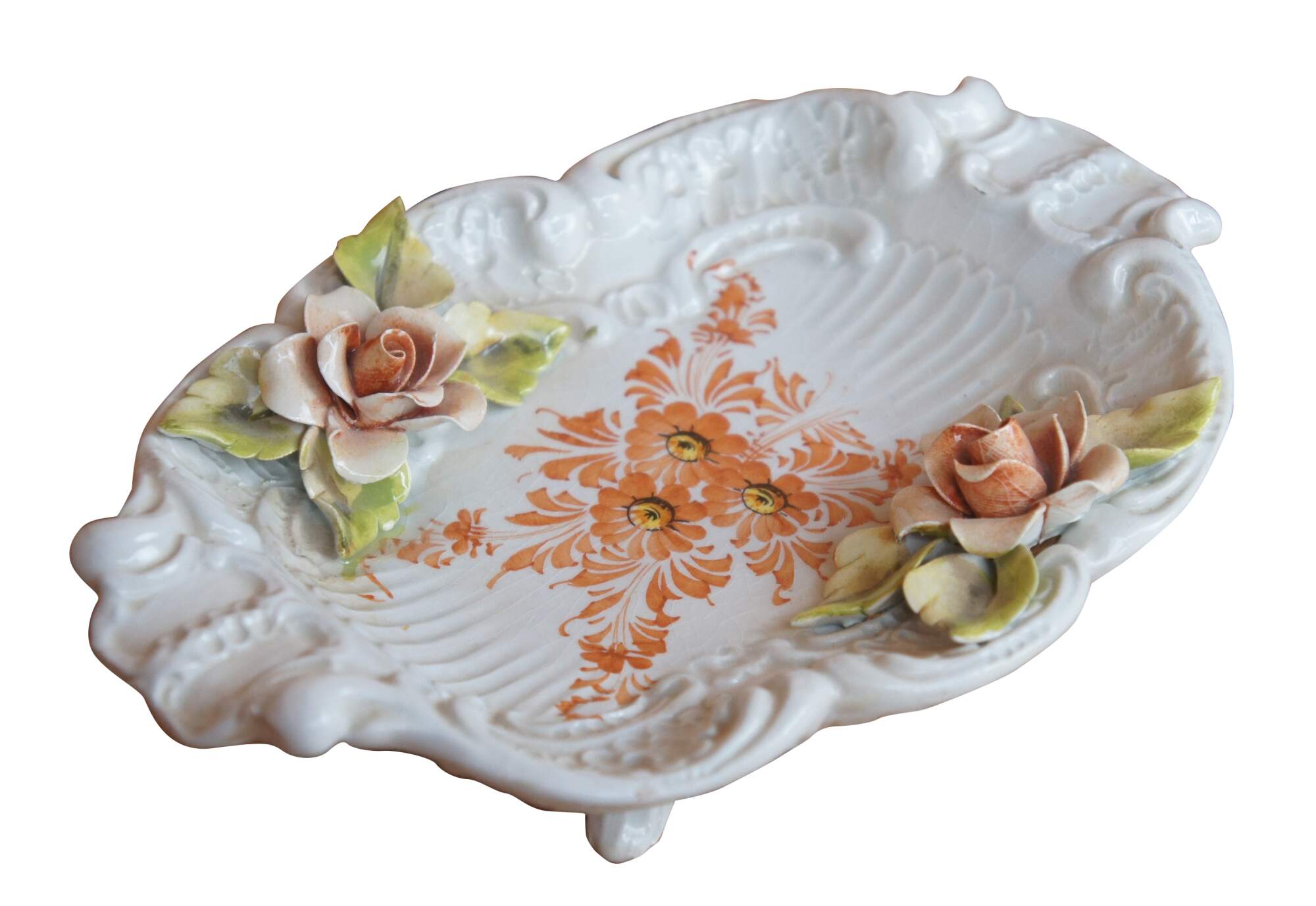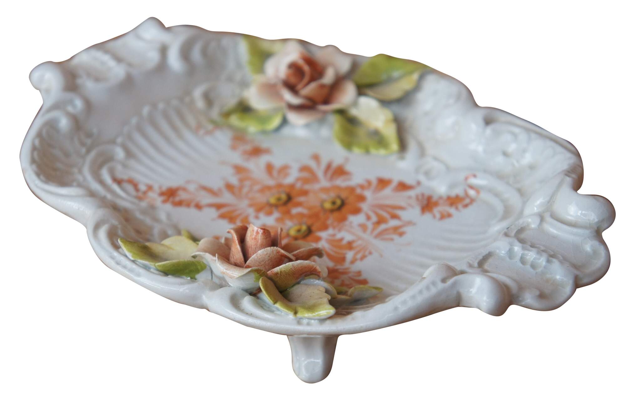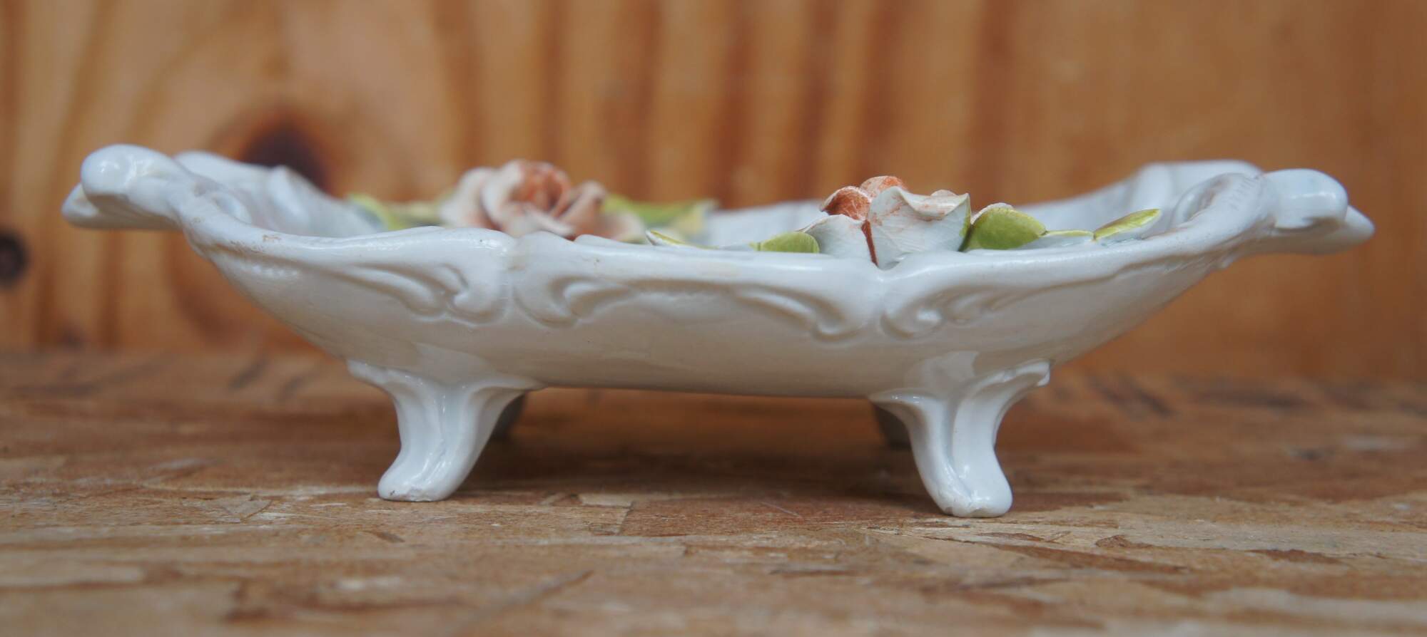 This lovely fine porcelain dish features pink roses in high relief style with 4 feet and ornate handles.