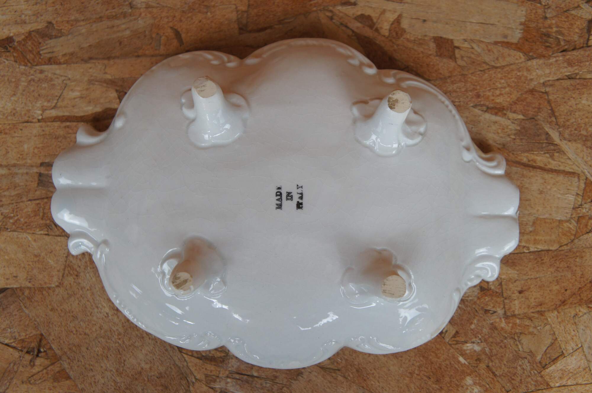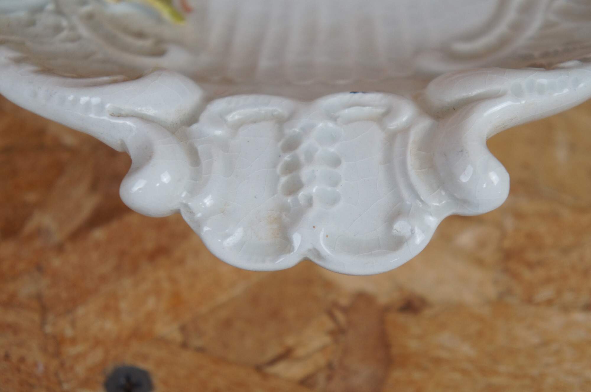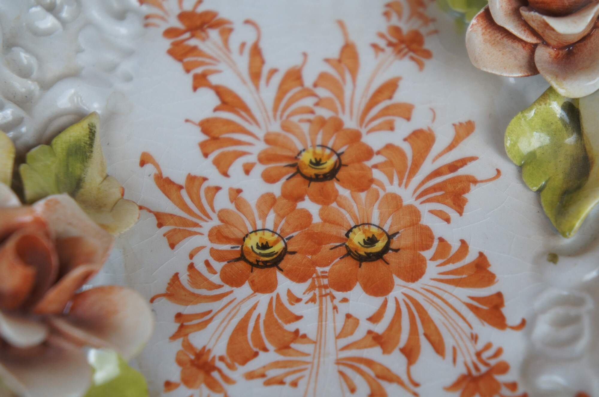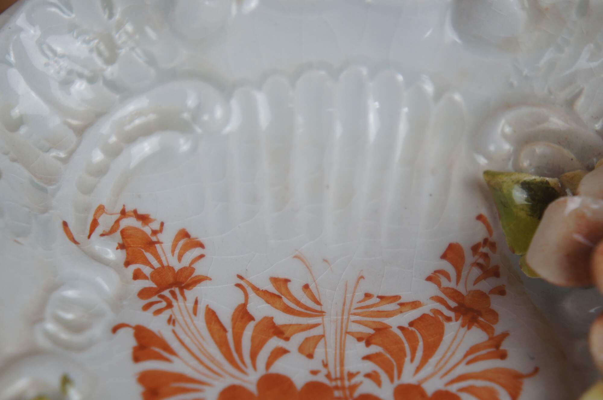 This lovely fine porcelain dish features pink roses in high relief style with 4 feet and ornate handles.