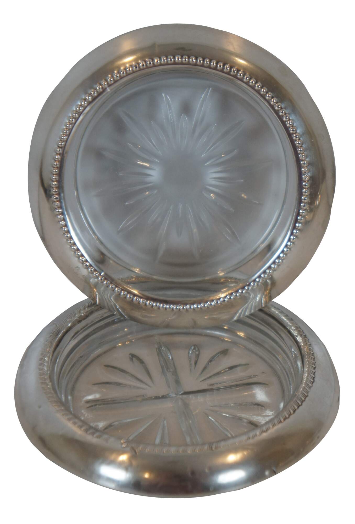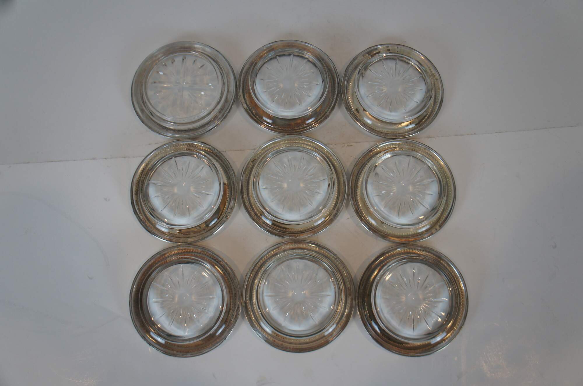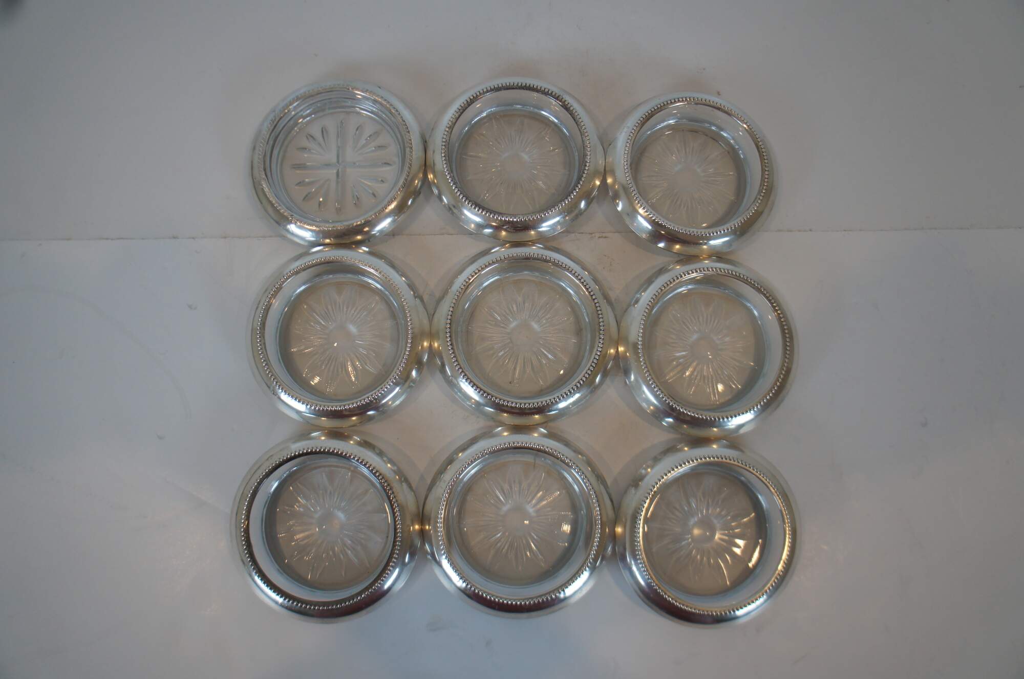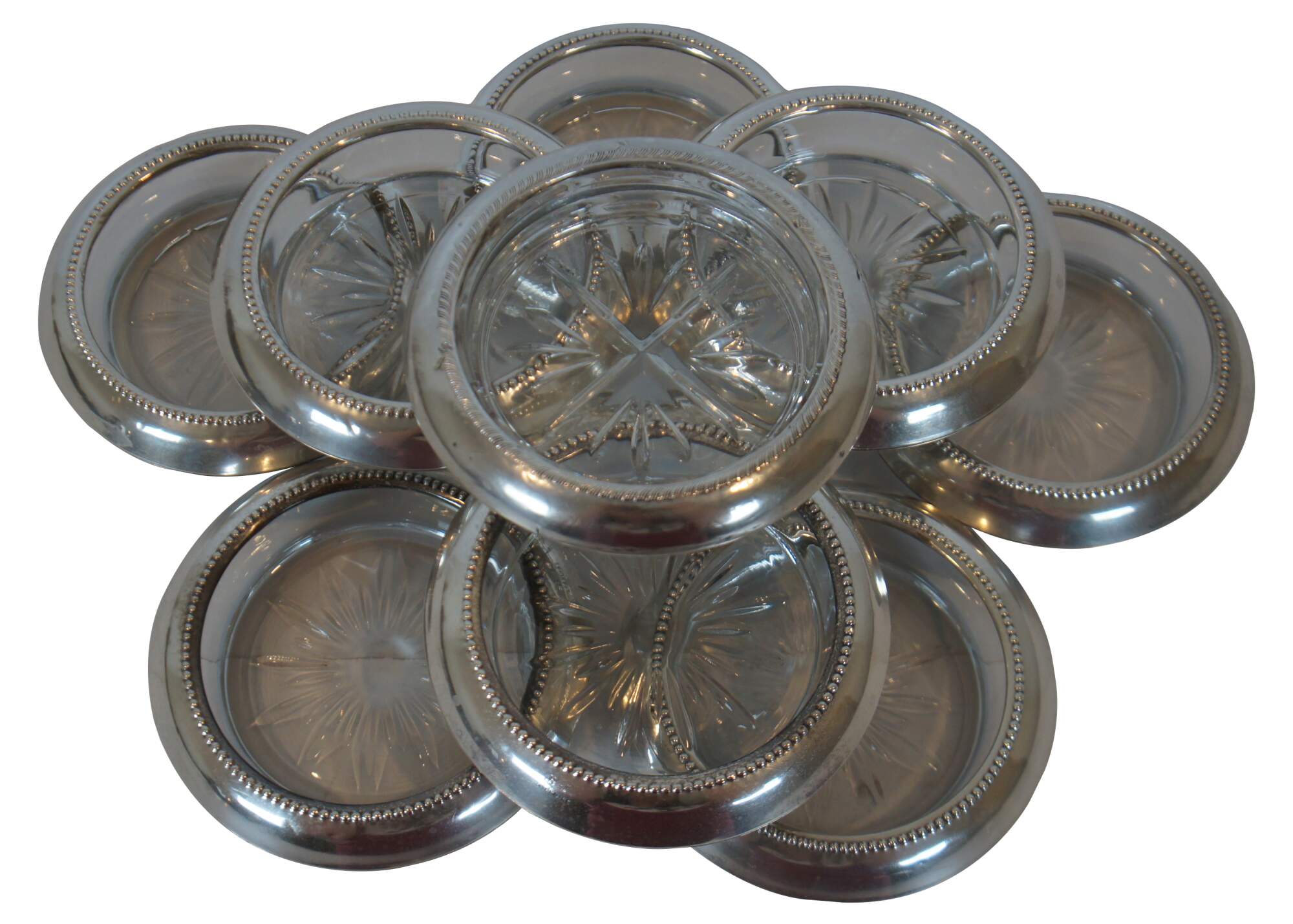 Set of nine vintage B-I sterling silver and pressed glass drink coasters with starburst pattern in the center and beaded rim.