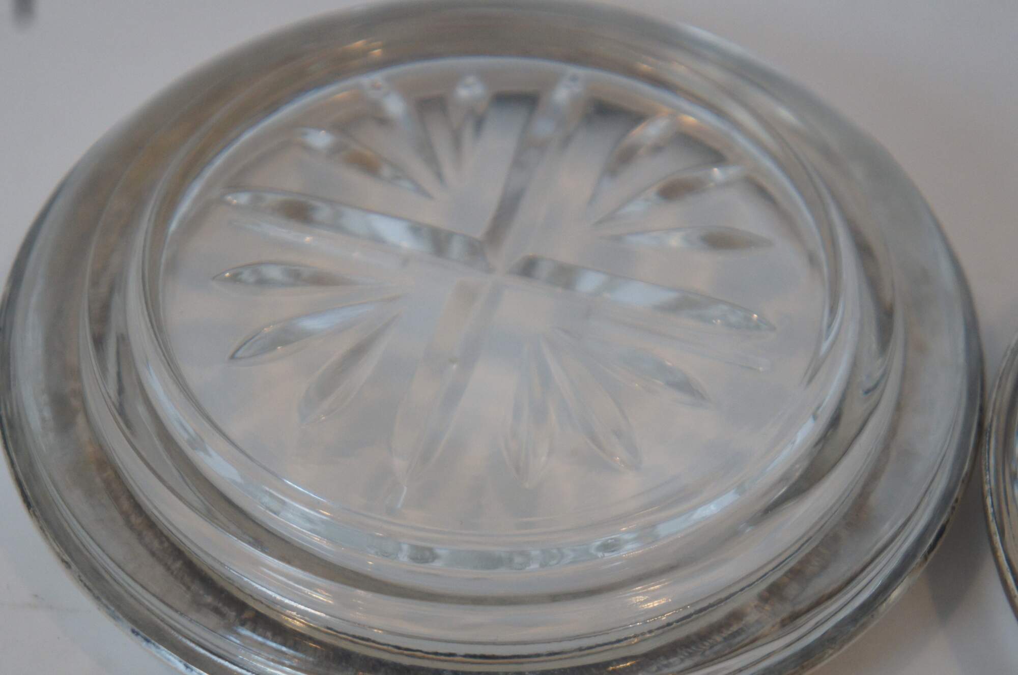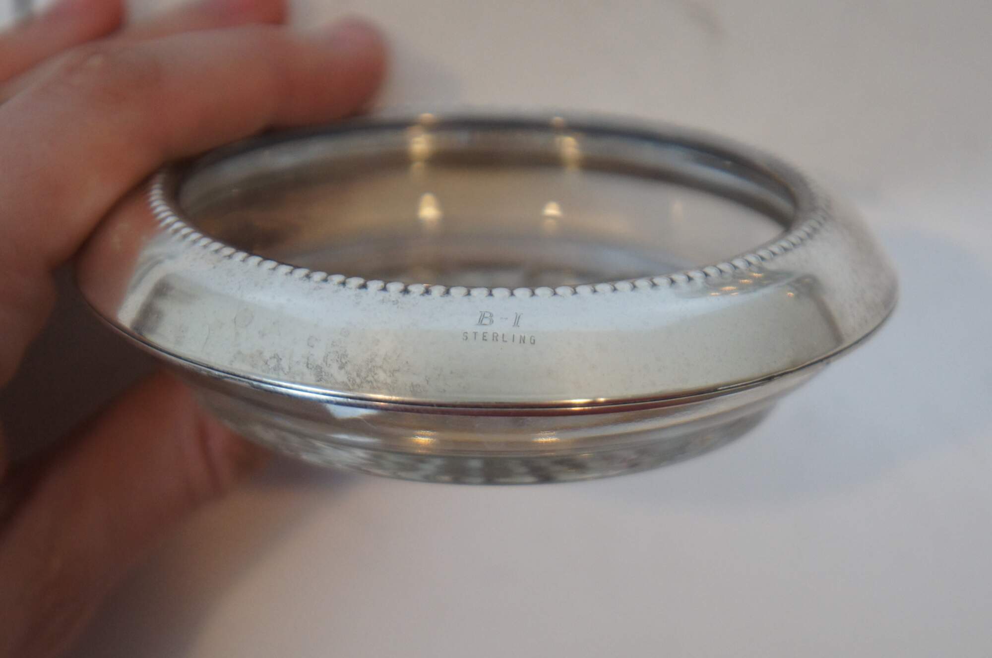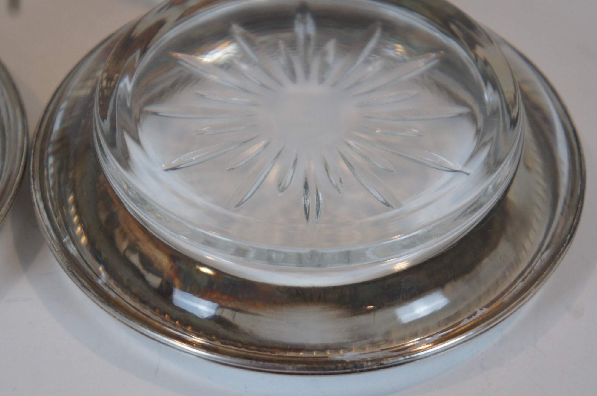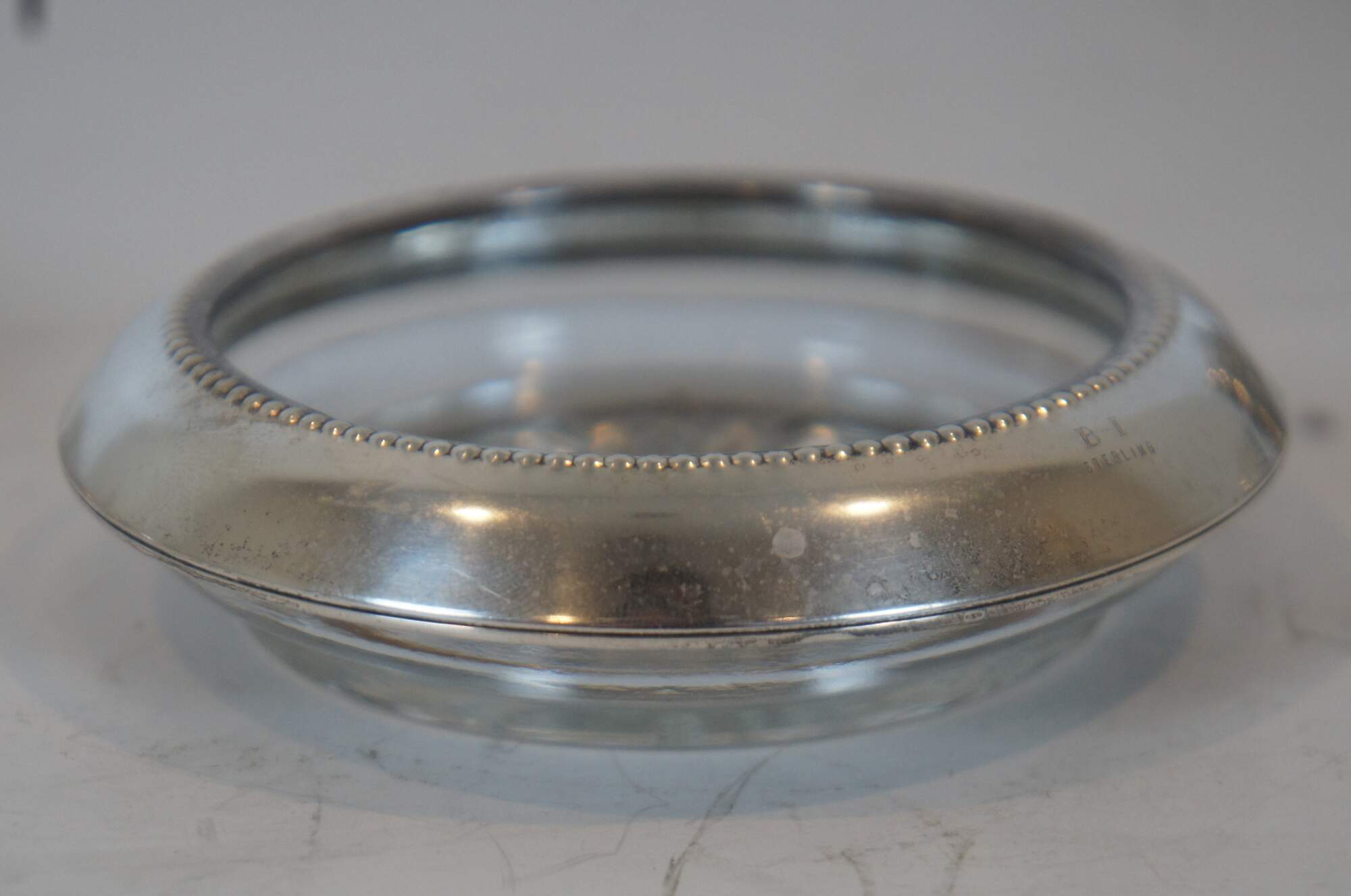 Set of nine vintage B-I sterling silver and pressed glass drink coasters with starburst pattern in the center and beaded rim.