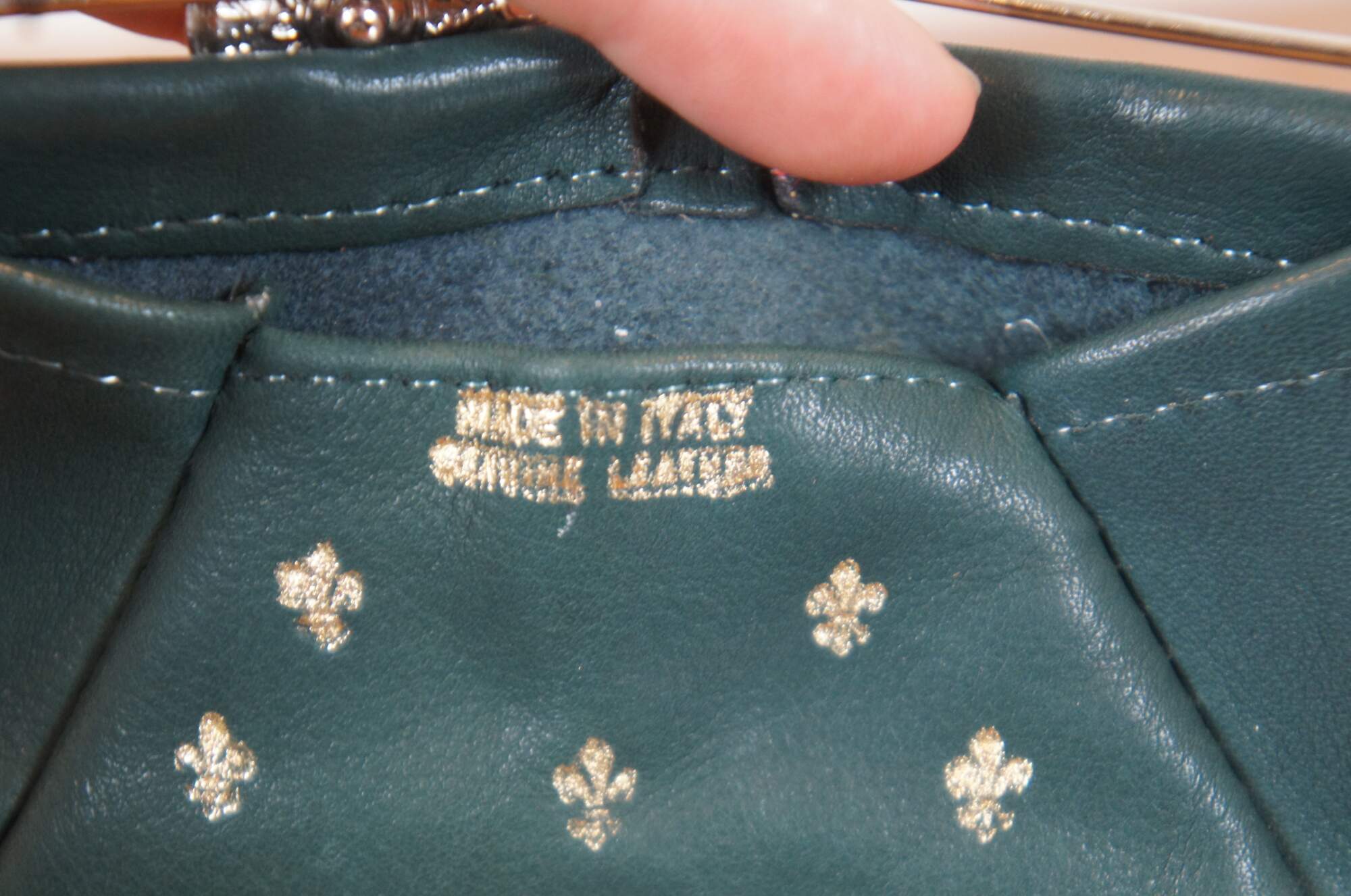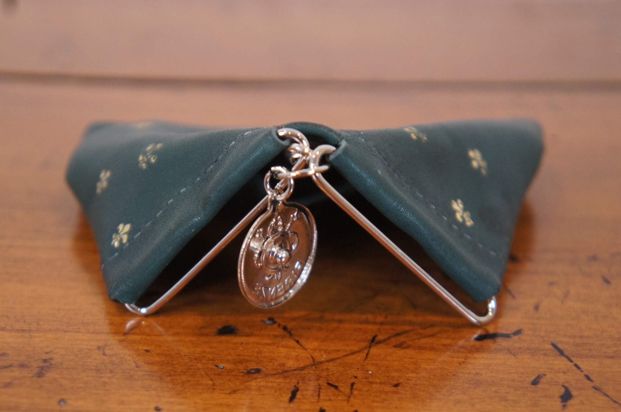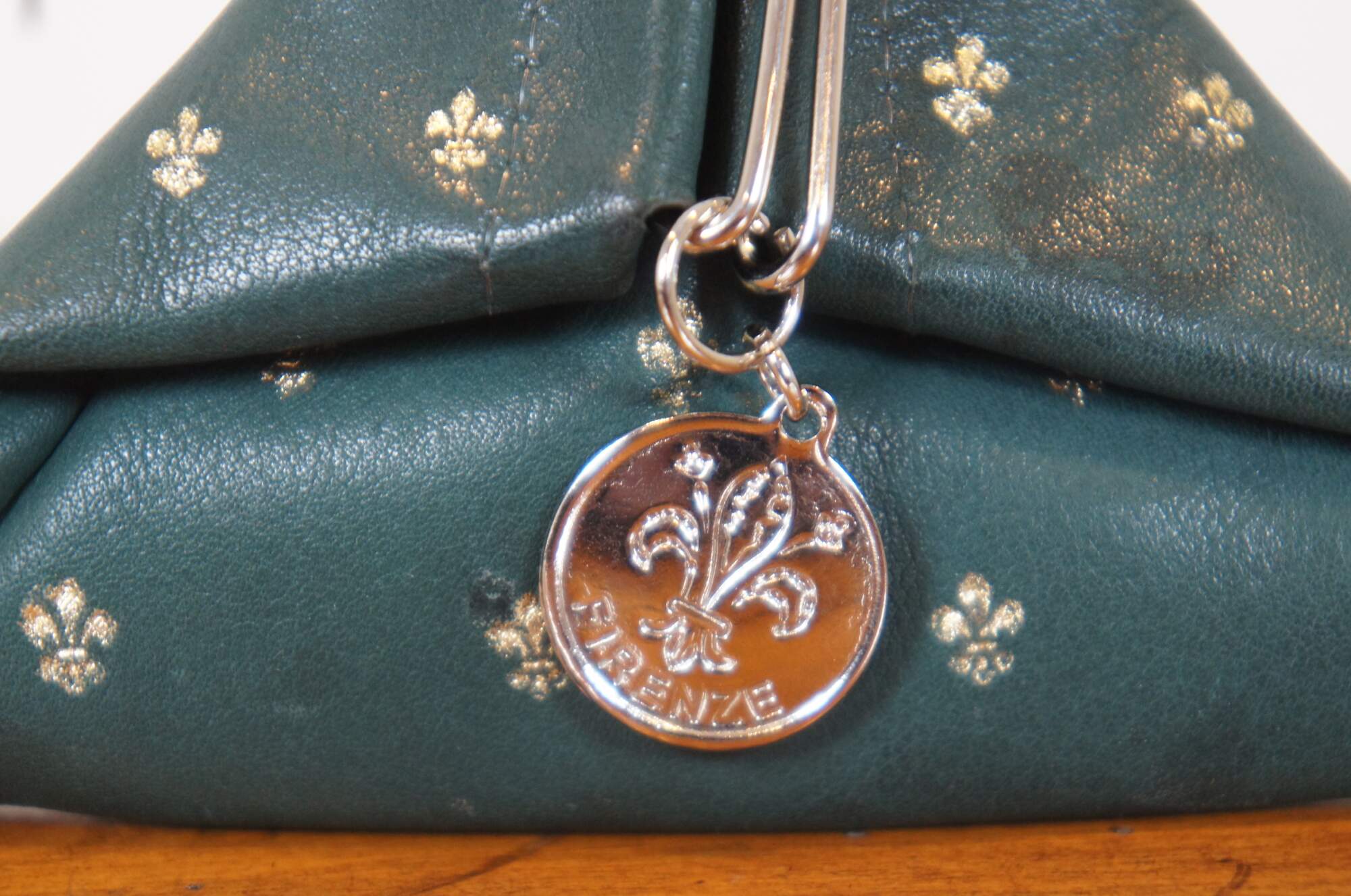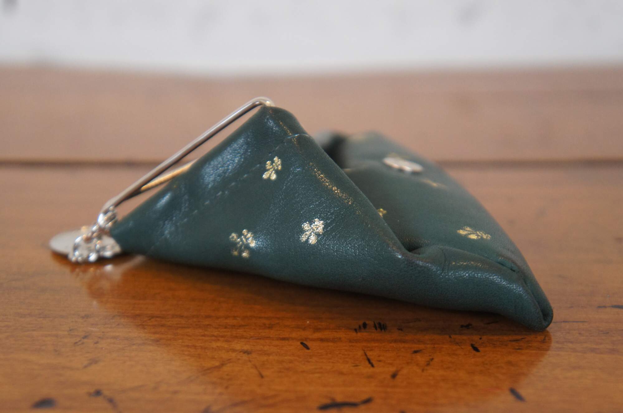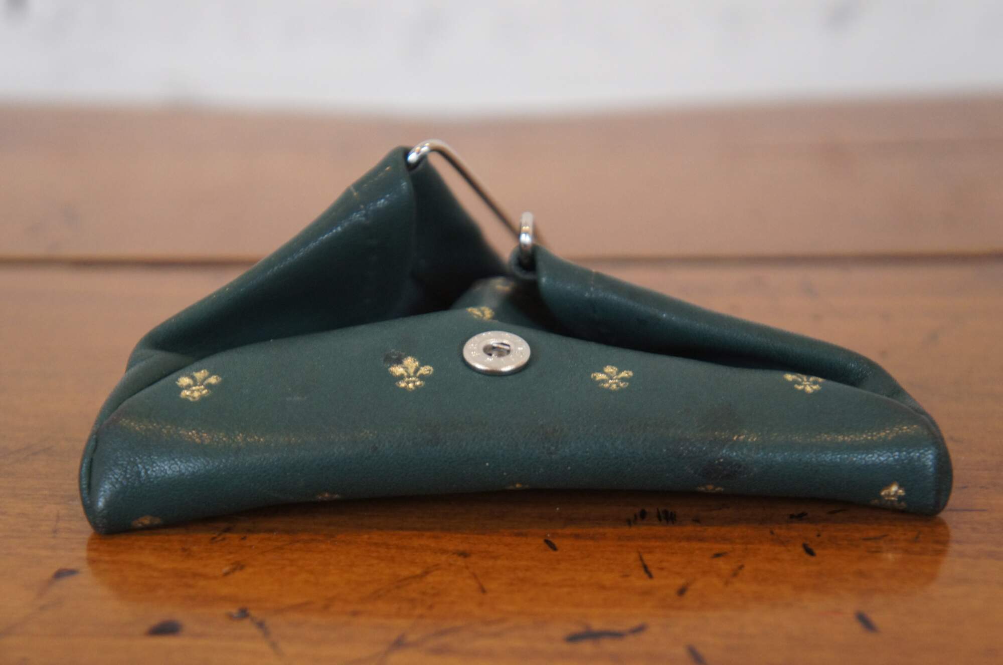 Vintage Firenze Fiocchi folding triangular shaped coin purse made of green Florentine leather stamped with gold fleur de lis.