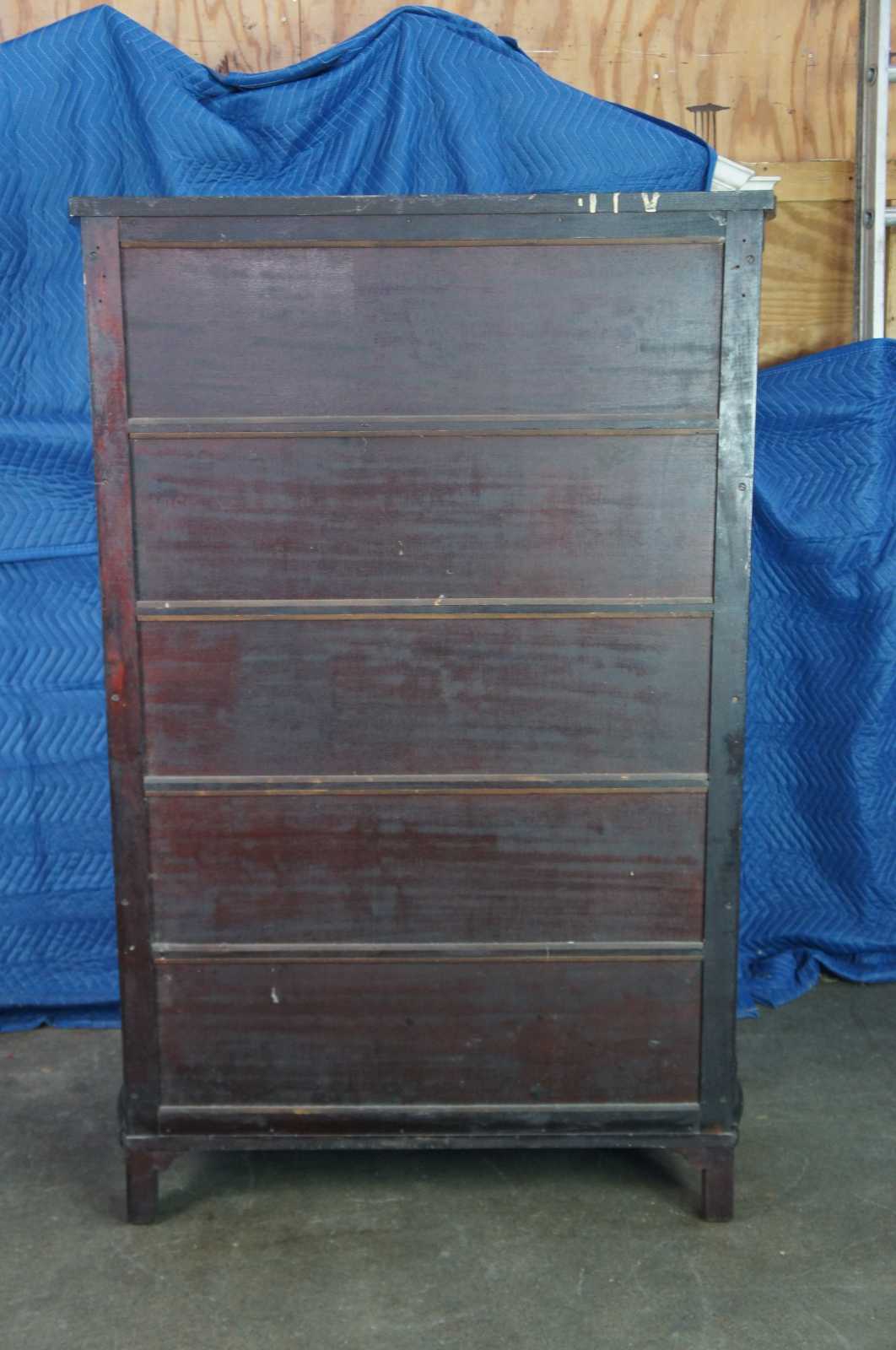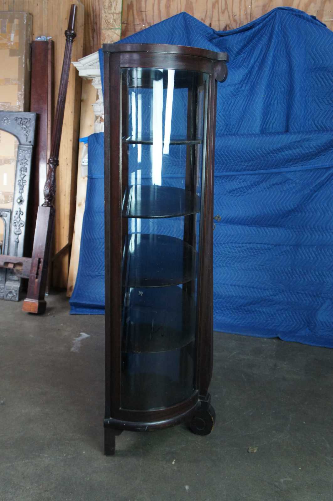 Antique mahogany bow front curio display or china cabinet featuring American Empire styling with curved glass doors, wood shelves and scrolled legs.