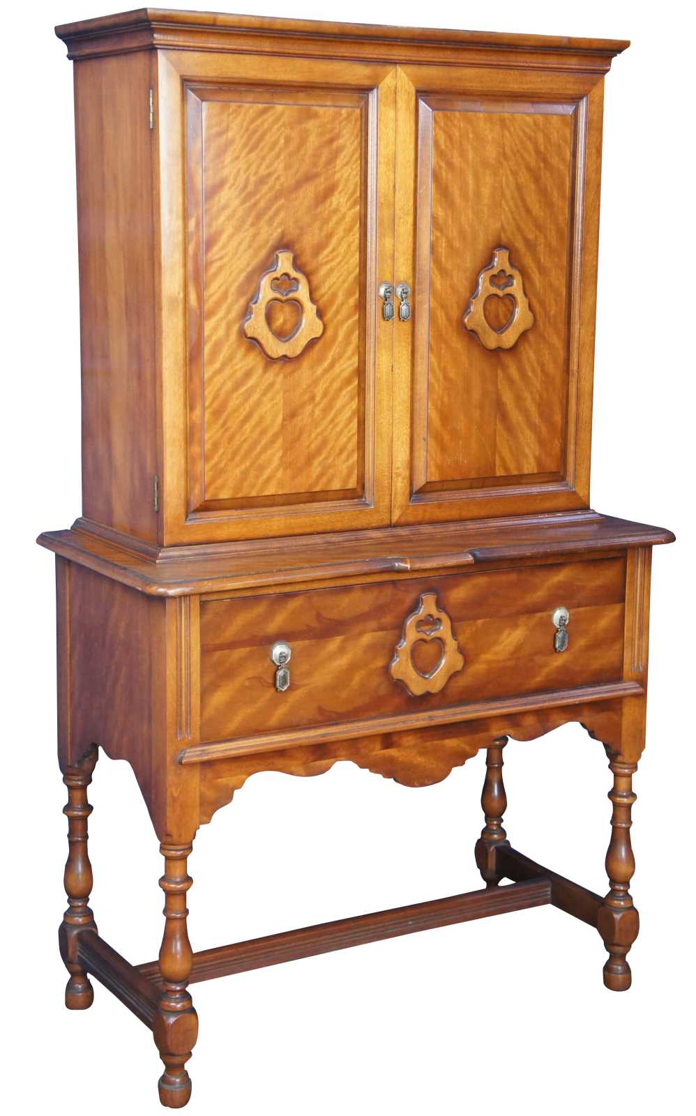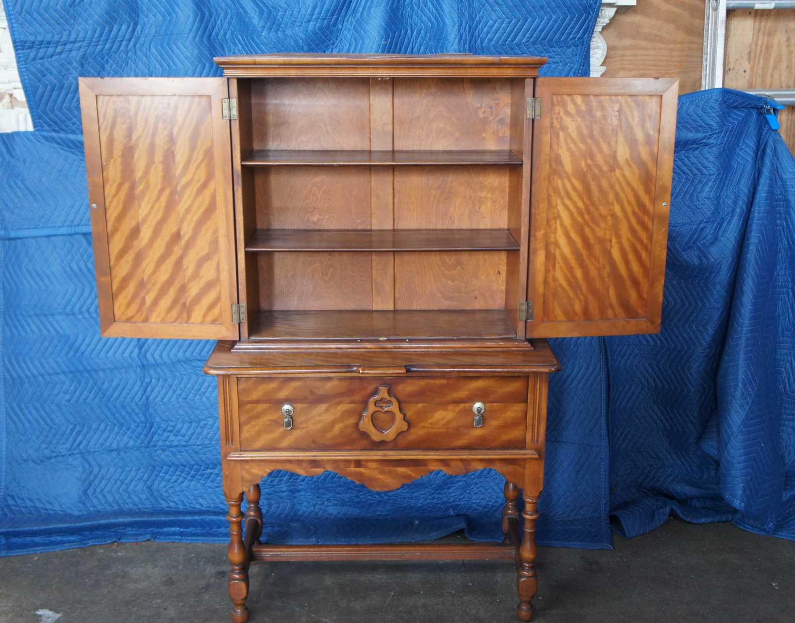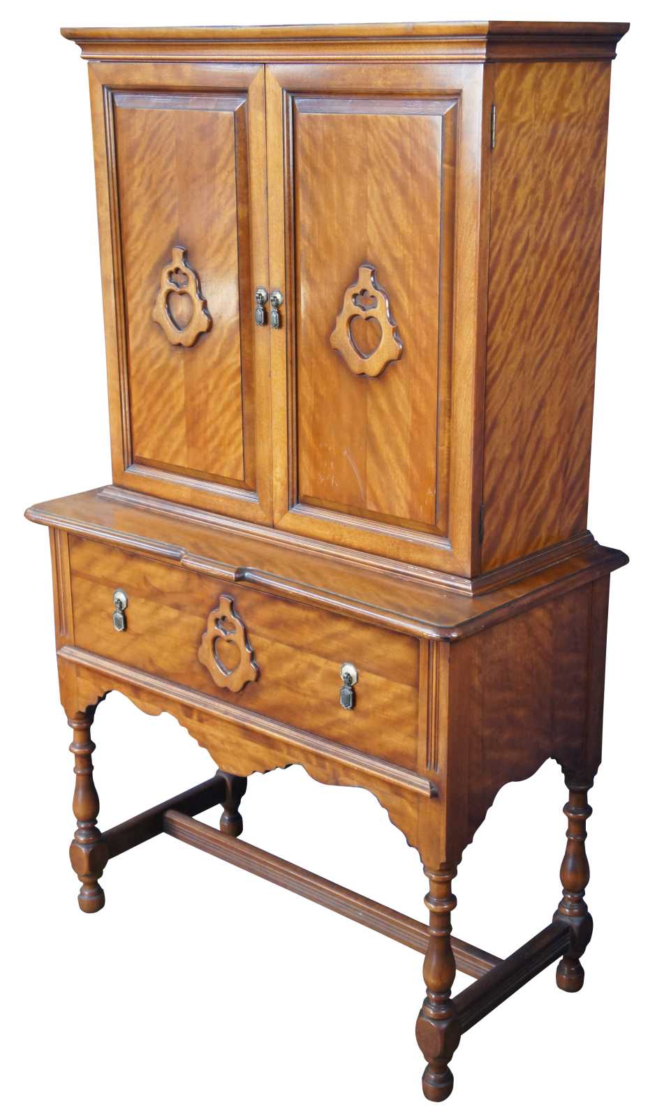 Circa 1940s William & Mary style maple flamed cupboard, cabinet or china hutch featuring old cherry finish with three shelves and lower drawer.