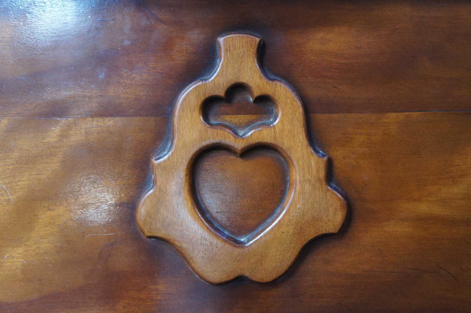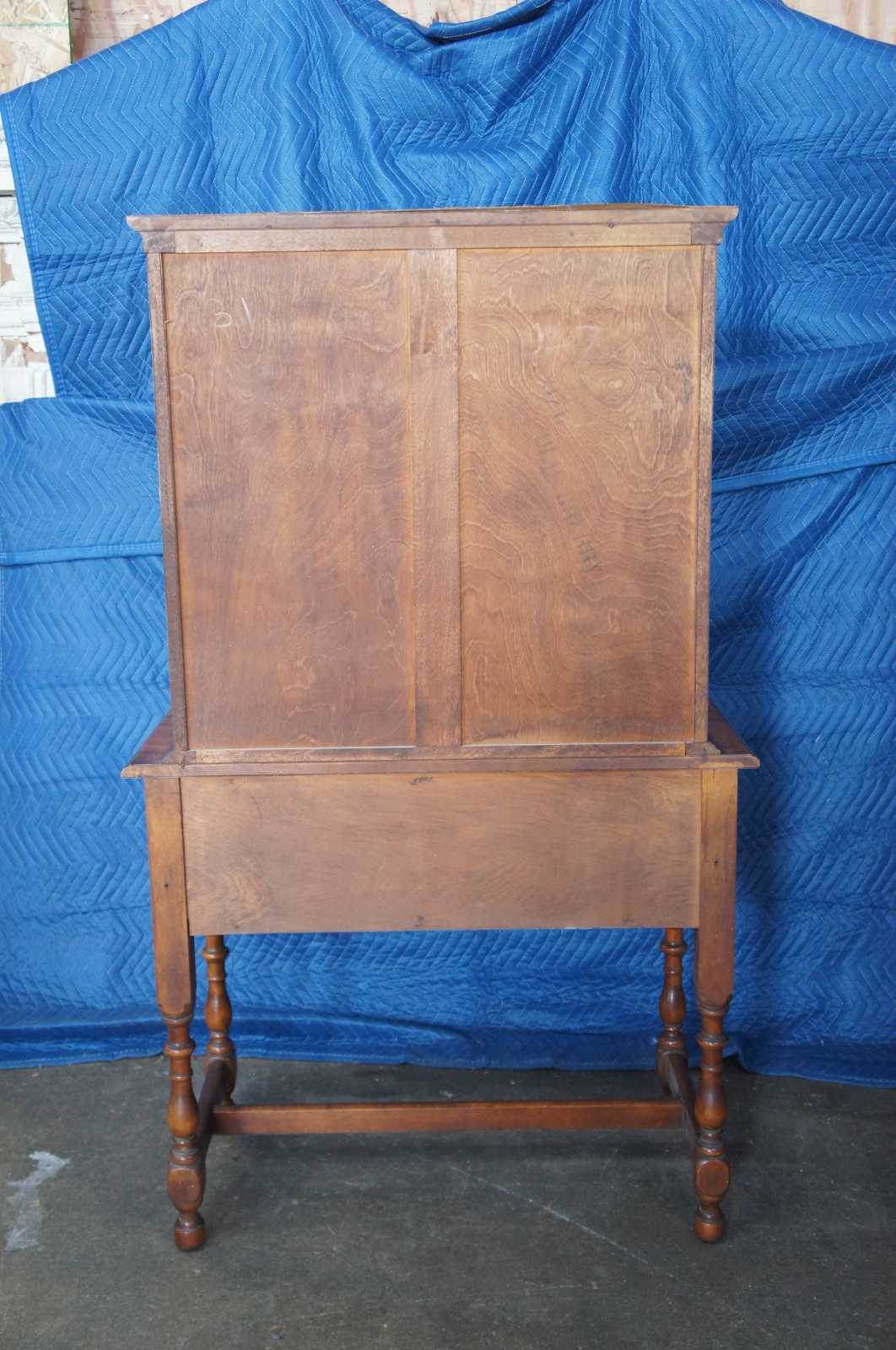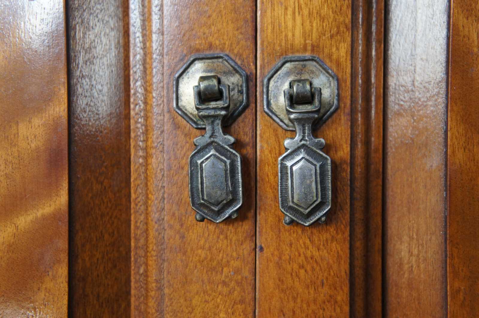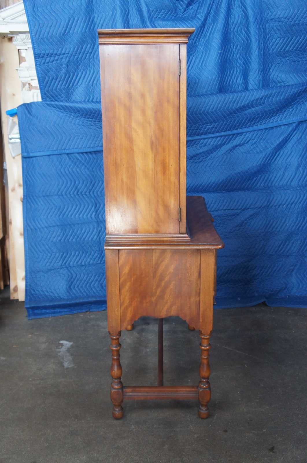 Circa 1940s William & Mary style maple flamed cupboard, cabinet or china hutch featuring old cherry finish with three shelves and lower drawer.