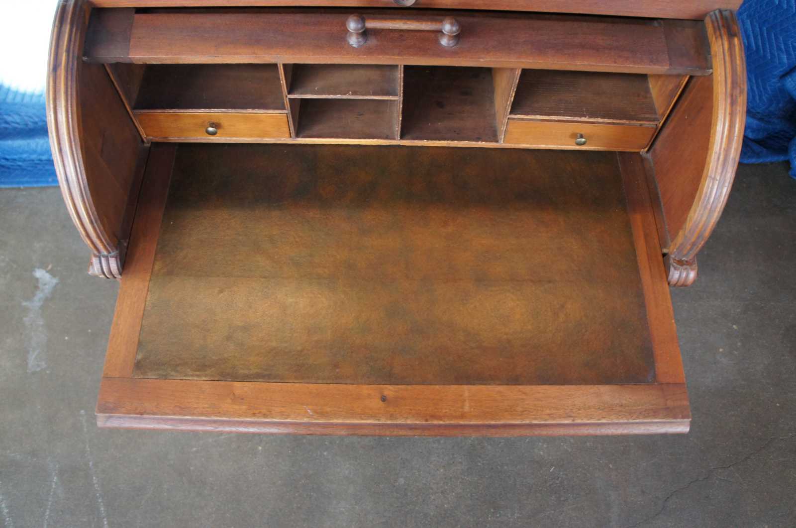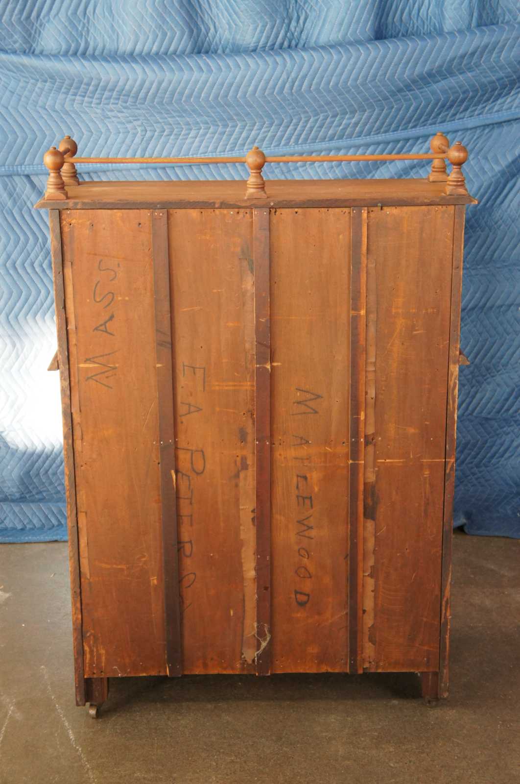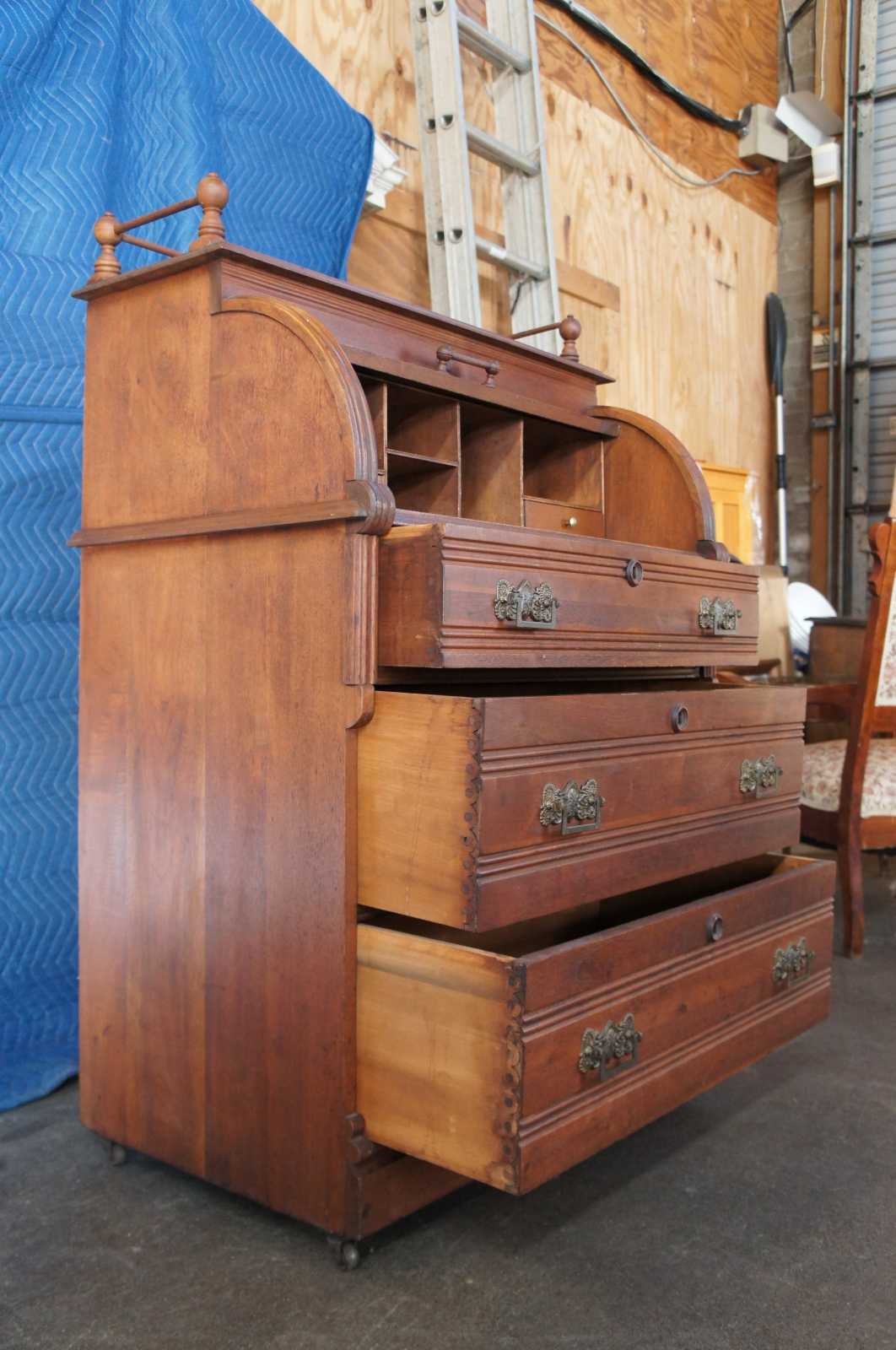 Antique 19th century Aesthetic period cylinder roll top secretary writing desk. Made of maplewood featuring lower chest with three knapp joint drawers, a roll top that opens to leather pullout writing surface with multiple drawers and cubbies, upper ball and stick gallery, and brass hardware with ornate key. Made in Massachusetts by E.A. Peters, circa 1870s.