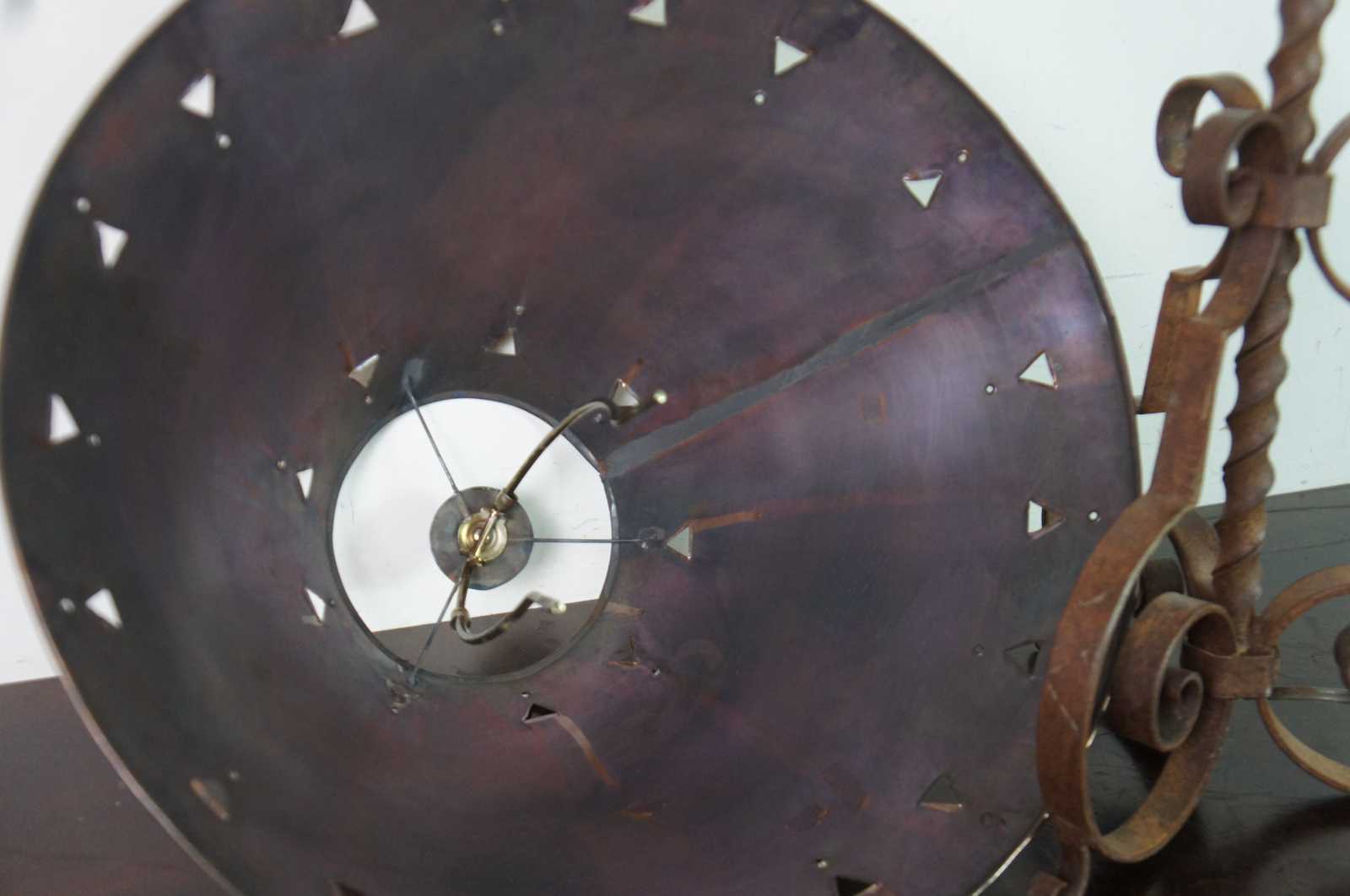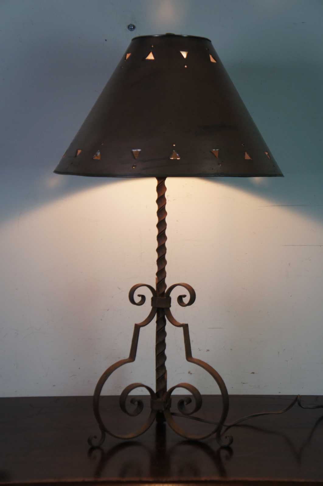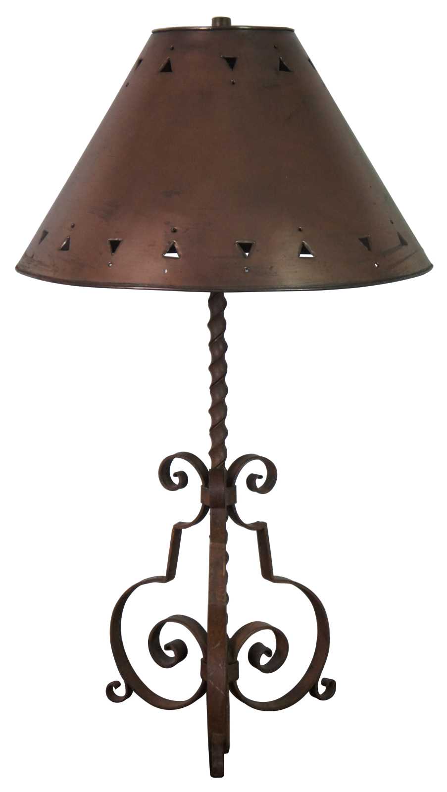 Vintage southwestern rustic wrought iron table lamp with scrolled legs, twisted body and a pierced copper shade.