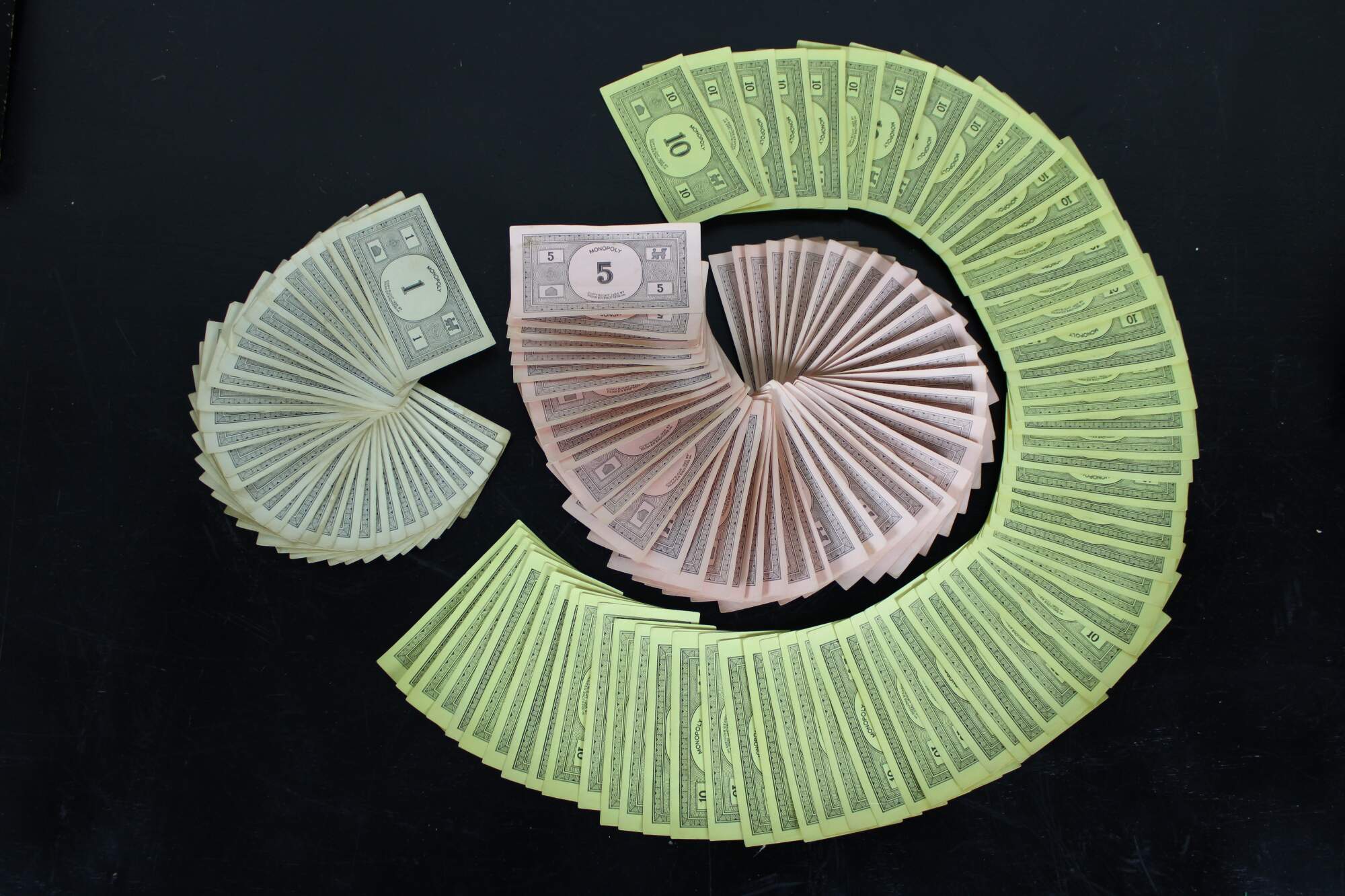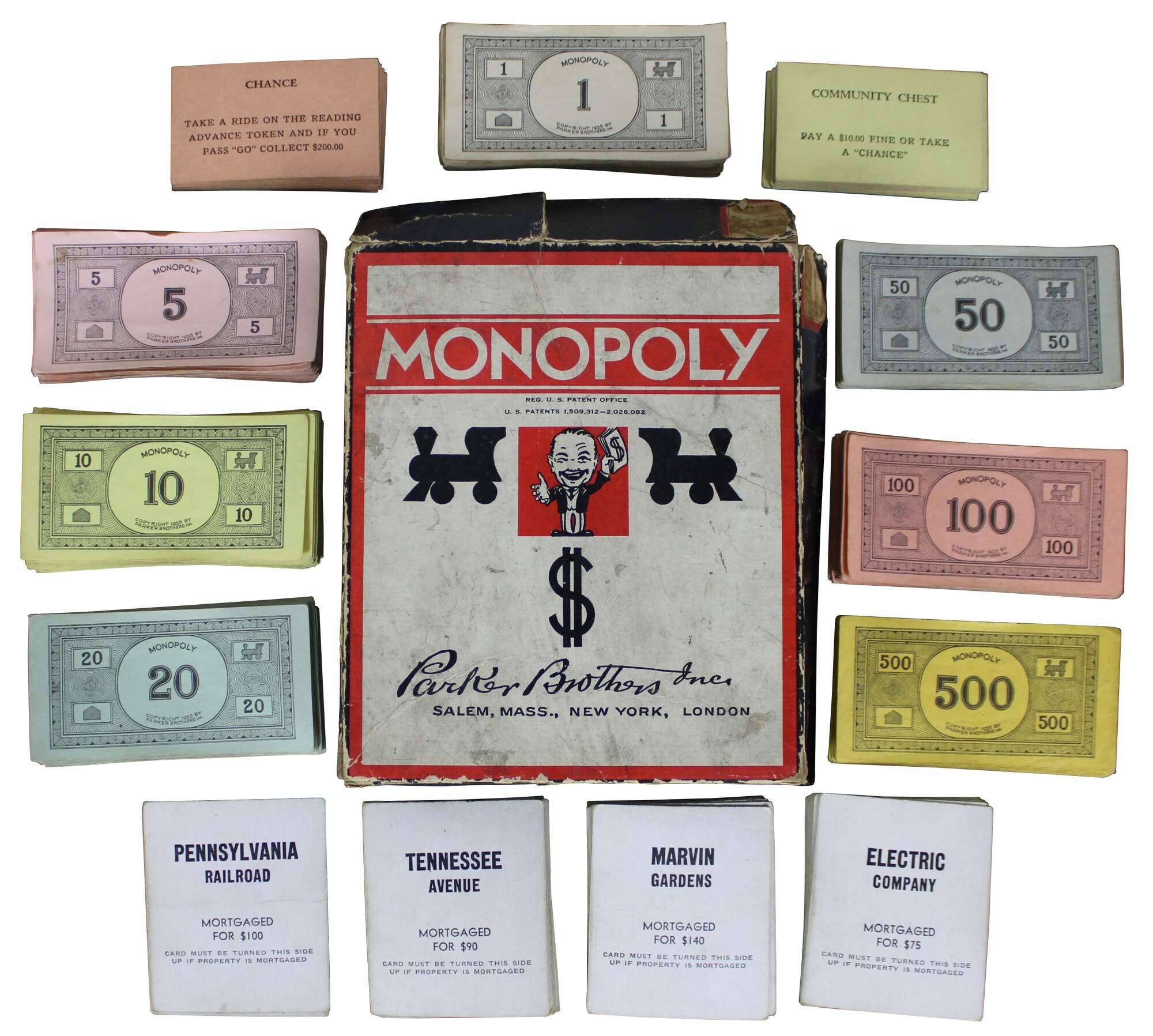 Antique 1935 Parker Brothers game Monopoly, including Instruction sheet, 32 Chance/Community Chest cards, 28 Title Deed cards, 12 red hotel pieces, 28 green house pieces, cash in denominations $1, $5, $10, $20, $50, $100, and $500, two mismatched wooden dice, and six metal playing pieces (Thimble marked For a Good Girl, Race Car, Top Hat, Boot, Ship, and Iron).