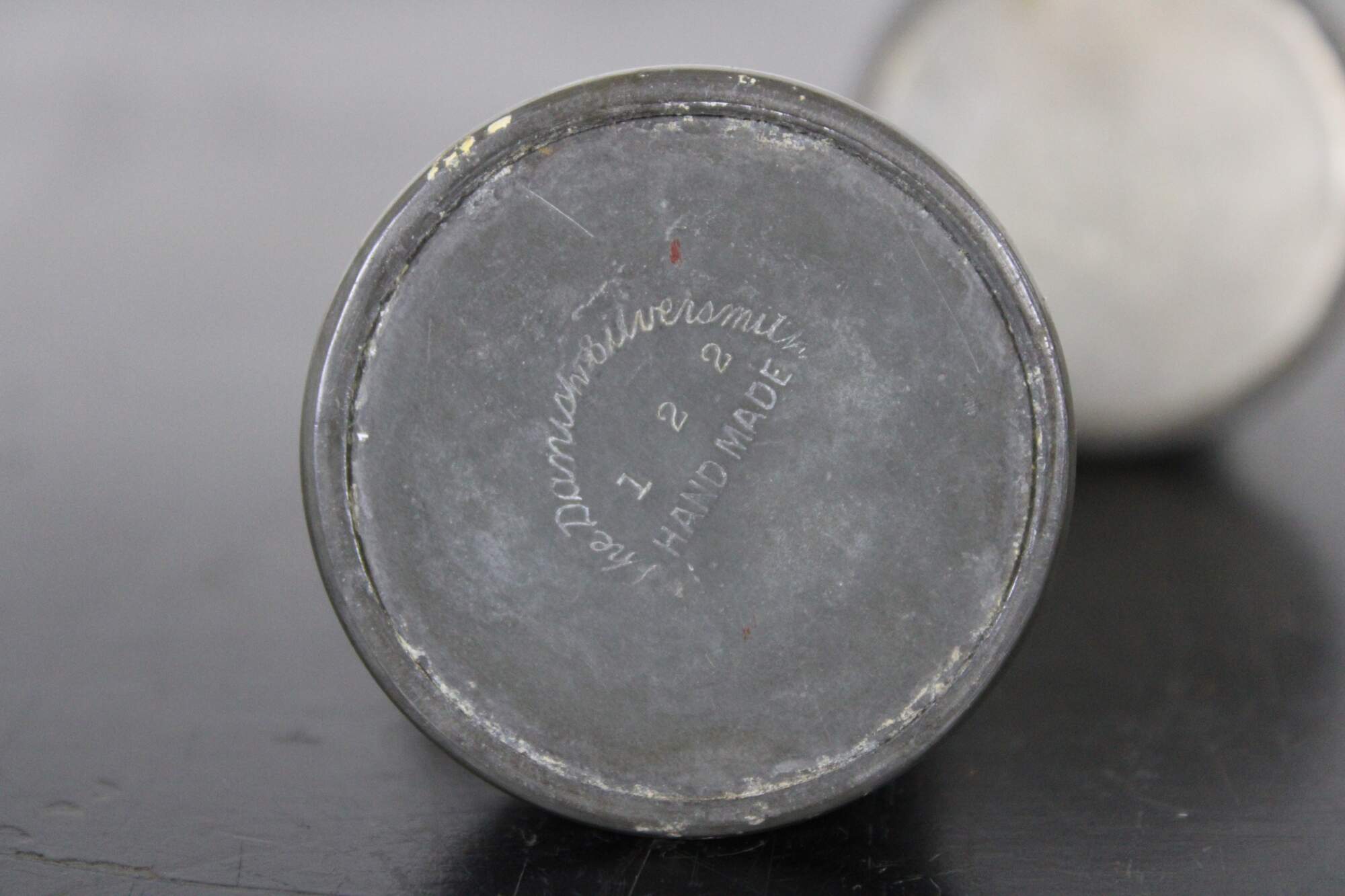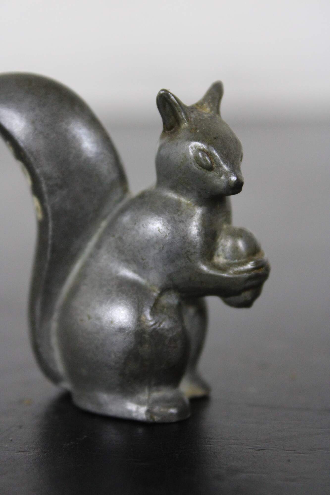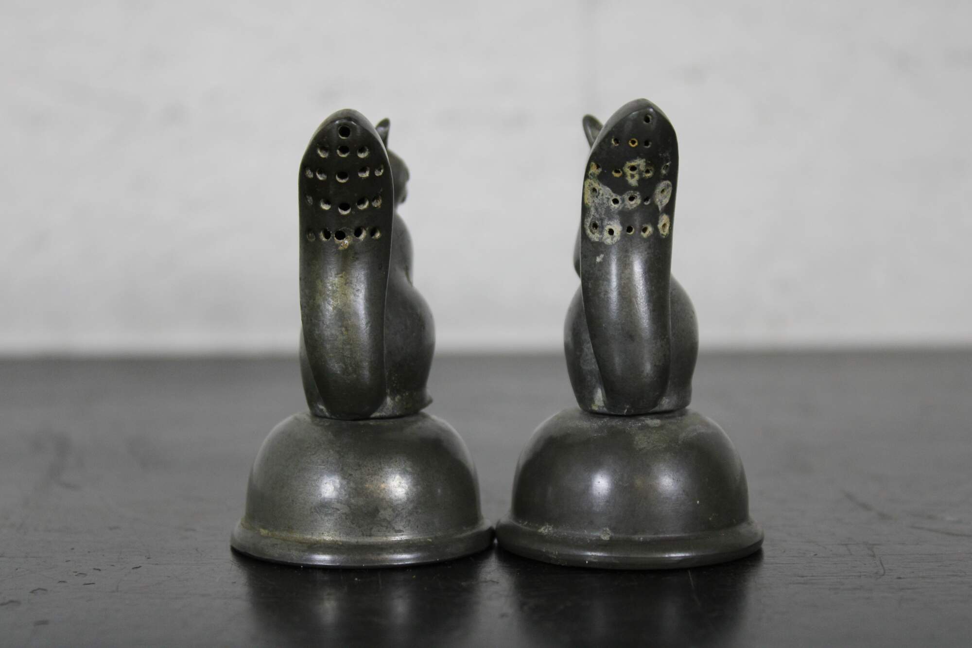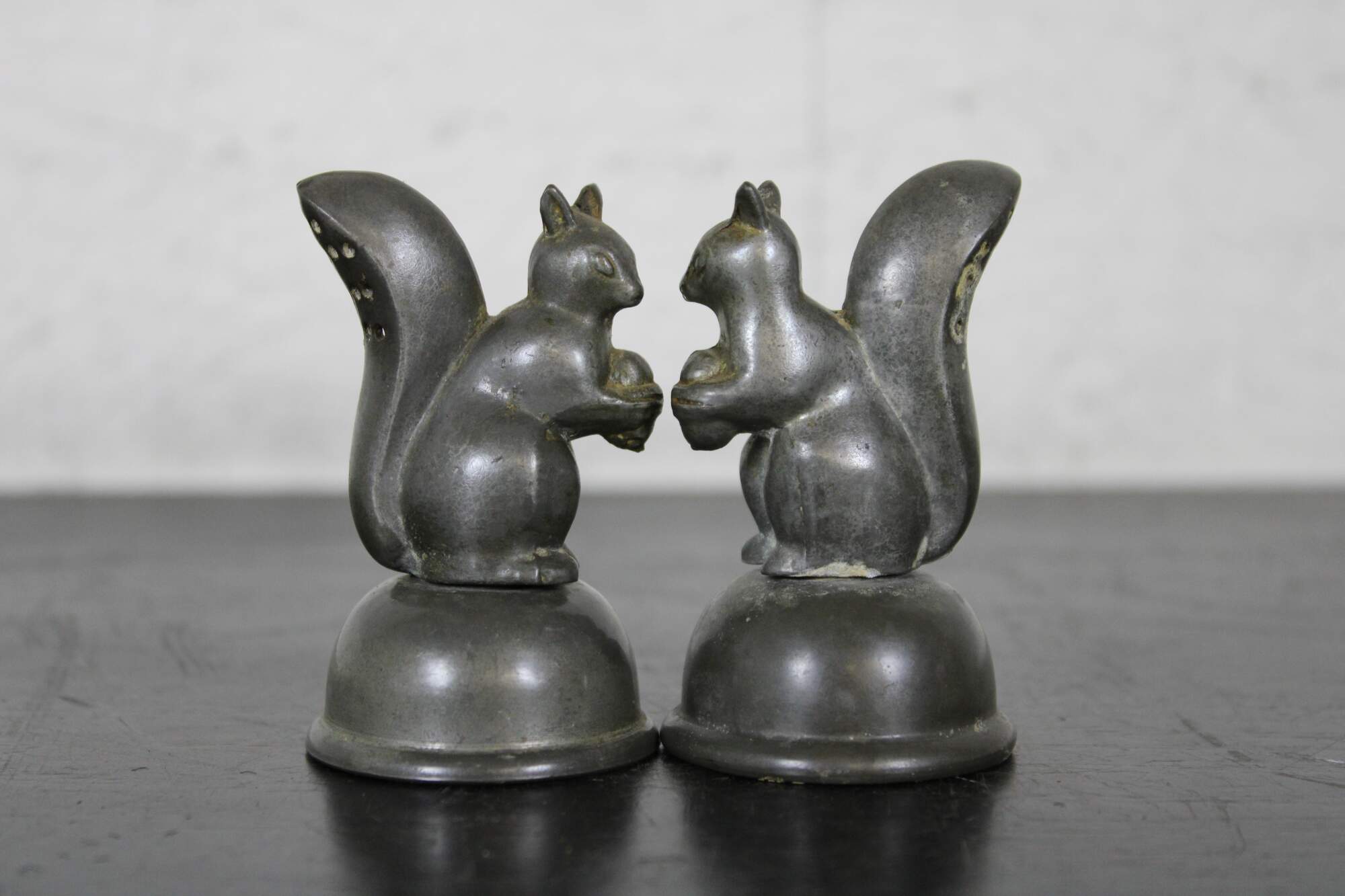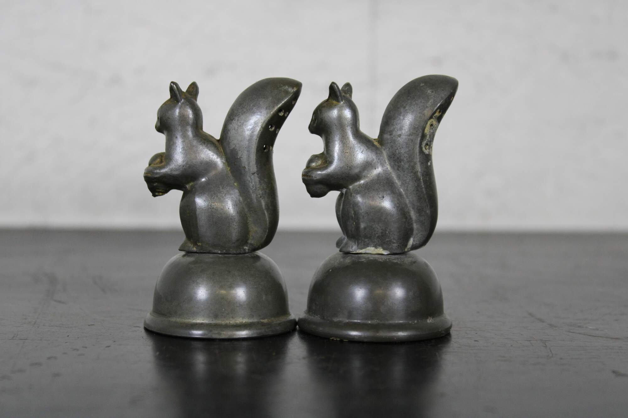 Vintage mid century modern pewter salt and pepper shakers in the shape of squirrels on round bases, holding a nut, hand made by The Danish Silversmith.