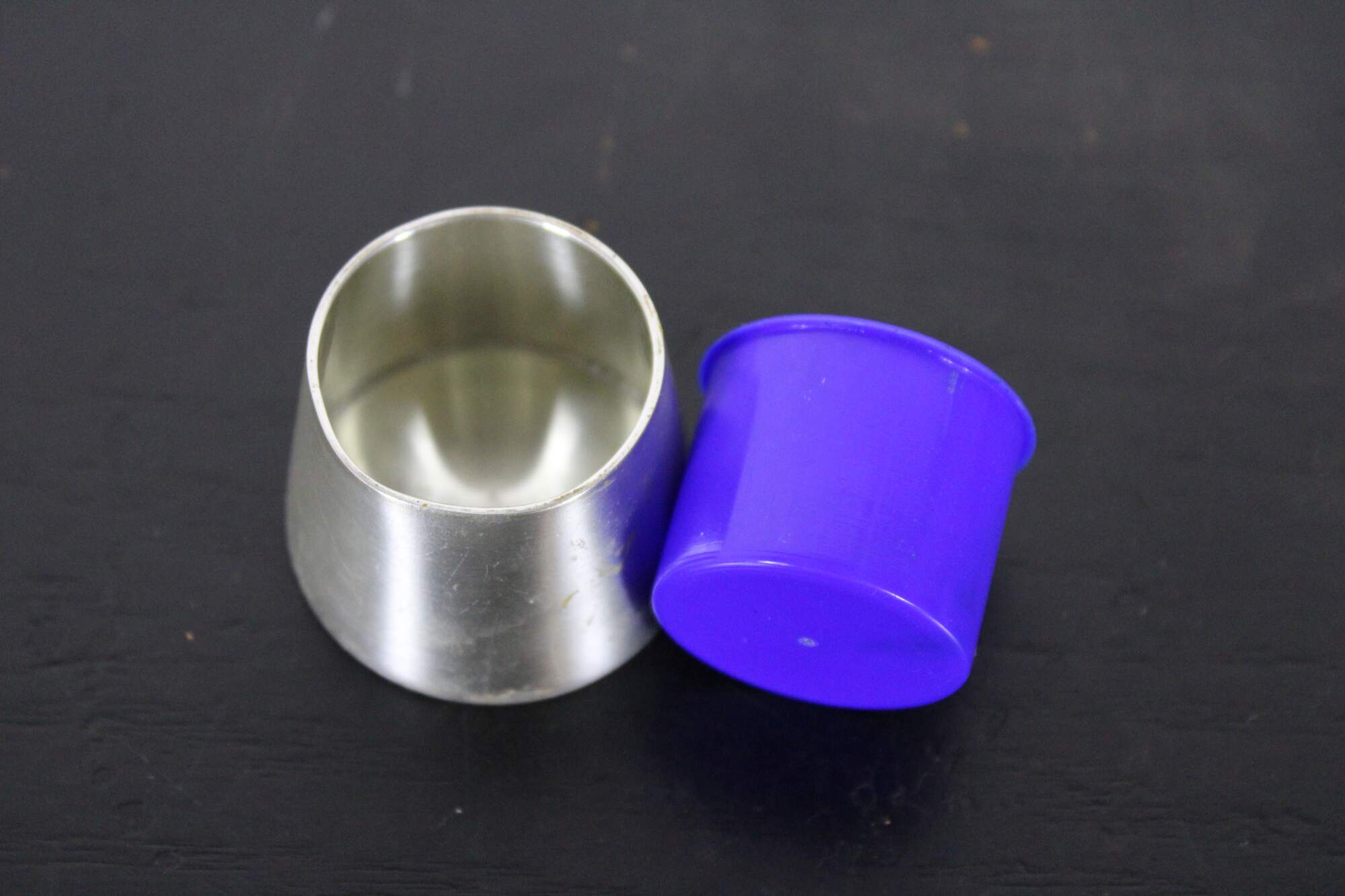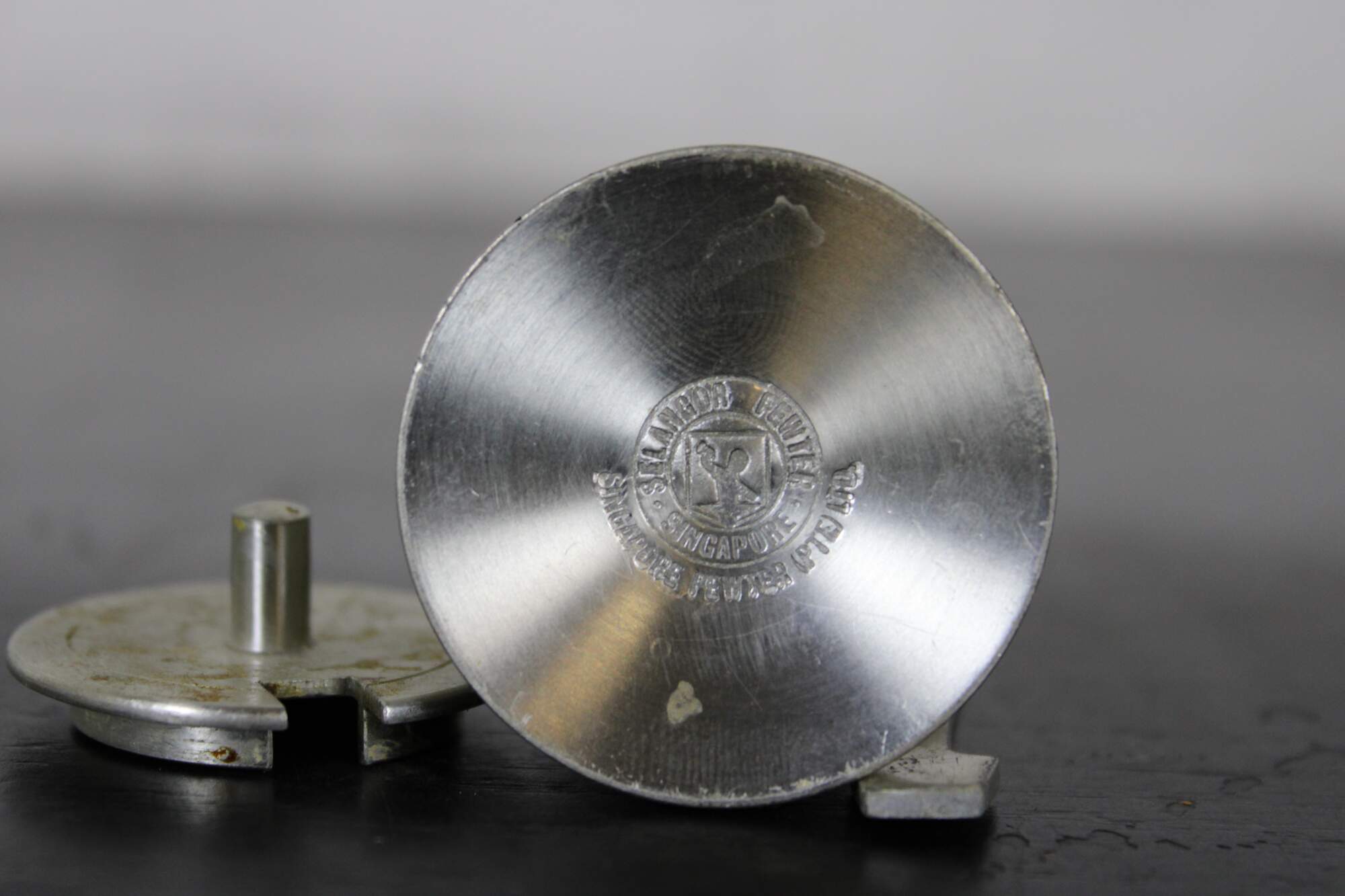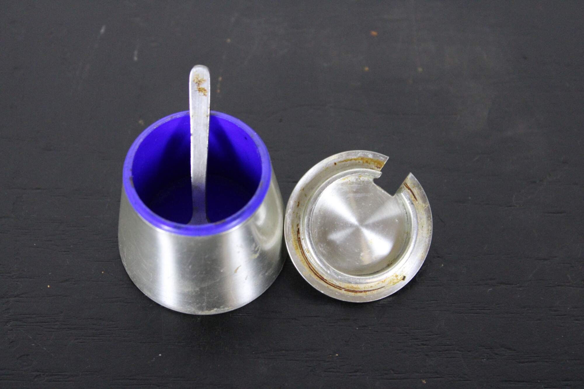 Vintage Selangor pewter lidded mustard pot with spoon and blue plastic insert.