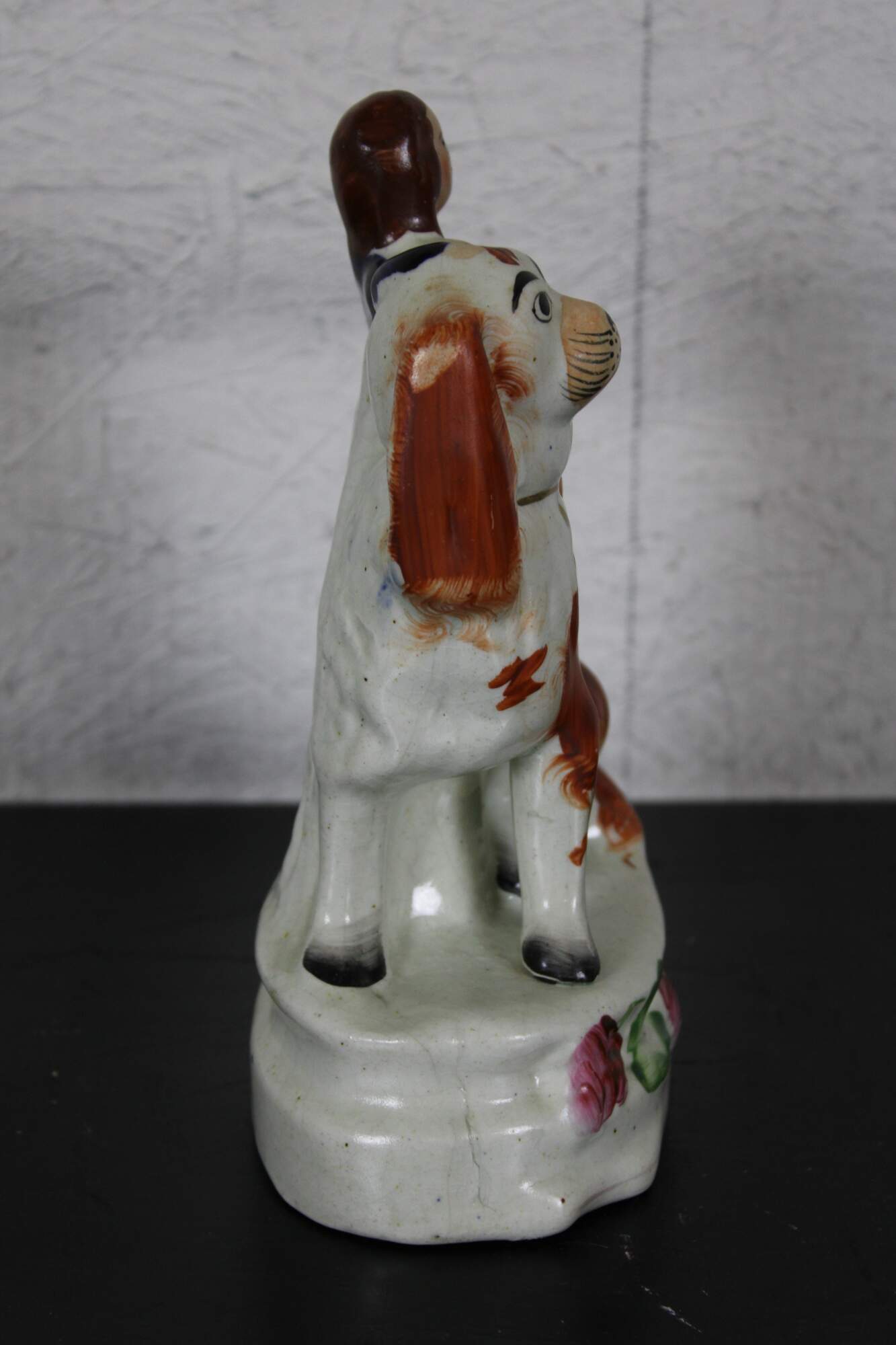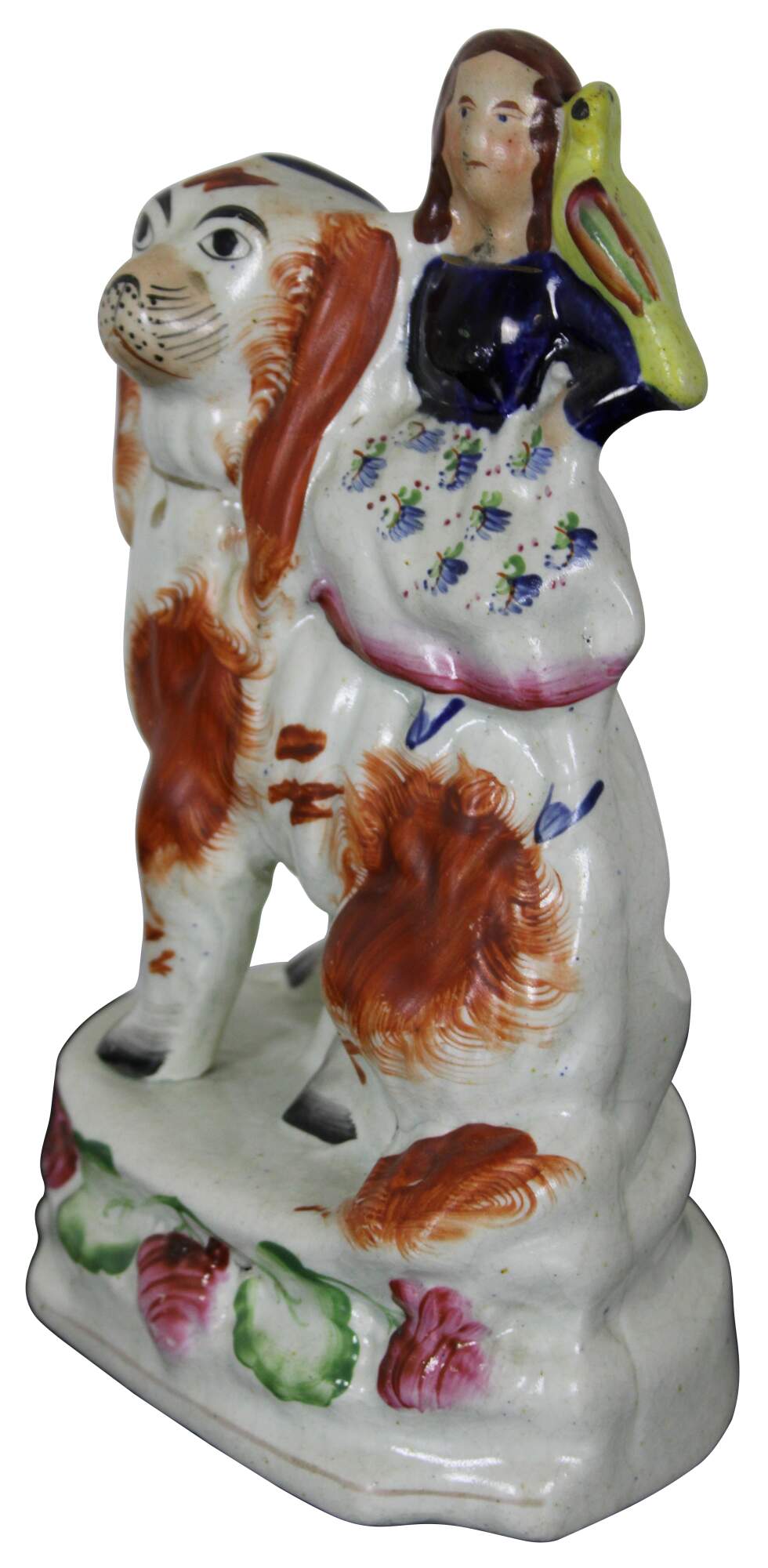 Antique 19th Century Staffordshire porcelain figurine featuring a small girl with a yellow bird on her shoulder, seated on an oversized red and white King Charles Spaniel, mounted on a floral base.