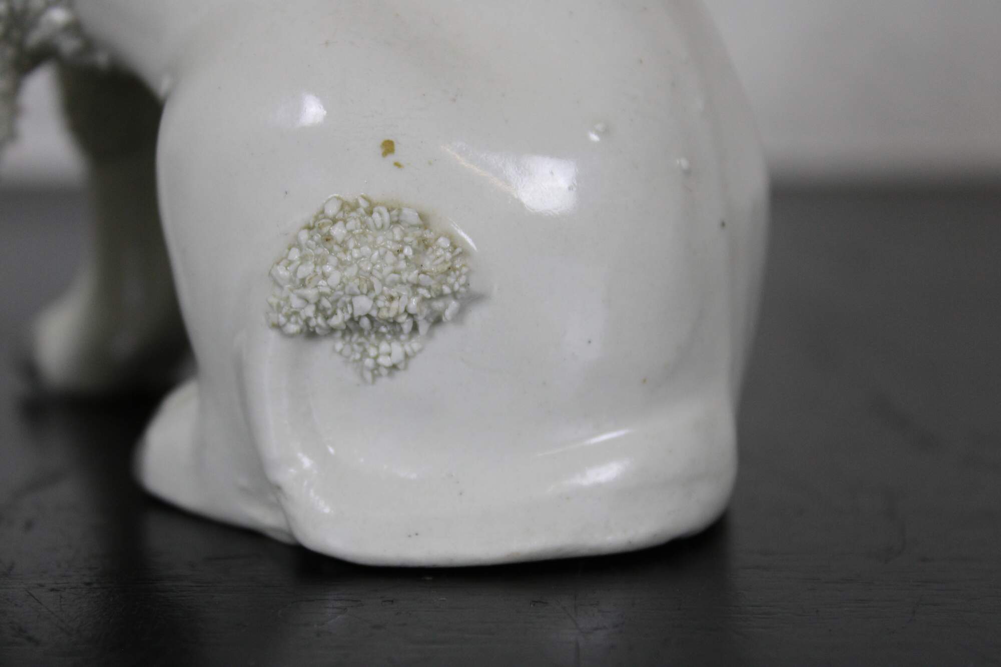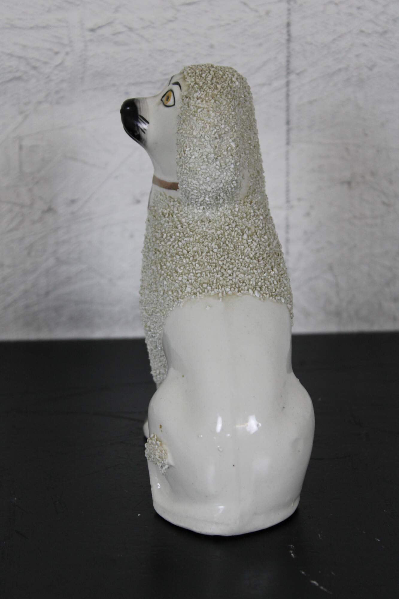 Antique 19th century Staffordshire porcelain figurine in the shape of a white poodle with “confetti” fur and metallic collar.