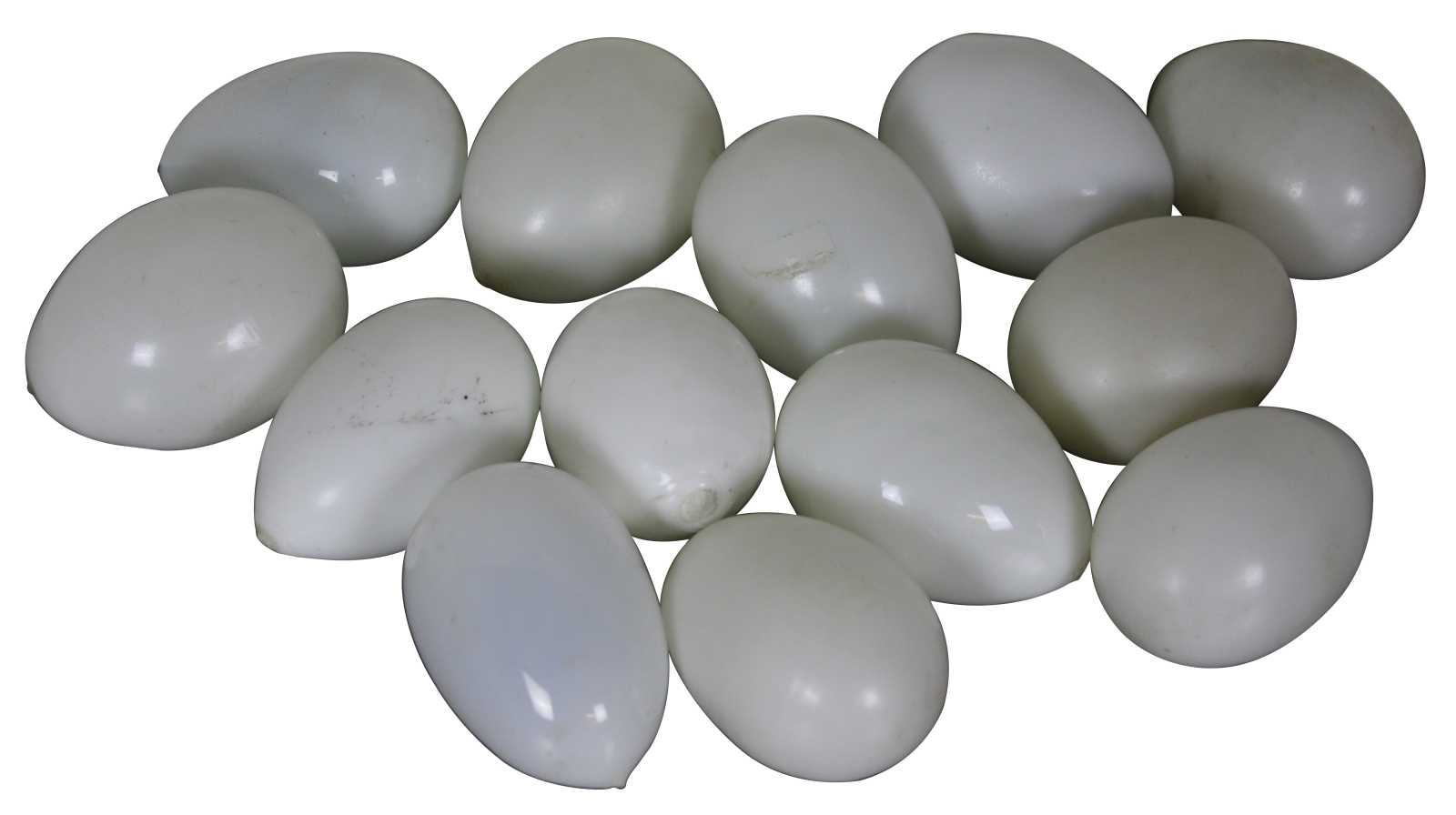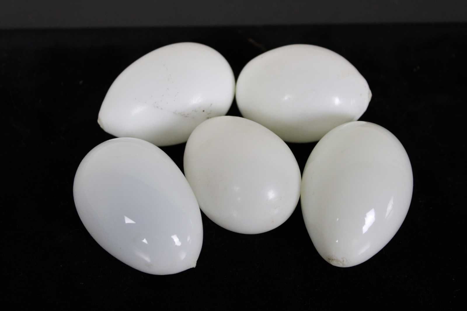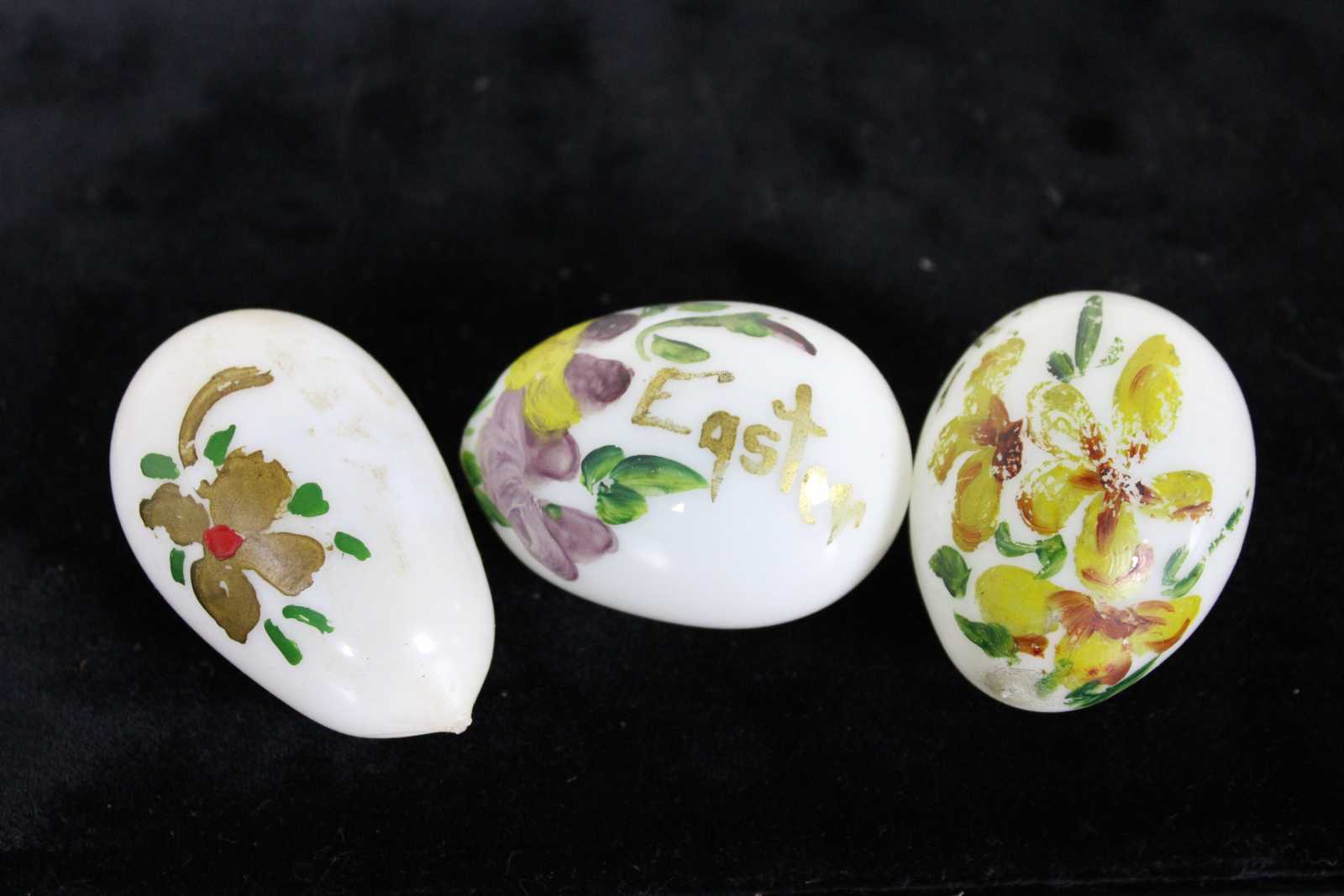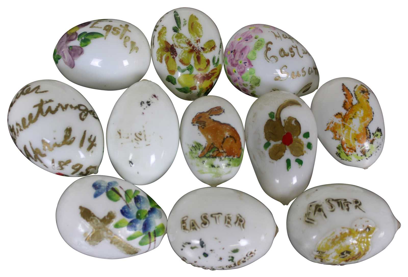 Lot of 24 assorted antique Victorian milk glass eggs, 13 plain/paint worn away, and 11 painted and/or embossed with raised designs, all aprroximately the size of real chicken eggs.