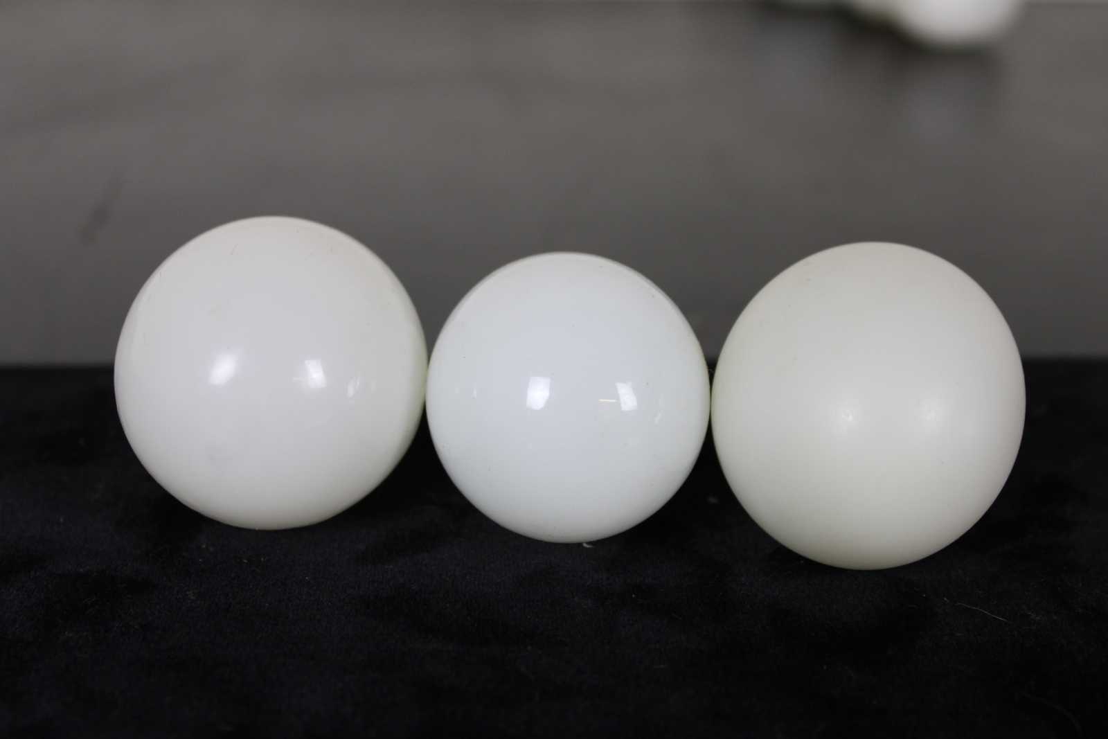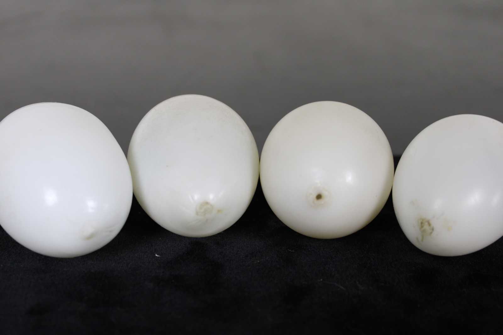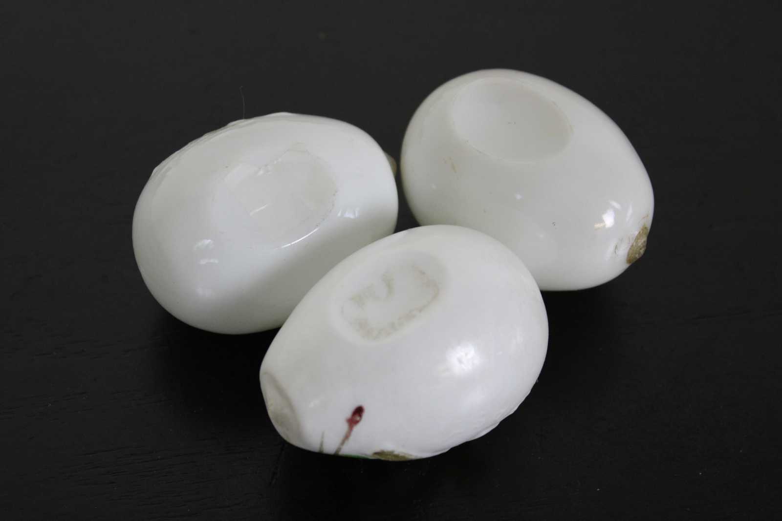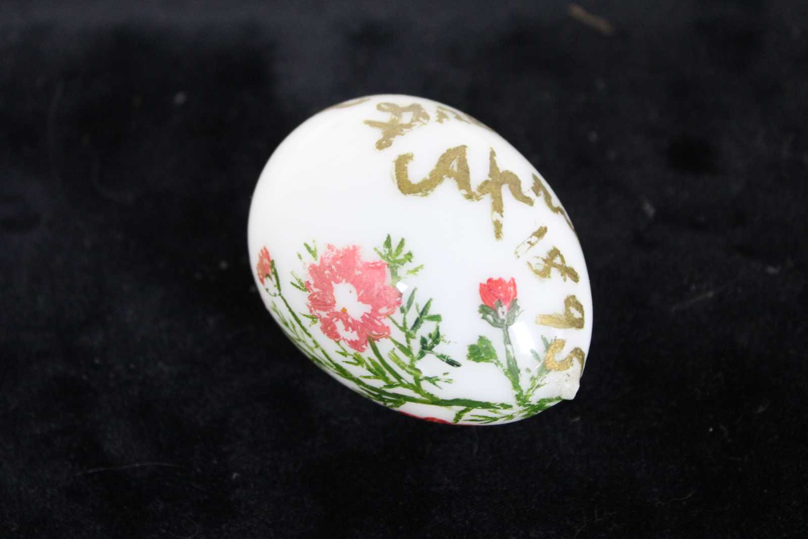 Lot of 24 assorted antique Victorian milk glass eggs, 13 plain/paint worn away, and 11 painted and/or embossed with raised designs, all aprroximately the size of real chicken eggs.
