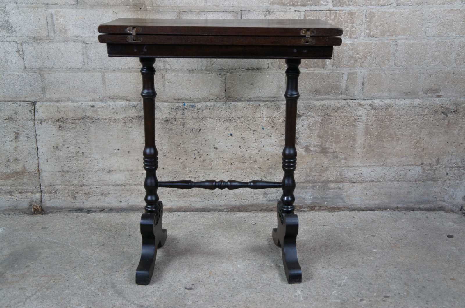 Duncan Phyfe inspired petite flip top game table. Made from walnut with a trestle base.