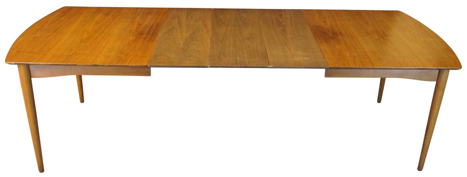 Mid century modern Morganton walnut dining table featuring Danish styling with rectangular form, rounded ends, tapered legs and extra leaves.