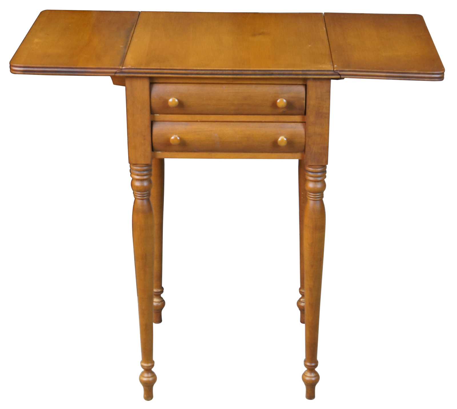 Antique Conant & Ball drop leaf pedestal side table / plant stand / nightstand. Made of maple featuring two drop leaves and two drawers supported by long turned legs. Conant & Ball were famous for reproductions of old New England Furniture.
