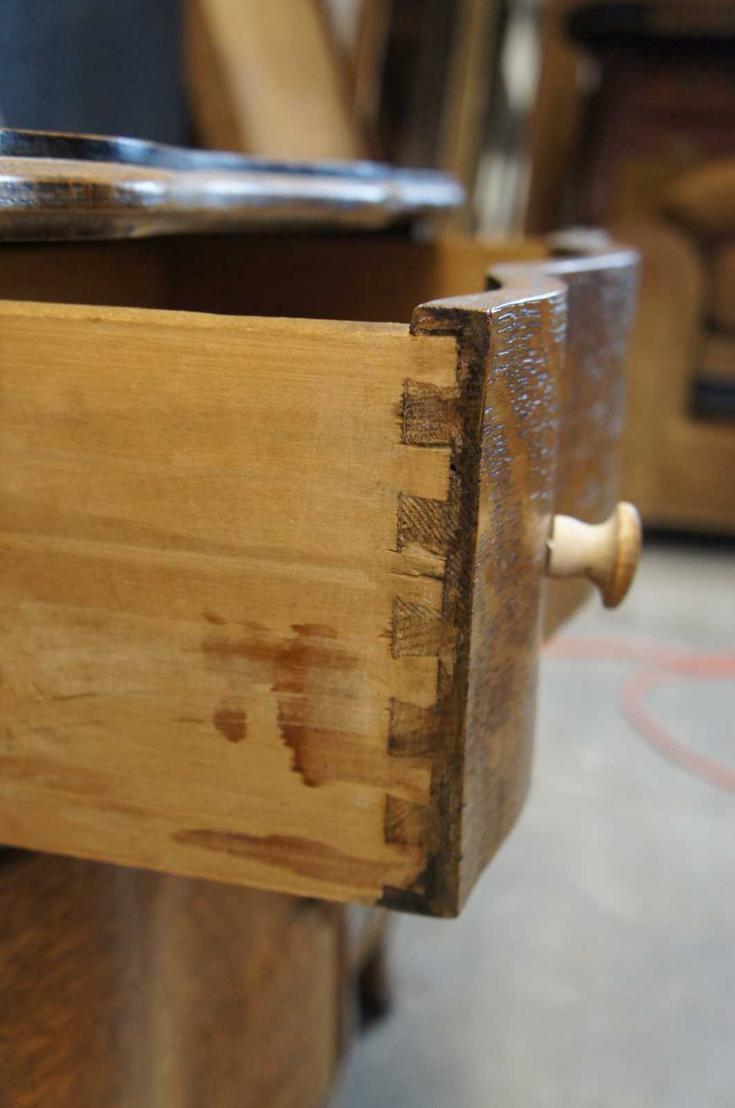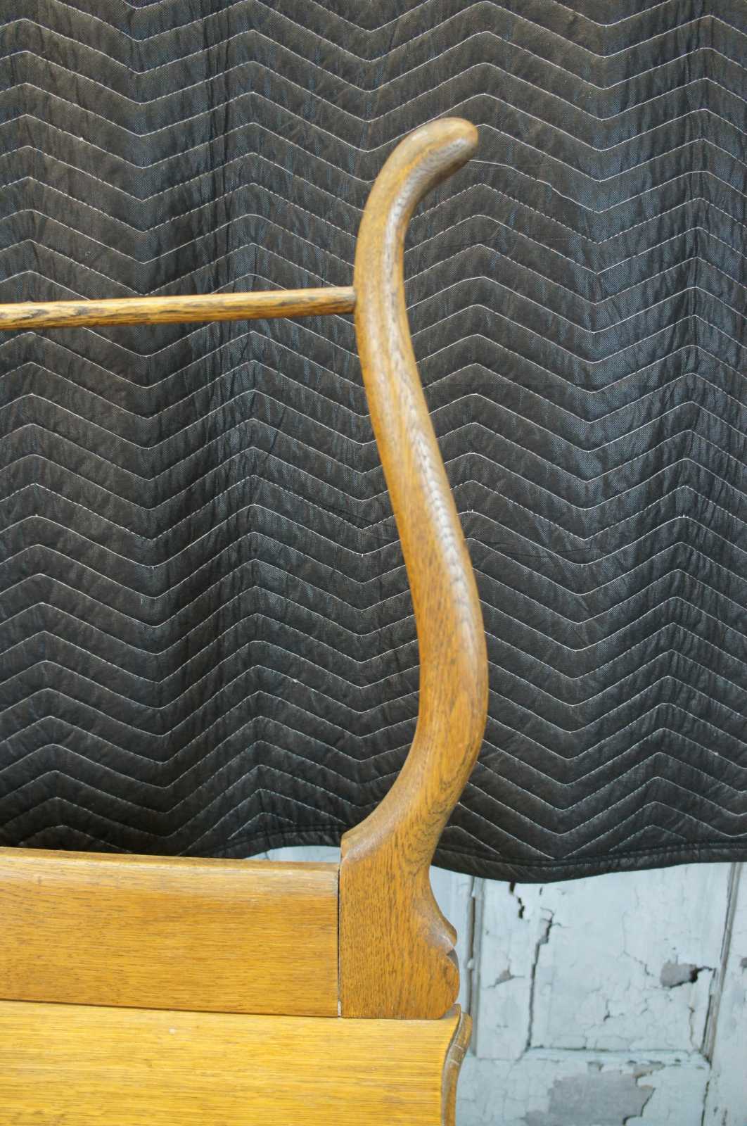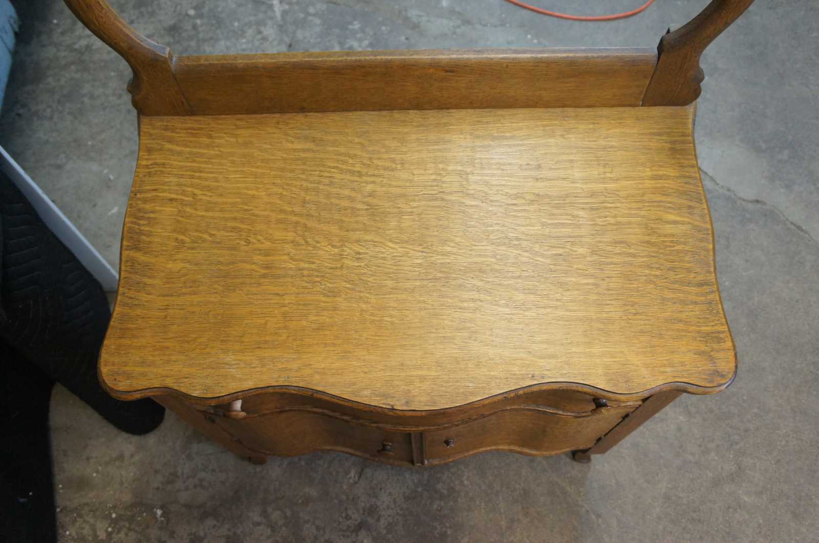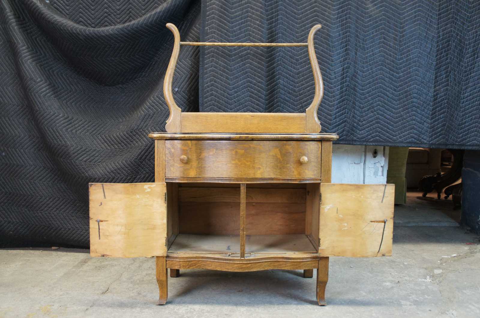 Antique early American wash stand, dry sink or commode. Made of quartersawn oak featuring serpentine form with lower cabinet, one drawer and upper towel bar.