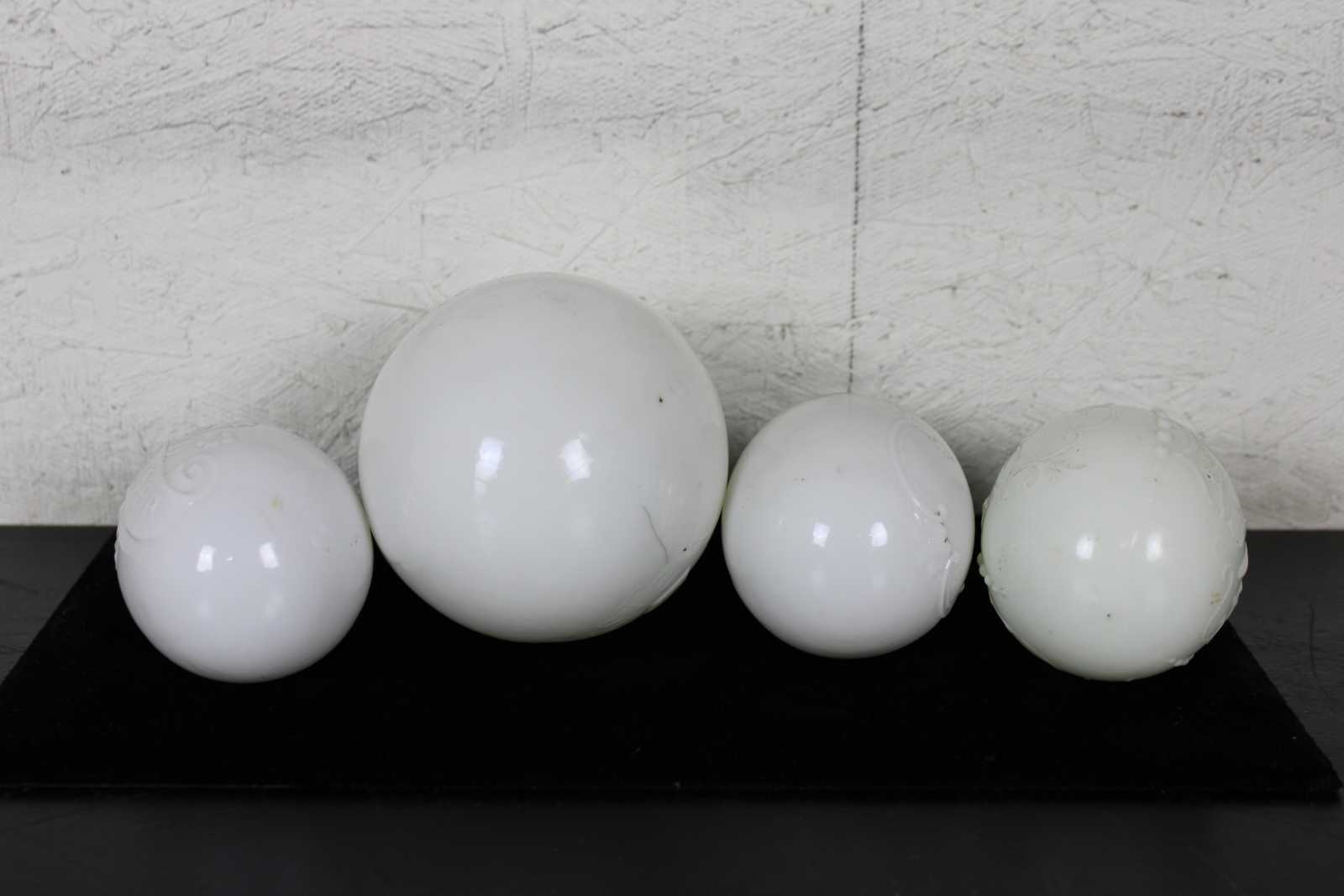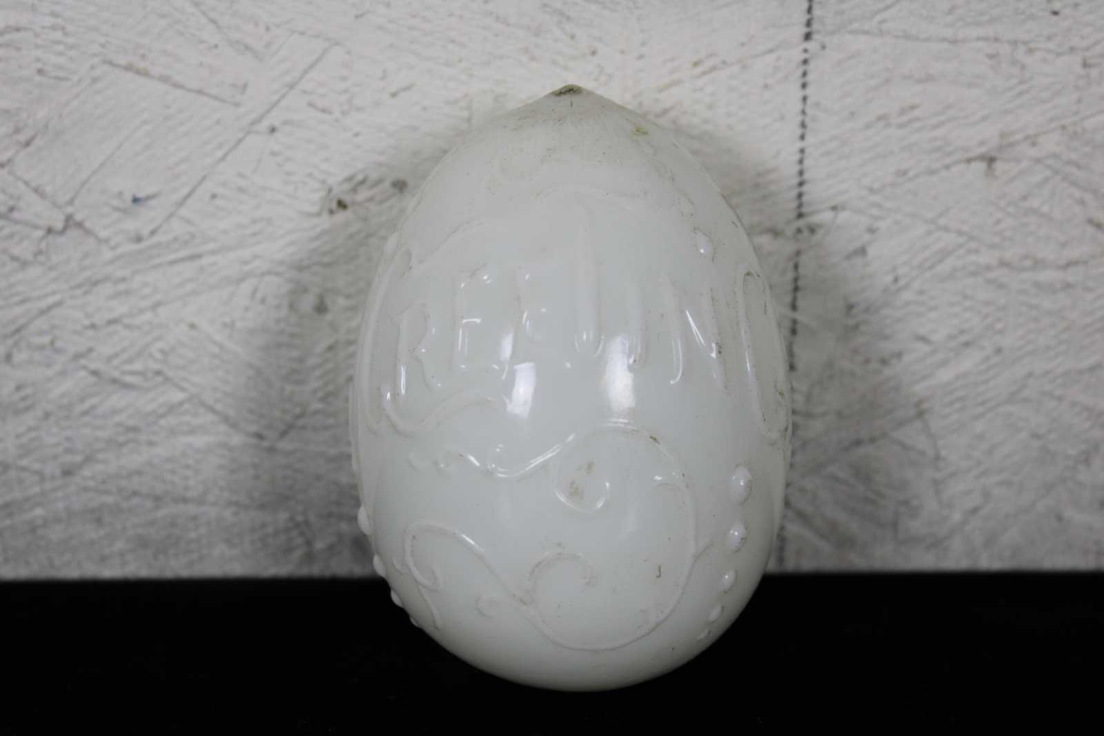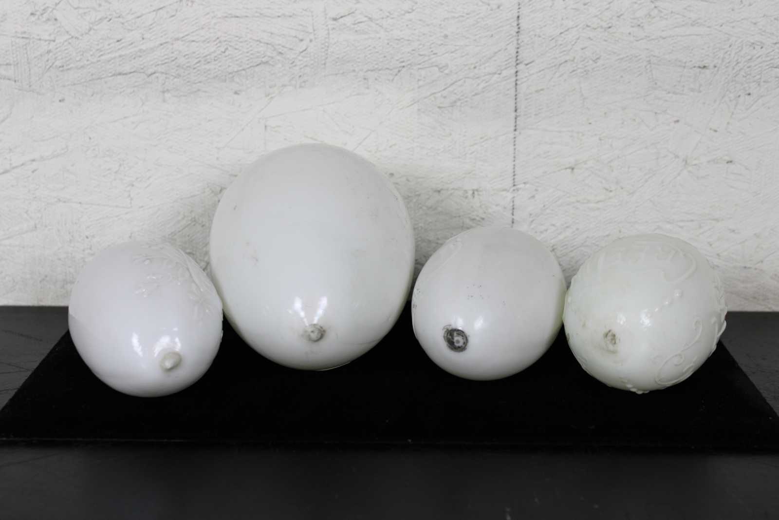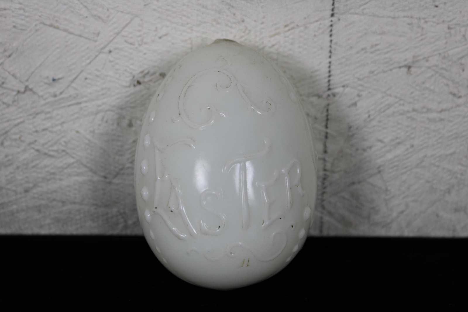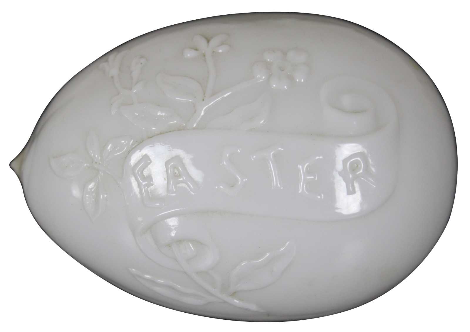 Lot of 4 antique embossed Victorian milk glass Easter eggs; patterns include “Easter” with a cross, “Easter Greeting” with raised patterns, “Easter” on a scroll with daisies, and a raised scrolled frame.