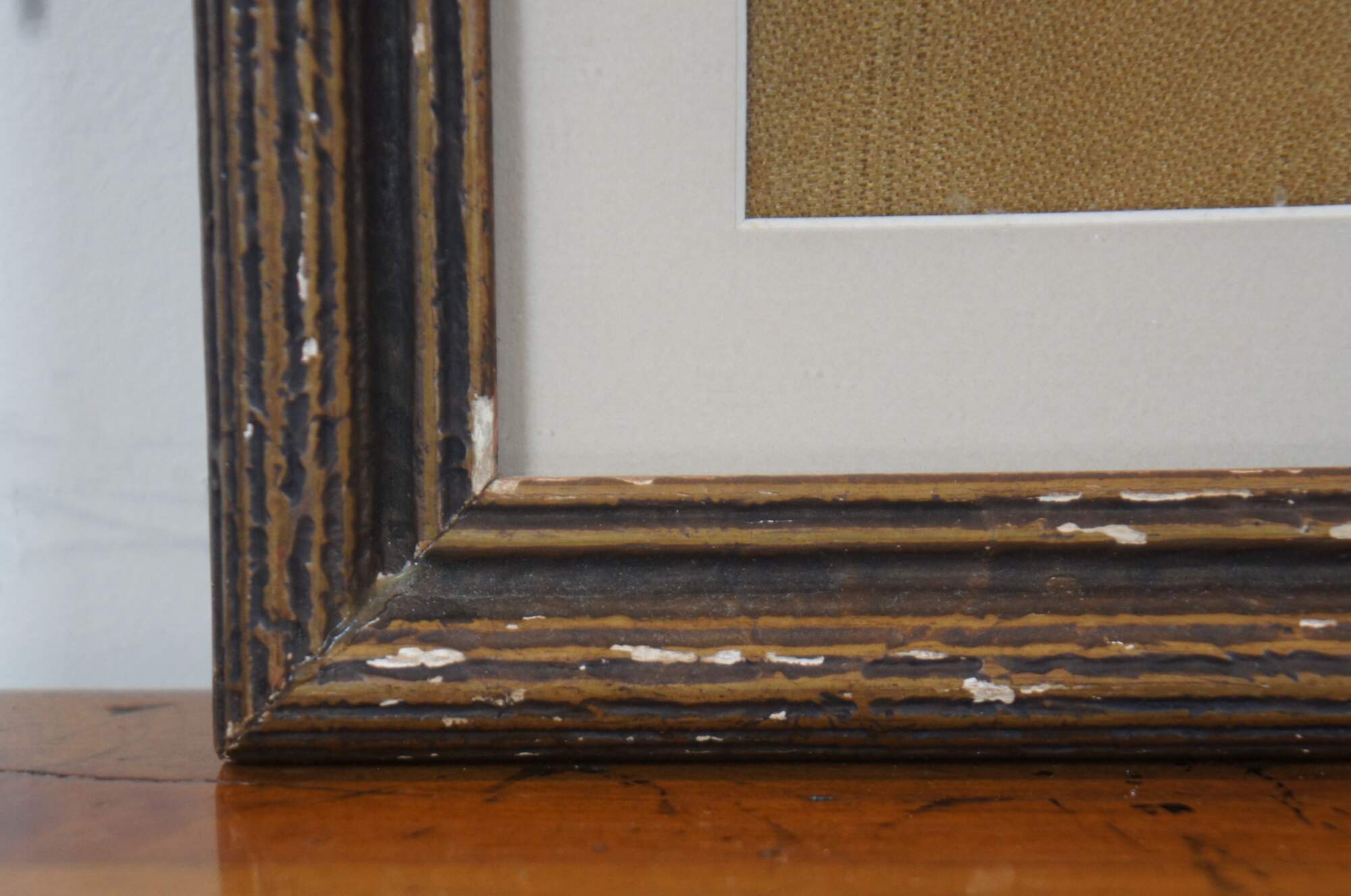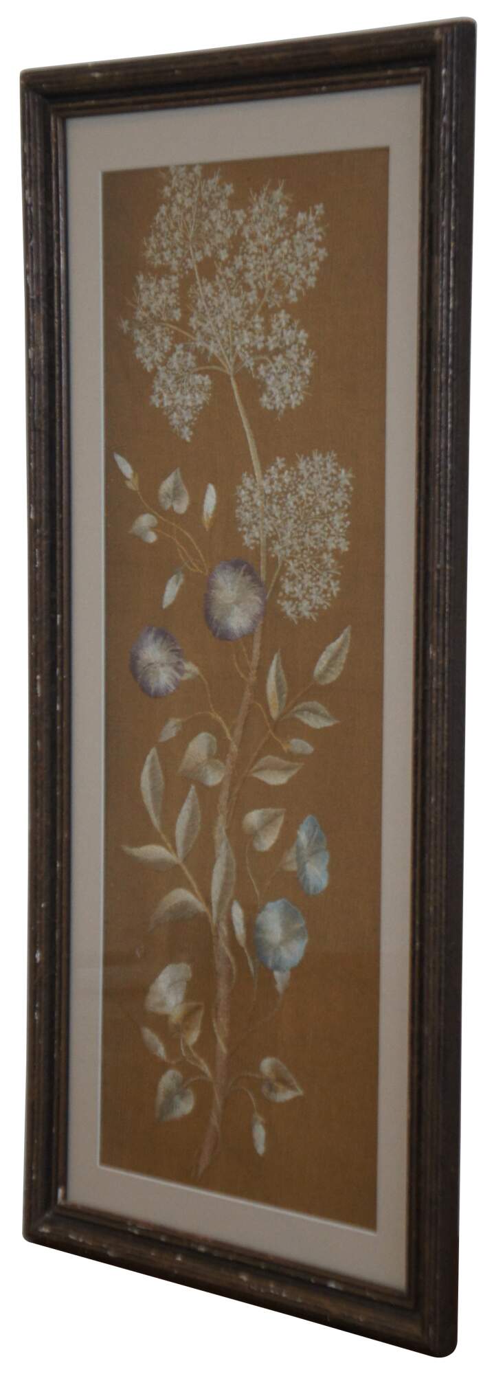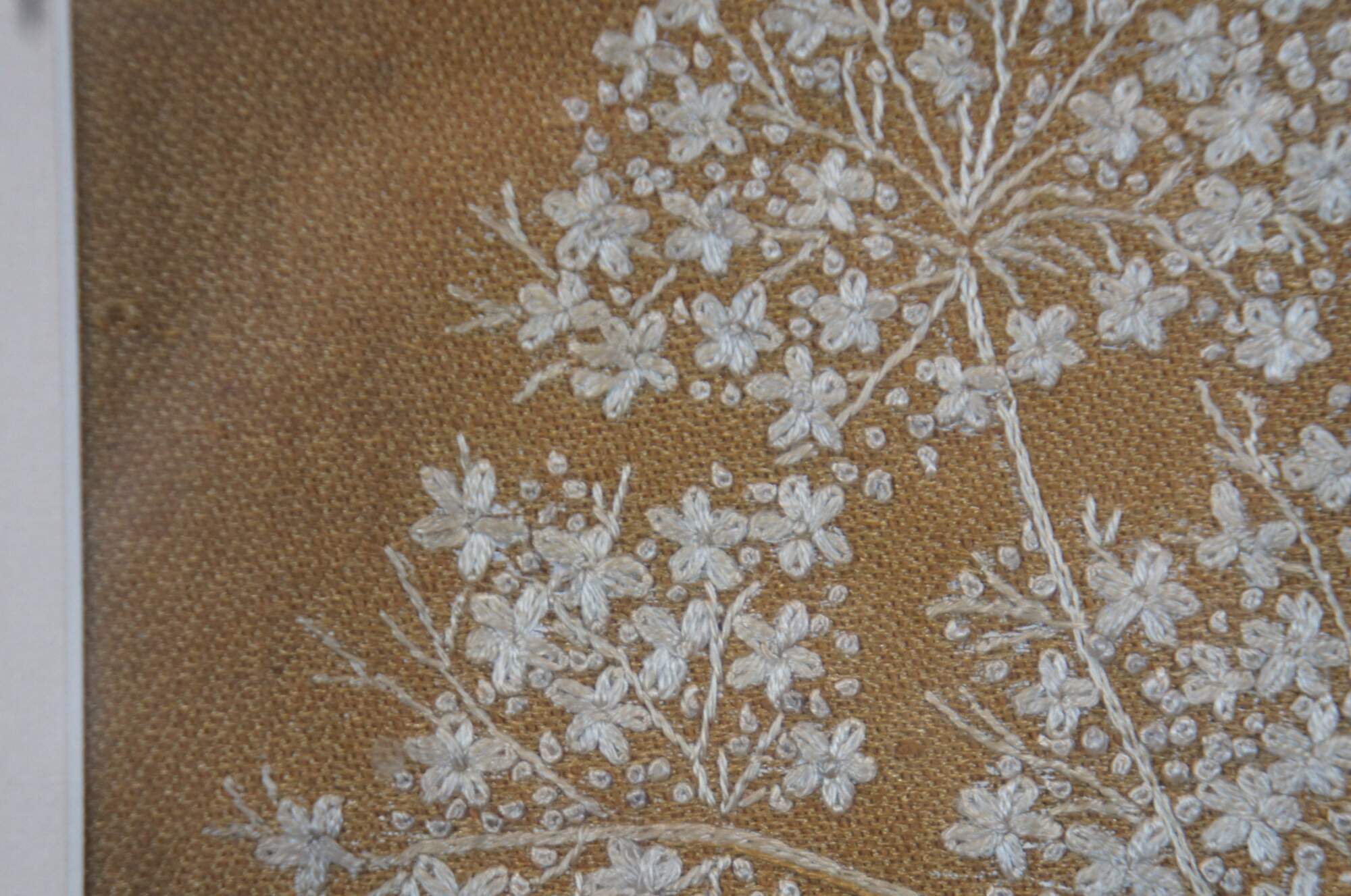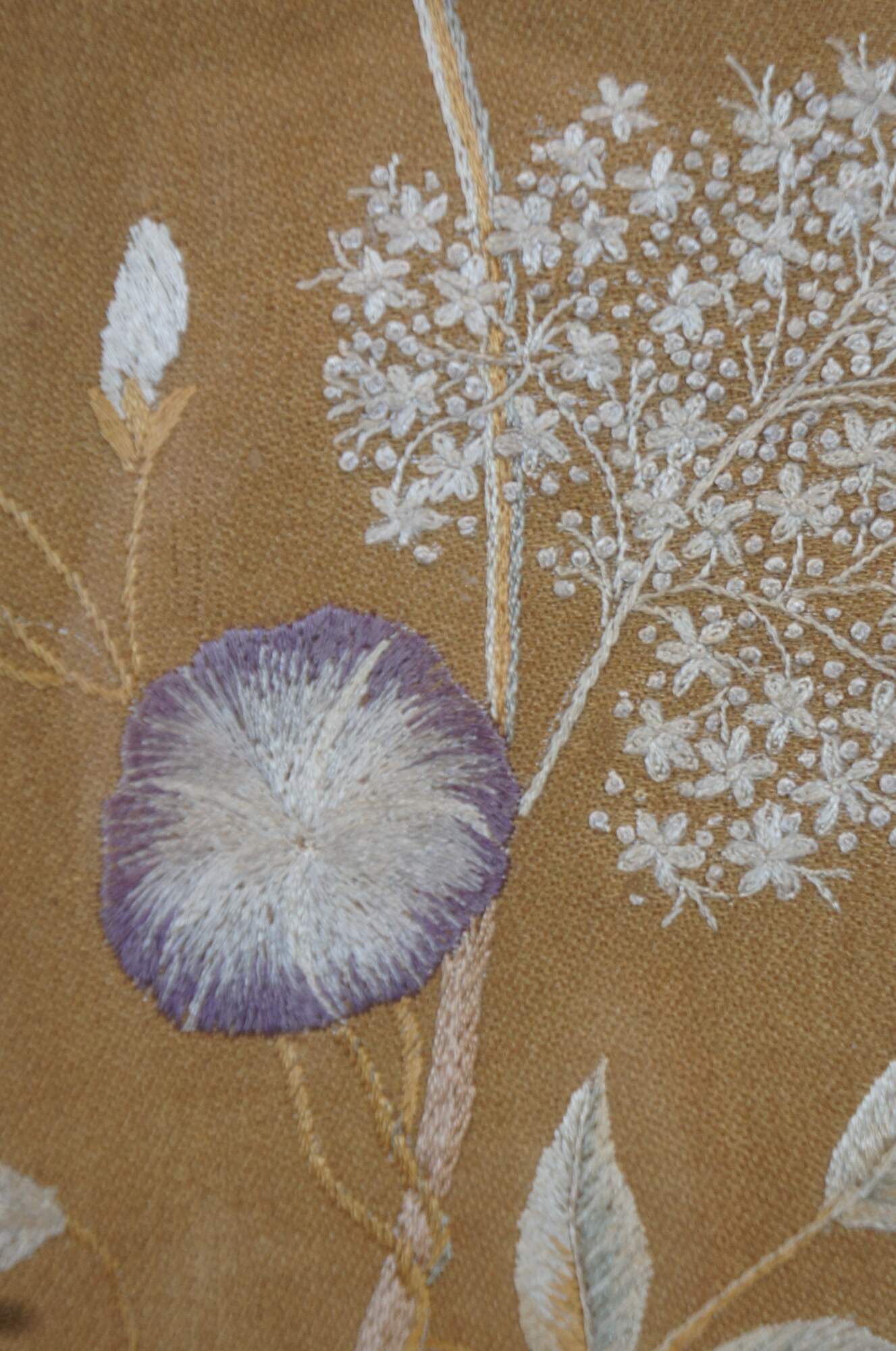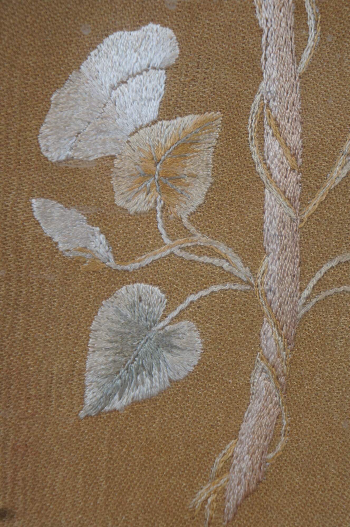 Mid century famed embroidery panel showing a morning glory vine wrapping around a flowering shrub.