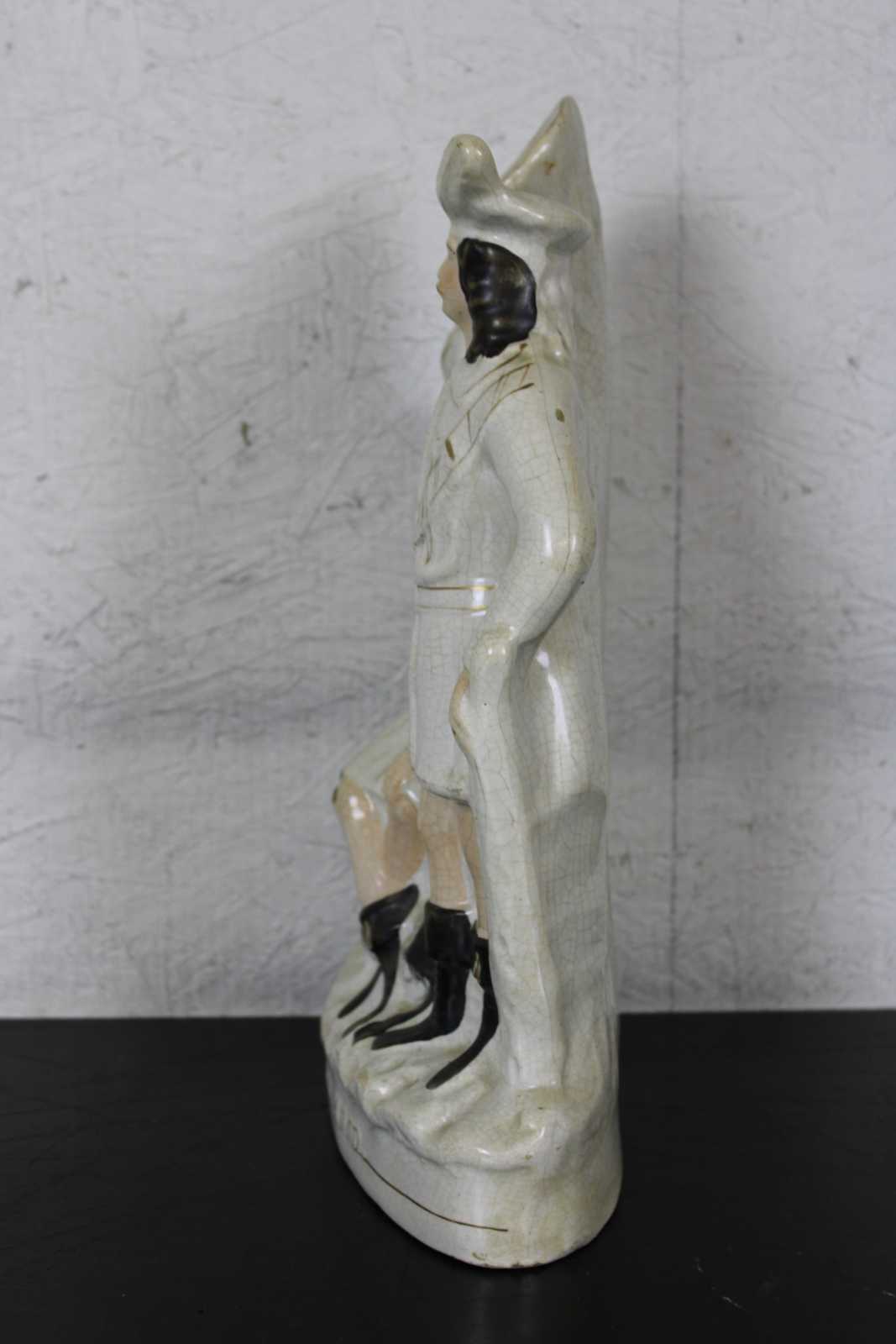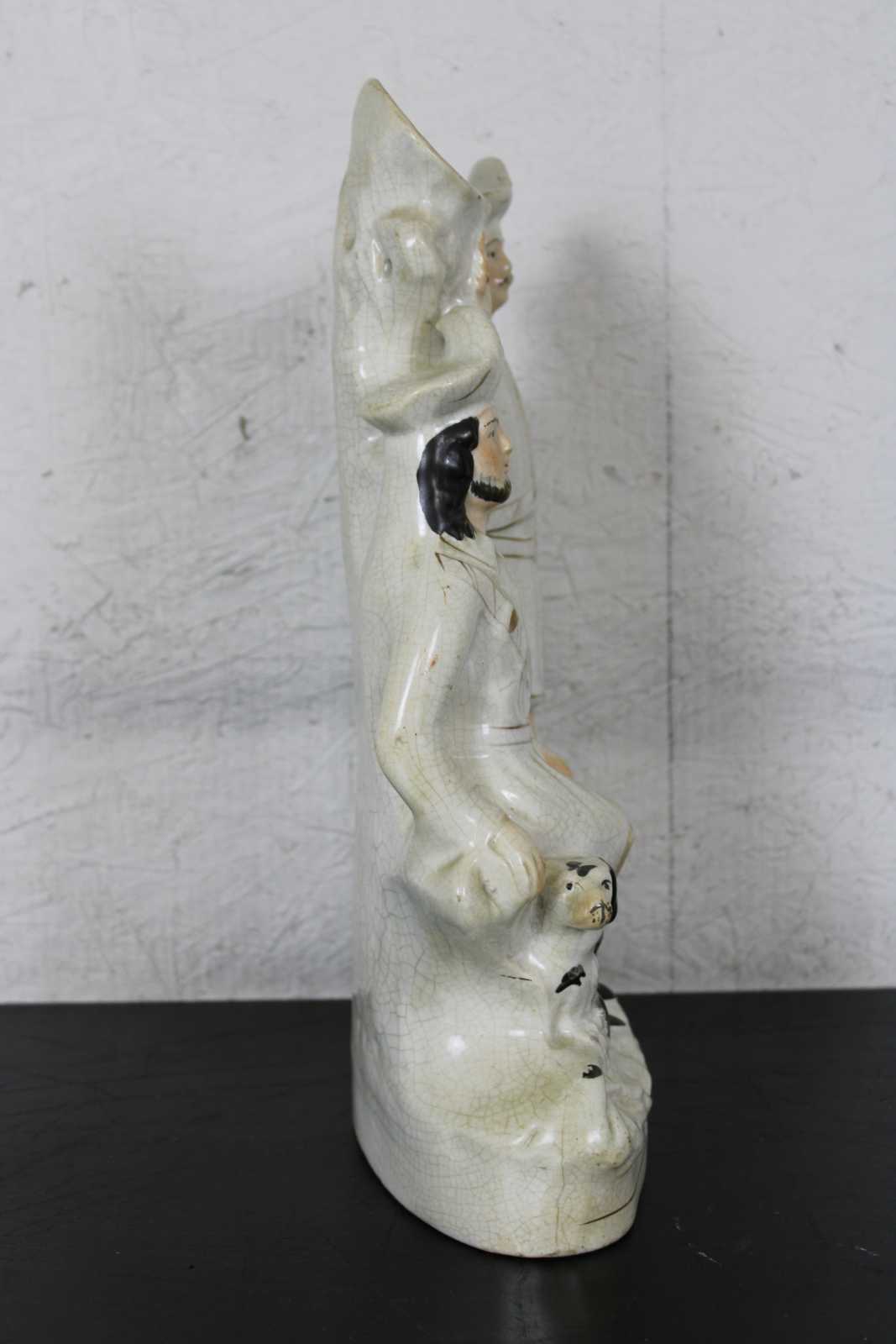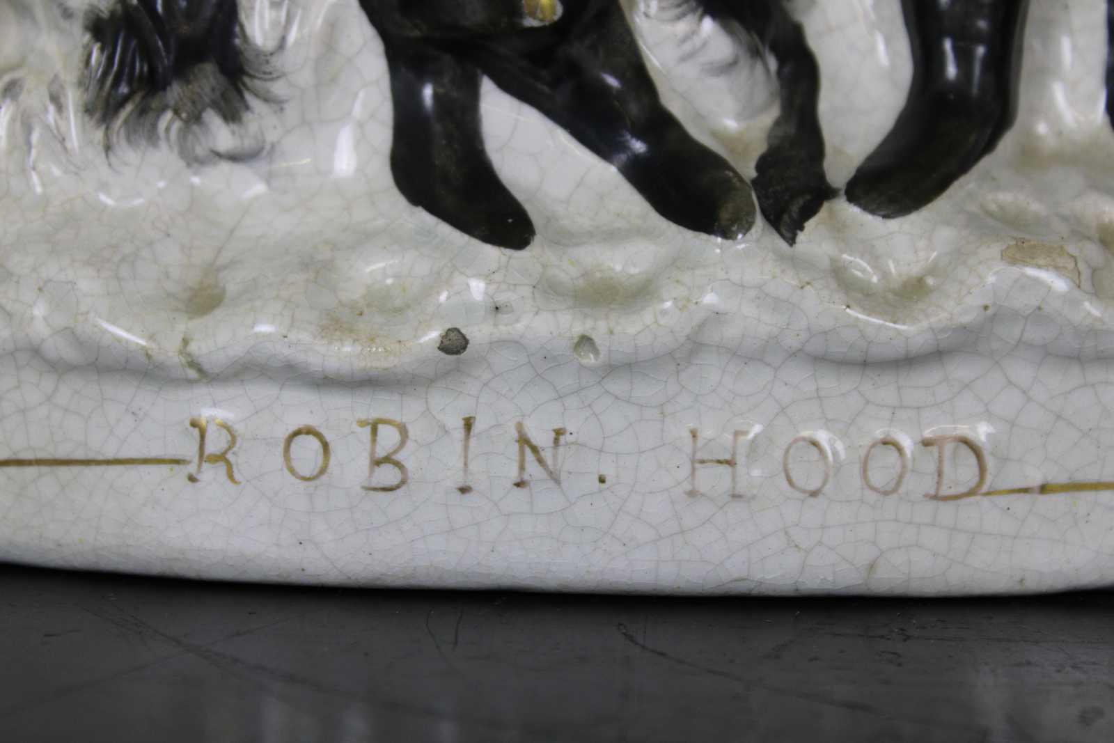 Circa mid 19th century antique Staffordshire English porcelain spill flower vase sculpture showing the folk heroes Robin Hood and Little John with a dog.