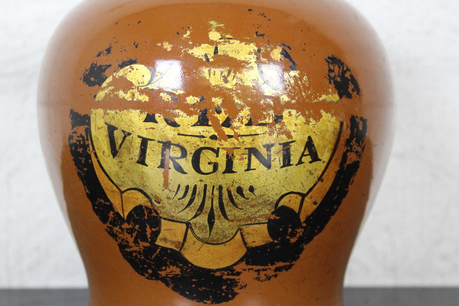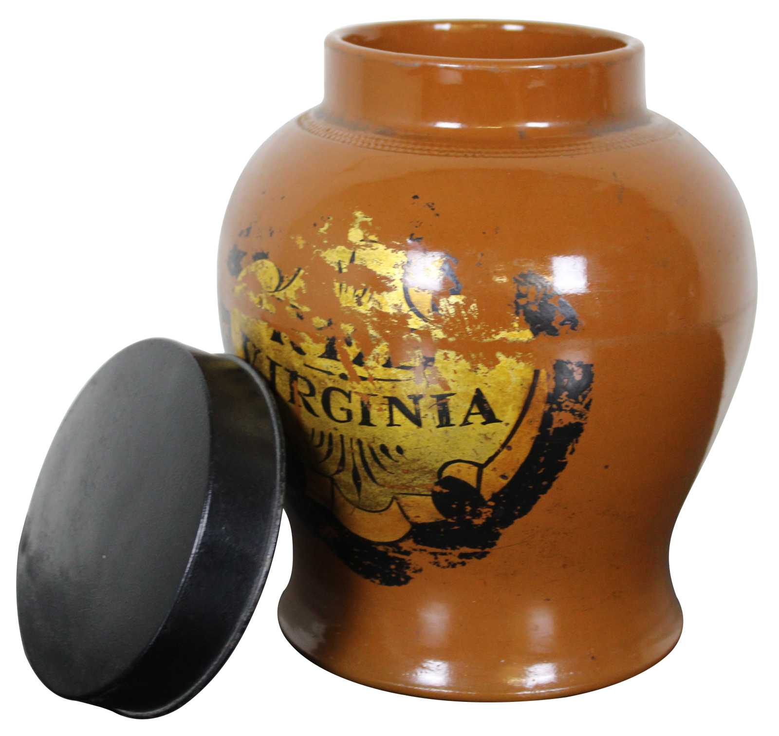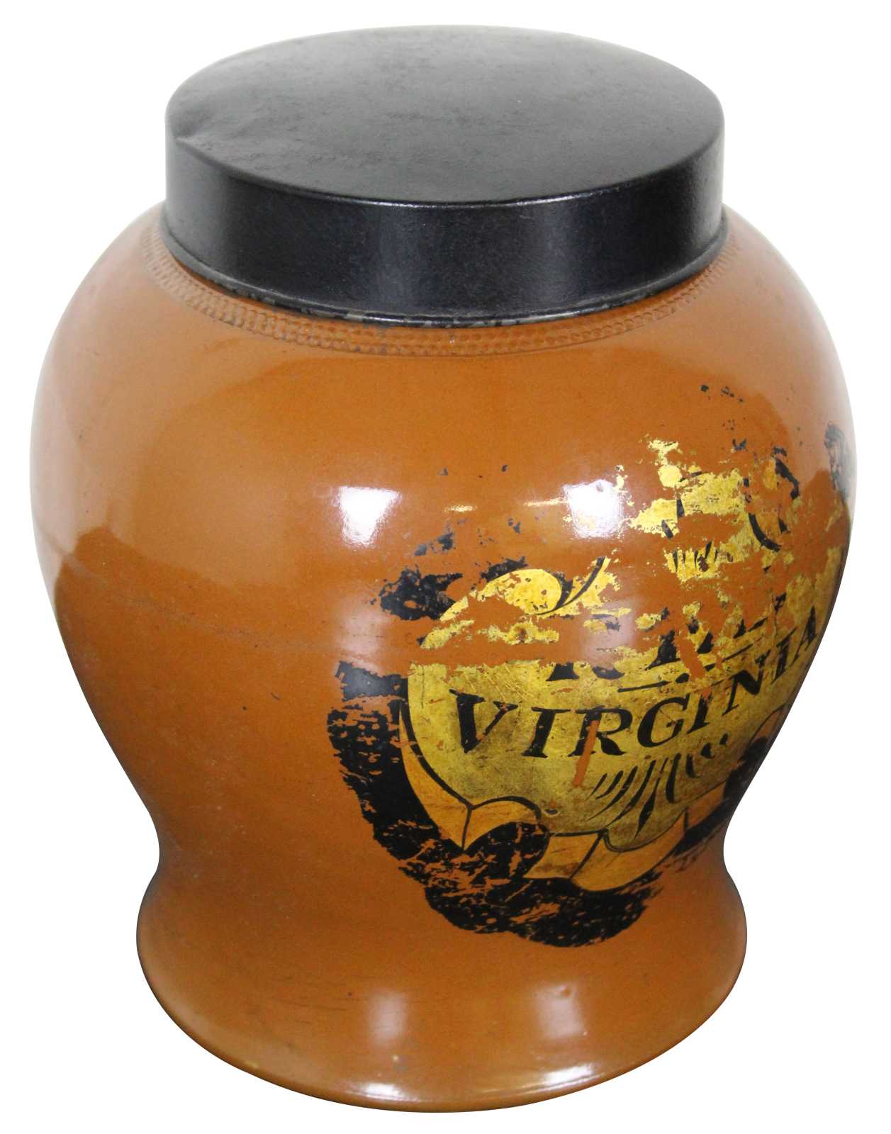 Rare antique English Victorian apotheary tobacco jar / tea caddy produced by H. F. & S London, in an orange-brown glazed pottery with Virginia on the front, and a black metal lid.