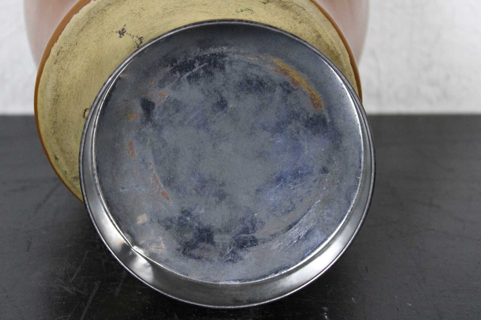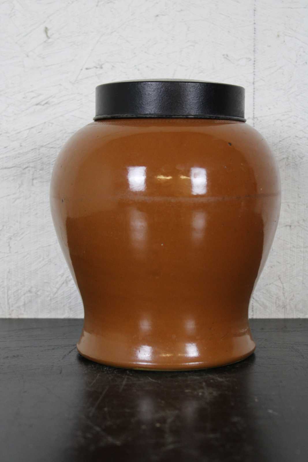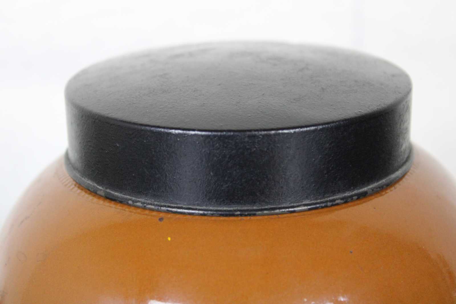 Rare antique English Victorian apotheary tobacco jar / tea caddy produced by H. F. & S London, in an orange-brown glazed pottery with Virginia on the front, and a black metal lid.