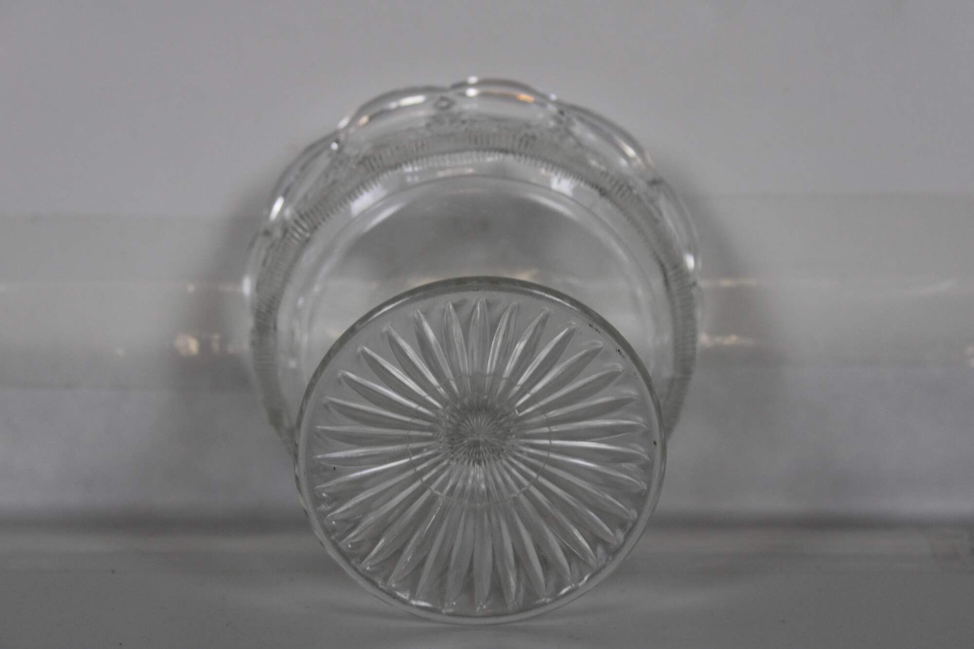 Vintage pressed glass footed compote dish, cup or bowl with Neoclasical styling and goblet form featuring scalloped edge and an elegant diamond and swag pattern along the sides.