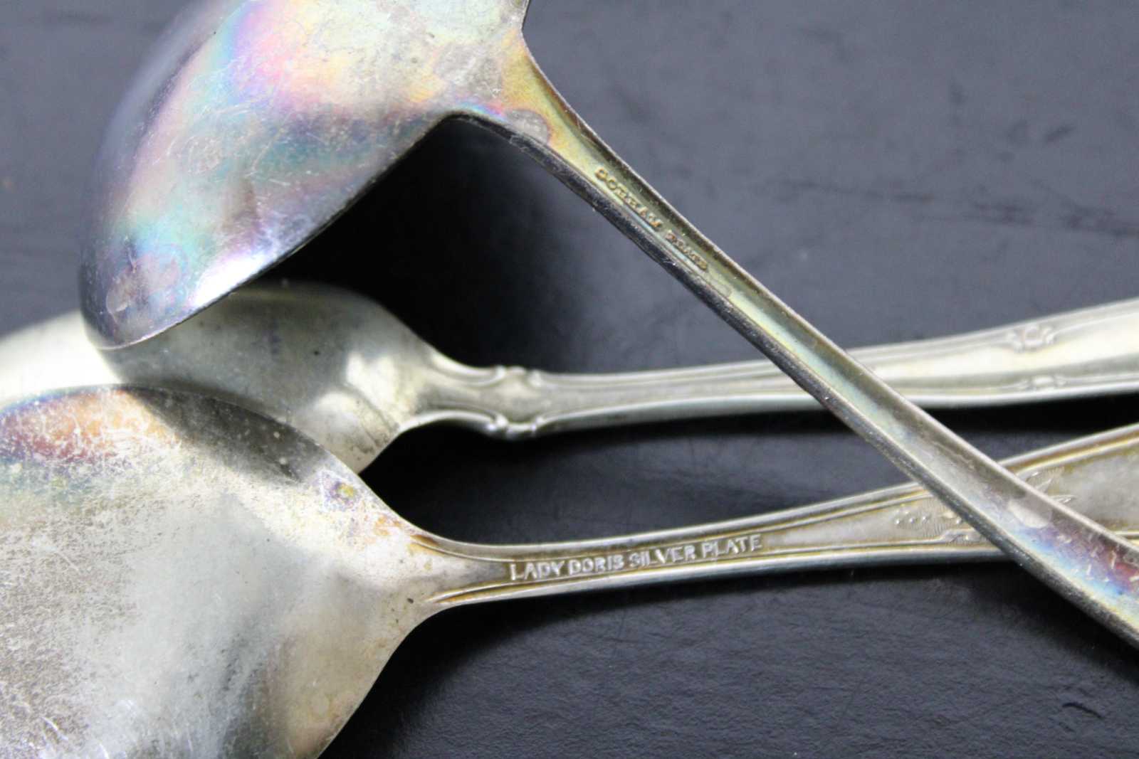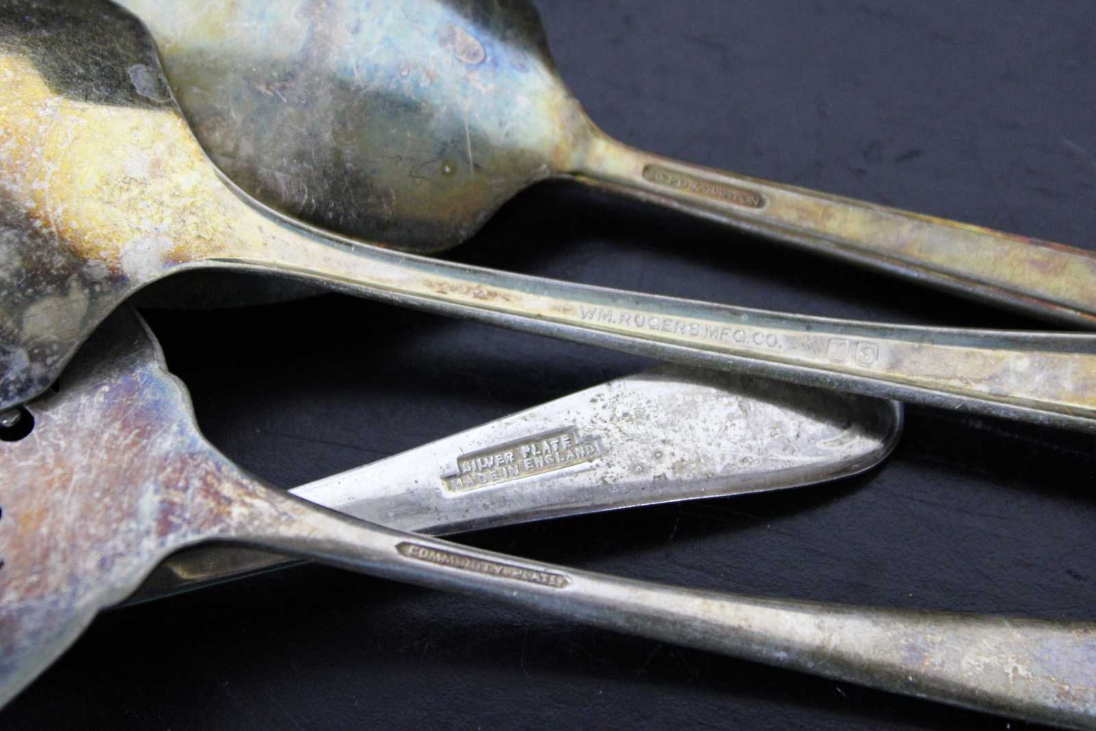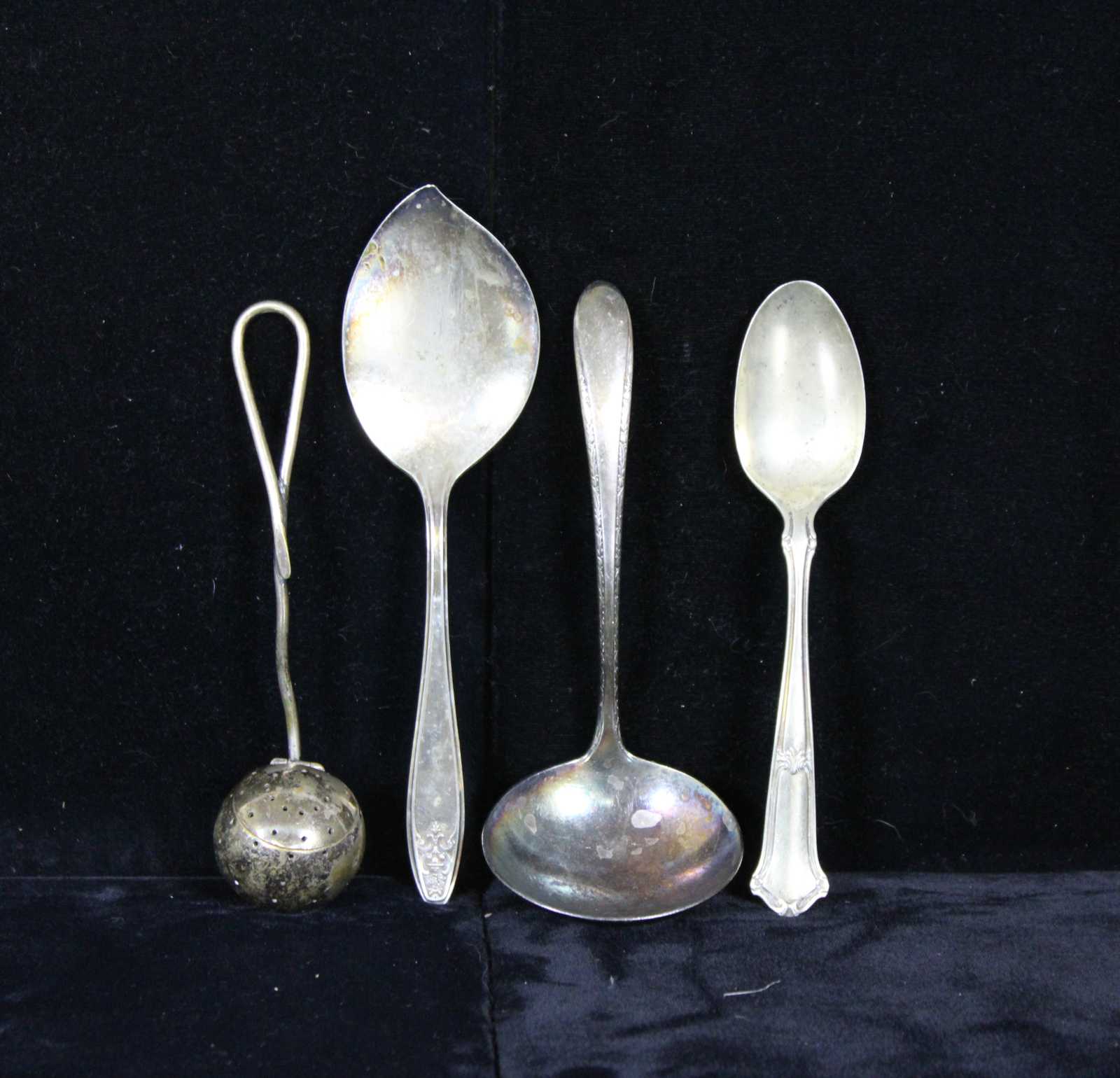 Antique lot of 12 assorted silver plate plus 2 sterling silver serving utensils by a variety of manufacturers including Reed & Barton, Community, and William Rogers. Lot includes a tea spoon, butter knife, slotted casserole spoon, 2 serving forks, 2 casserole spoons, a pair of salad tossers, cake knife, tomato server, ladle, tea strainer, and a pickle fork.
