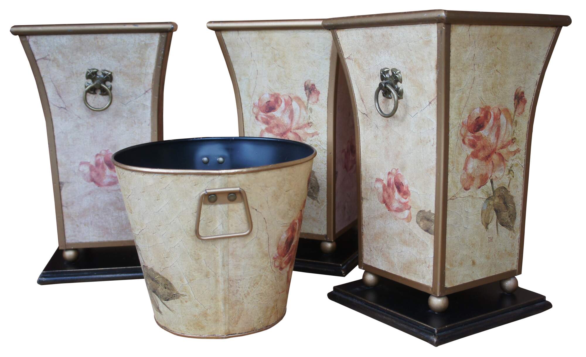 Lot of 4 waste baskets or bins depicting a rose/floral motif, three with fluted square forms and one cylindrical form.